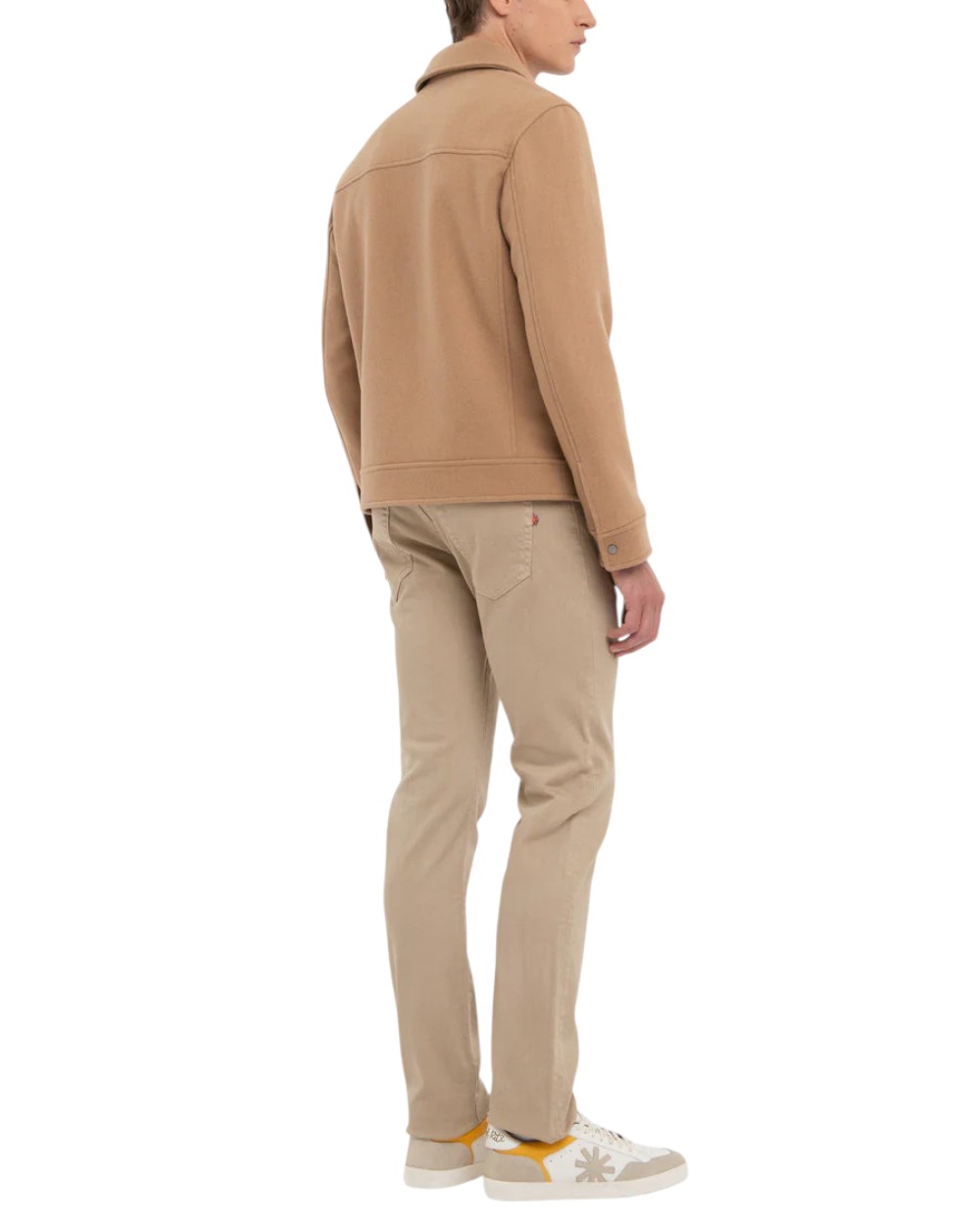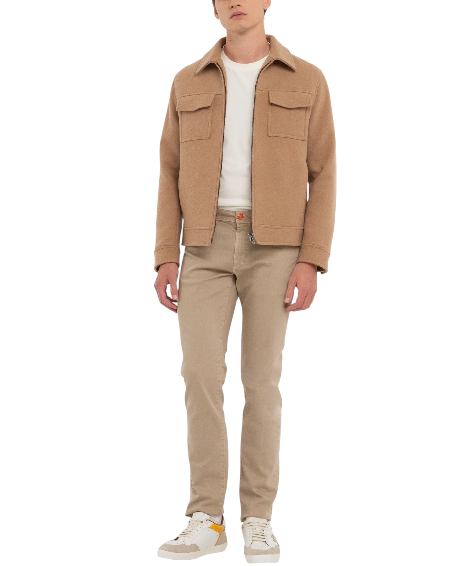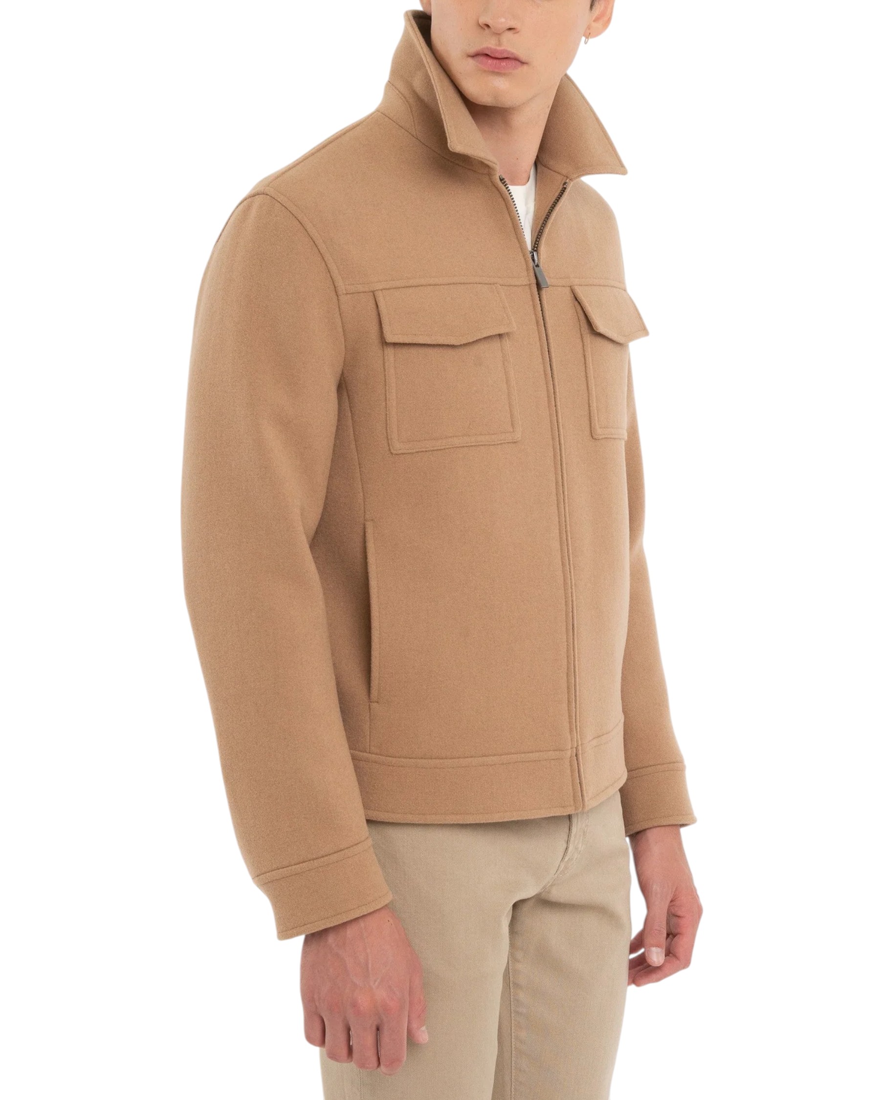 Men's jacket by Manuel Ritz, made from warm camel-coloured fabric that combines elegance and practicality. The minimalist design, inspired by overshirts, features a front zip fastening and two flap pockets on the chest, adding a functional and contemporary touch. The classic collar and clean lines make it a versatile choice, perfect for both leisure and more formal looks. A refined and timeless garment, ideal for facing the season in style.