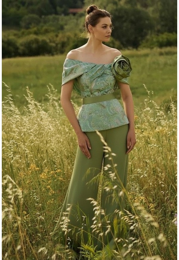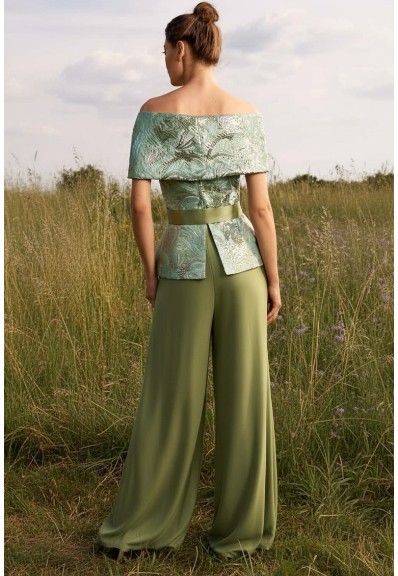 A feminine and versatile outfit, perfect for special occasions or for a sophisticated daytime look, combining the richness of damask with the lightness and comfort of wide-leg trousers. The flowing line slims the figure, while the delicate green shade adds a fresh and sophisticated touch to the ensemble.