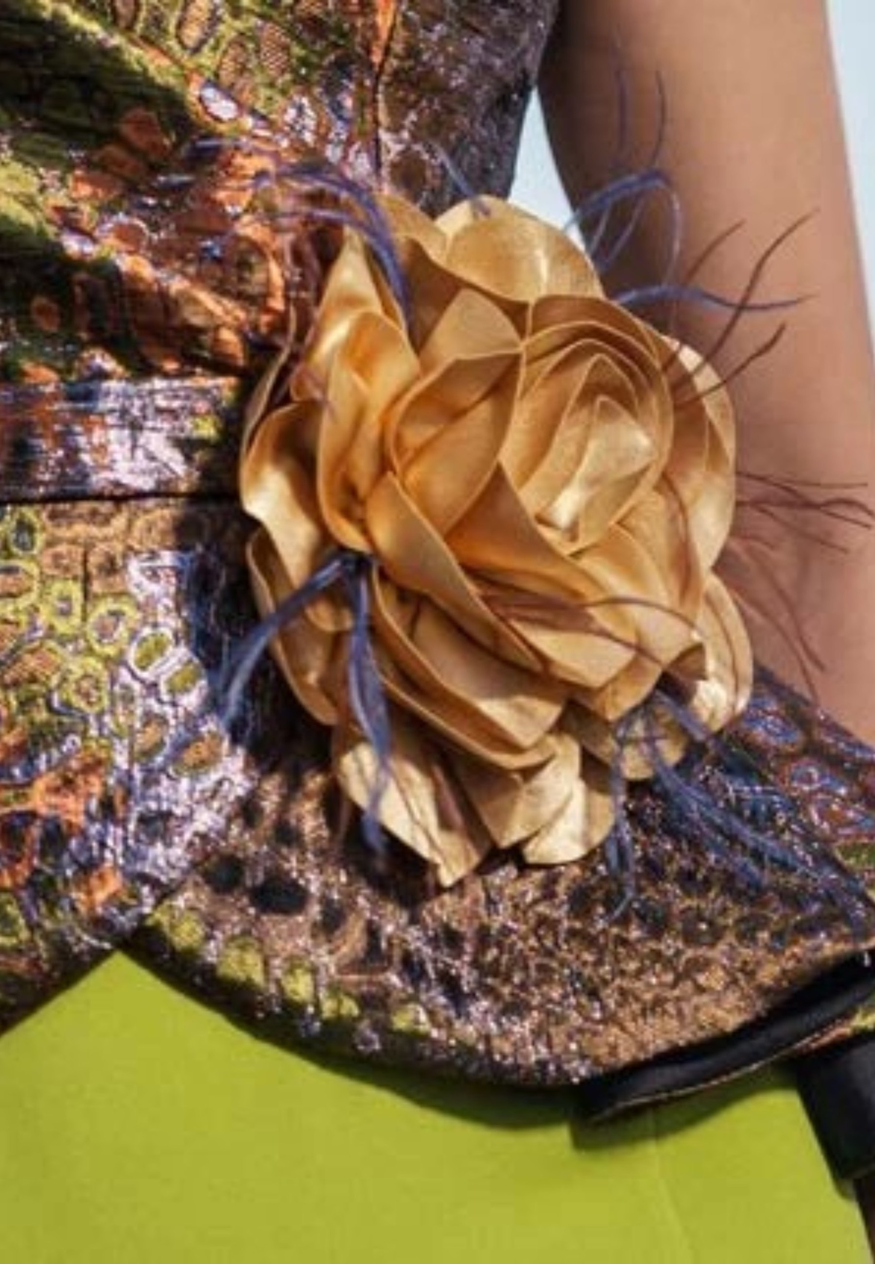This coordinated outfit plays with harmonious contrasts: the multicoloured micro-patterned shaved fabric bodice gives liveliness and character, defined at the waist by an elegant strap with a flower brooch enriched by a refined feather detail. Completing the look is a plain-coloured mermaid skirt that slims the figure with understated elegance. A perfect mix of style, colour and contemporary femininity.