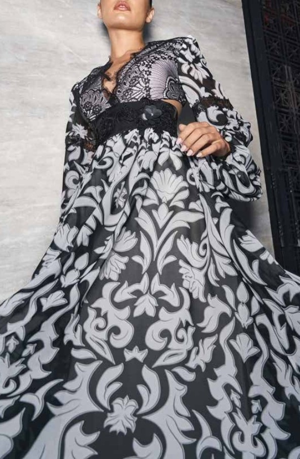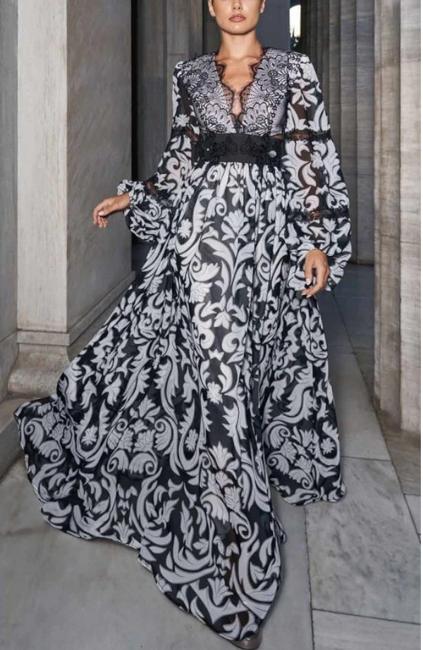 Long dress embellished with a refined baroque pattern in shades of black and white, perfect for those who want an elegant look with a strong visual impact.
