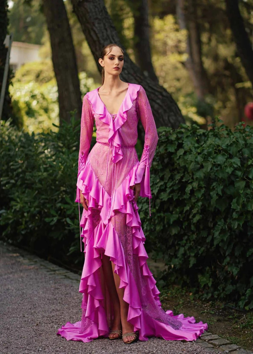 A long dress with a striking look, featuring a design rich in layered ruffles that run the entire length, adding movement and lightness with every step.