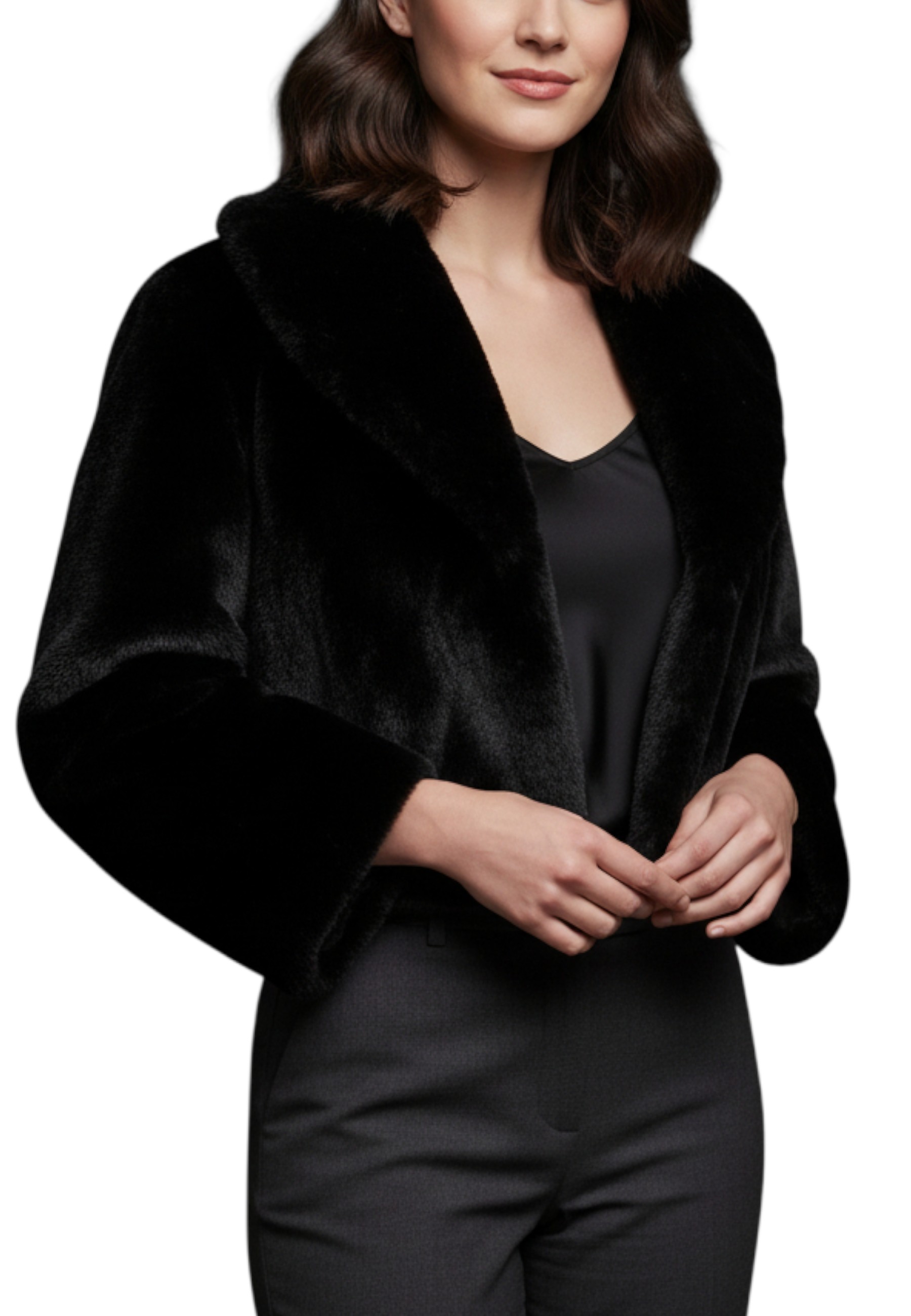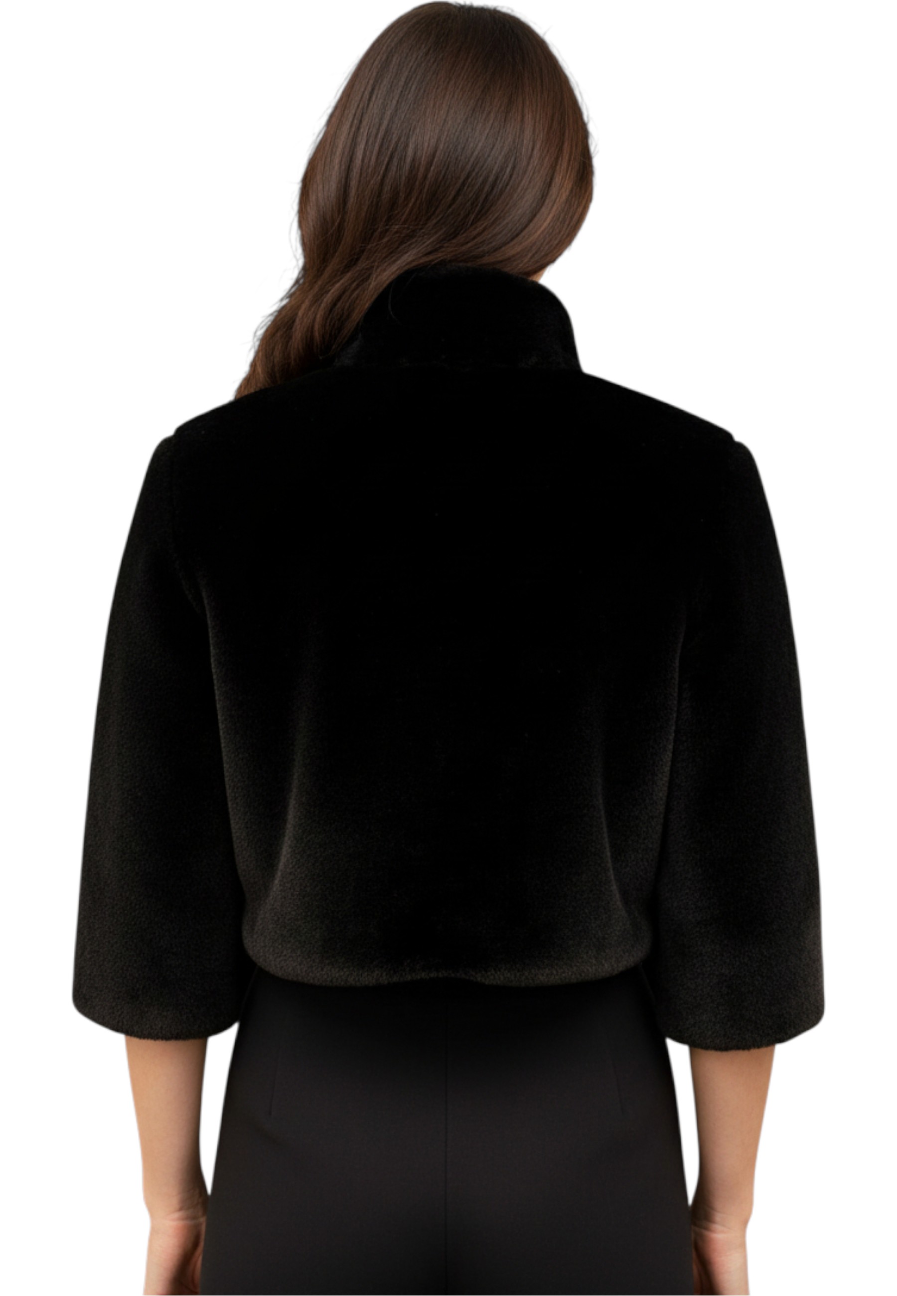 Short solid-coloured faux fur coat with shawl collar and 3/4 sleeve.