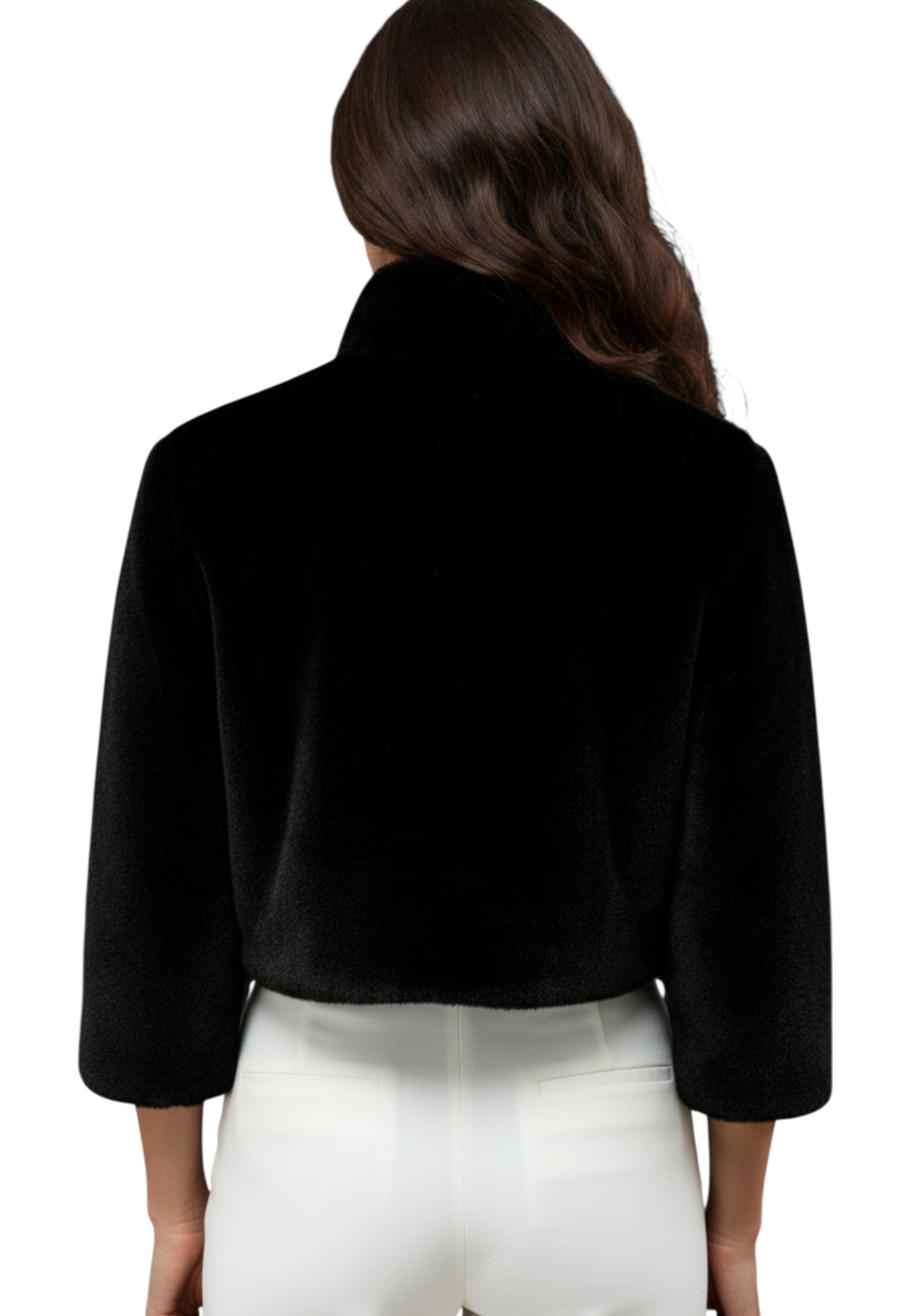 Plain-coloured short faux fur coat with runner collar and 3/4 sleeve.