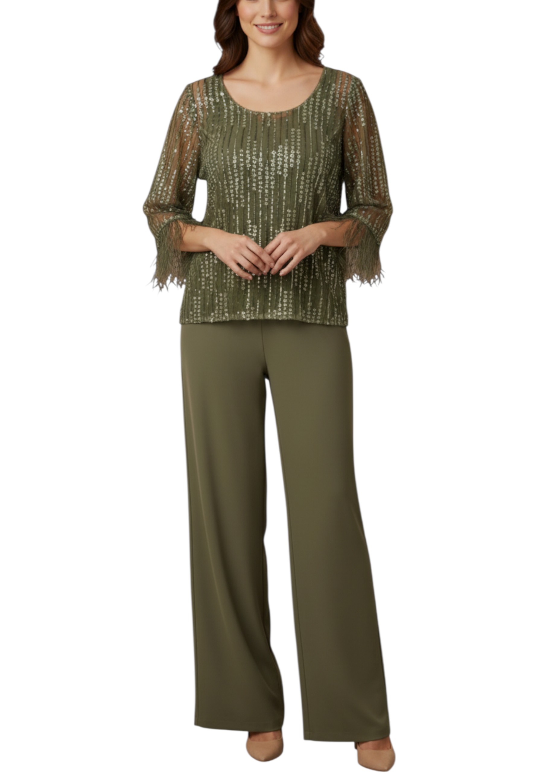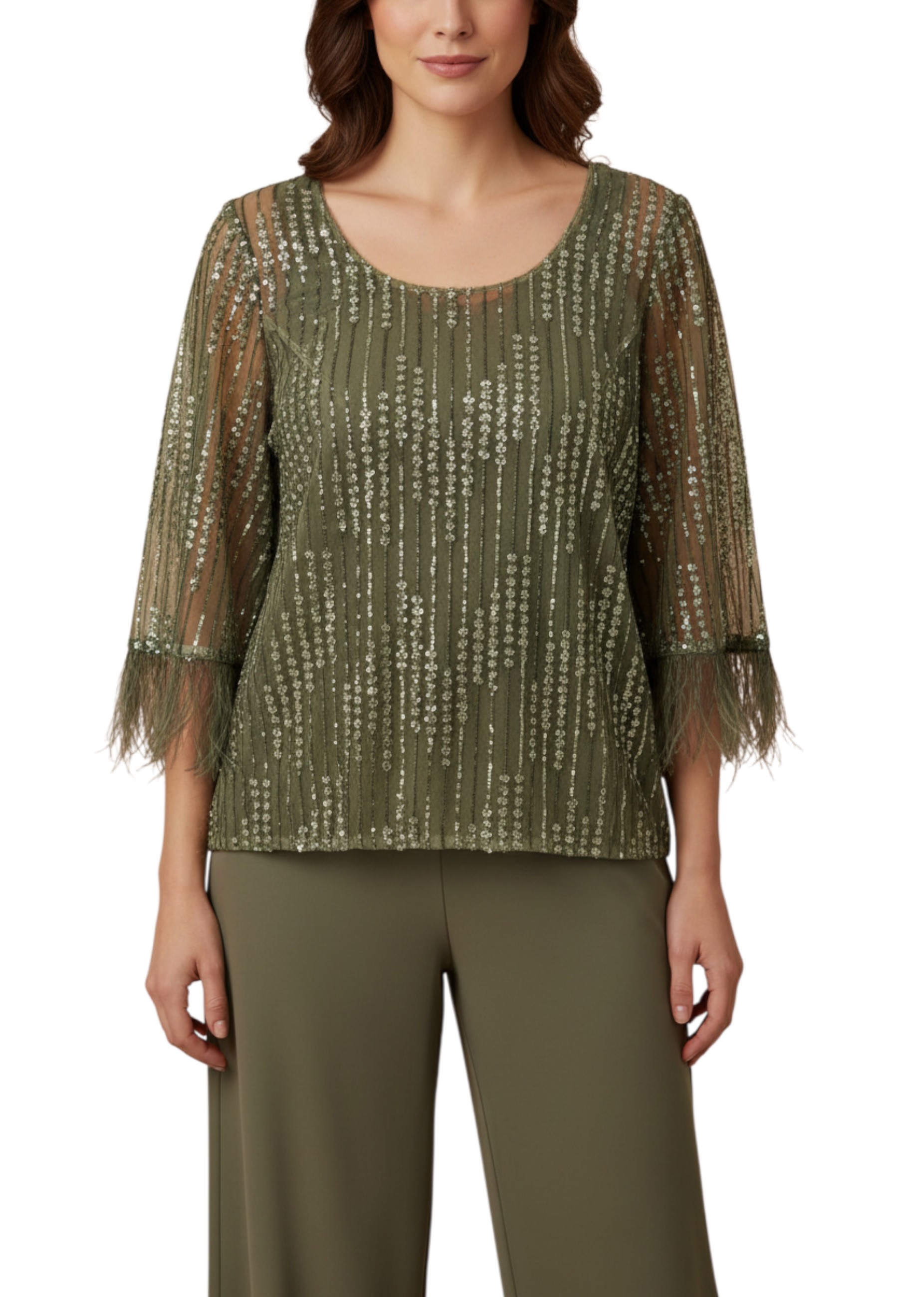 Elegant and sophisticated, this curvy coordinated set consisting of a tunic and pants is the perfect choice for those who want a refined yet comfortable look. The tunic, with sleeves embellished with feather trim, adds a touch of glamour and drama, enhancing the outfit with style and personality.