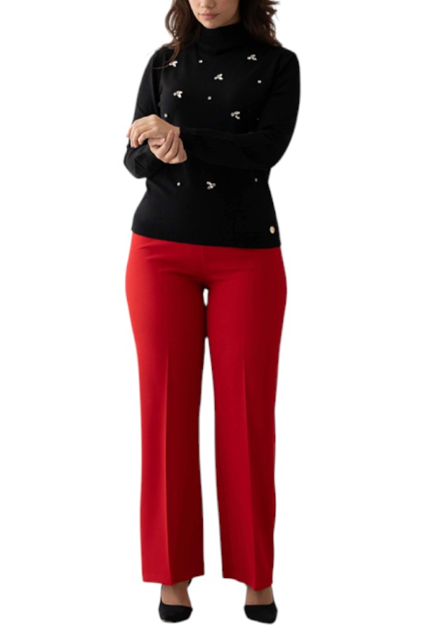The high-neck jumper with jewelled appliqués is a sophisticated garment that combines elegance and comfort. Made from a soft, stretchy fabric, it envelops the figure with a fluid, feminine silhouette. The high neck adds a refined touch, while the delicate jewelled appliqués illuminate the design with discreet elegance. Perfect for adding a touch of style to everyday looks or embellishing an evening outfit, this jumper stands out for its versatility and attention to detail, transforming every occasion into a moment of light and charm.