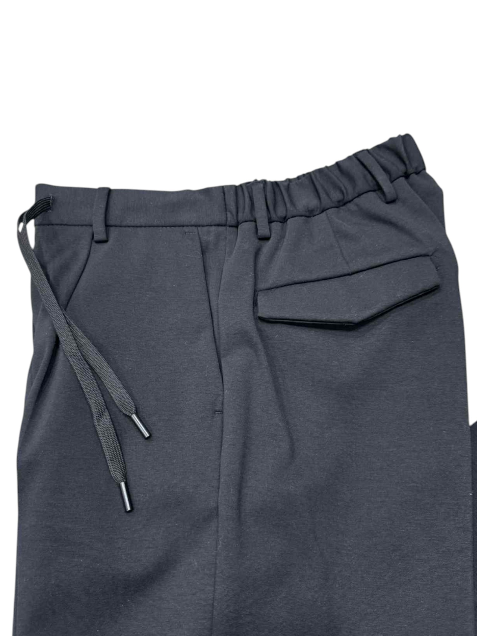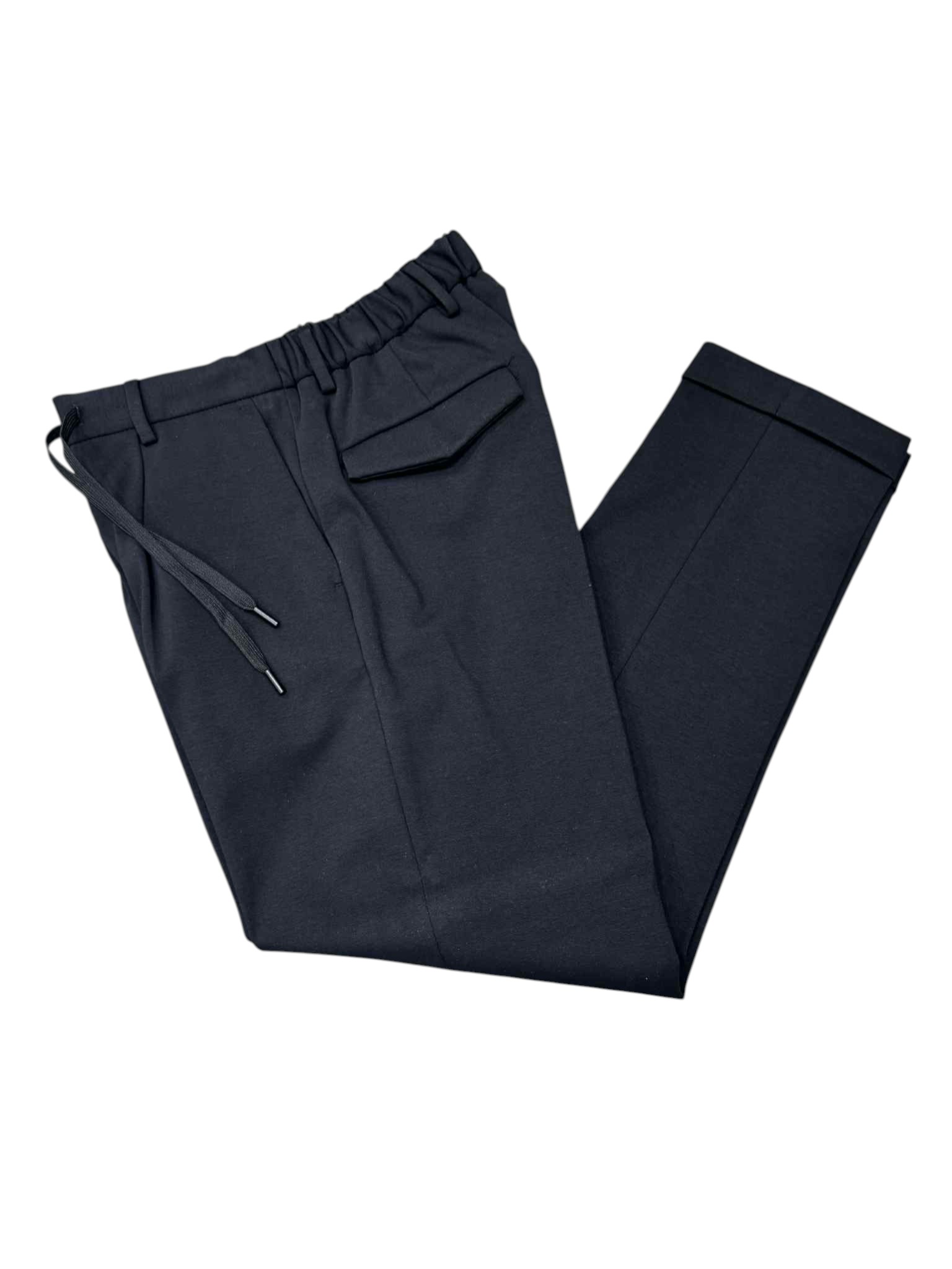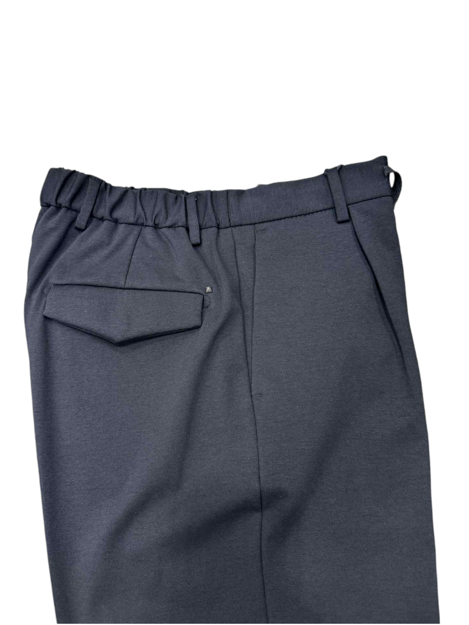 Comfort and style come together in these casual yet detailed trousers. Featuring a practical drawstring waist, they ensure a comfortable and adjustable fit. The back pockets with flaps add a functional and refined touch, perfect for completing both informal and more sophisticated looks.