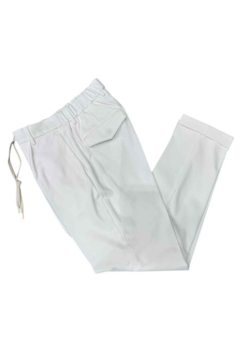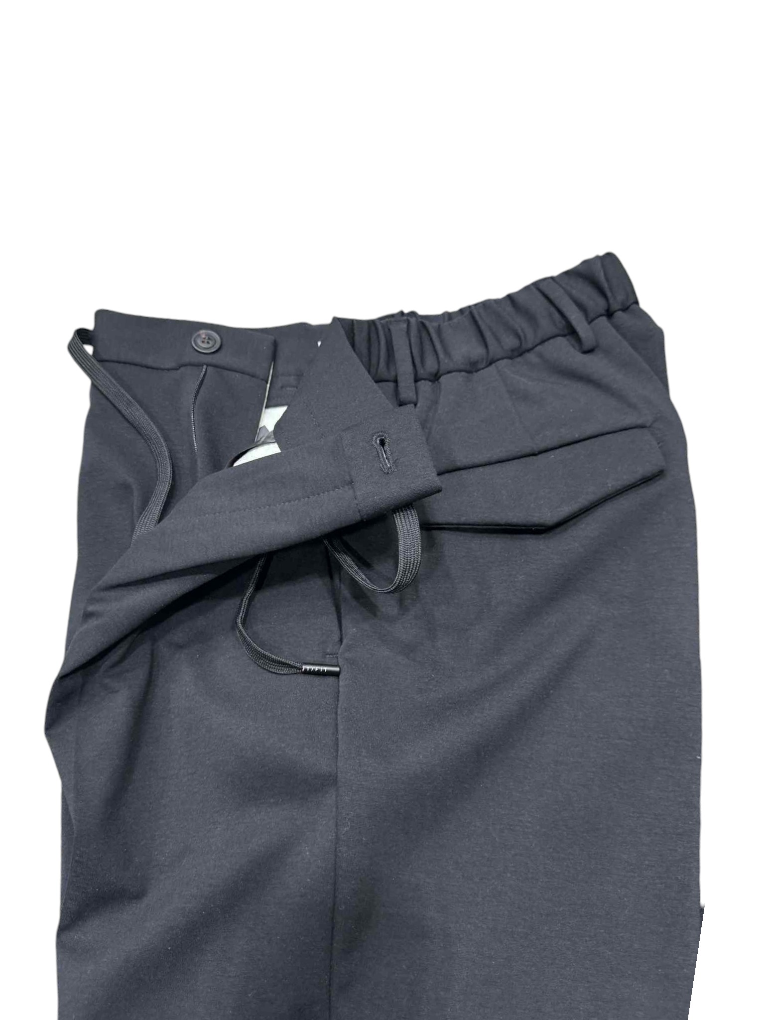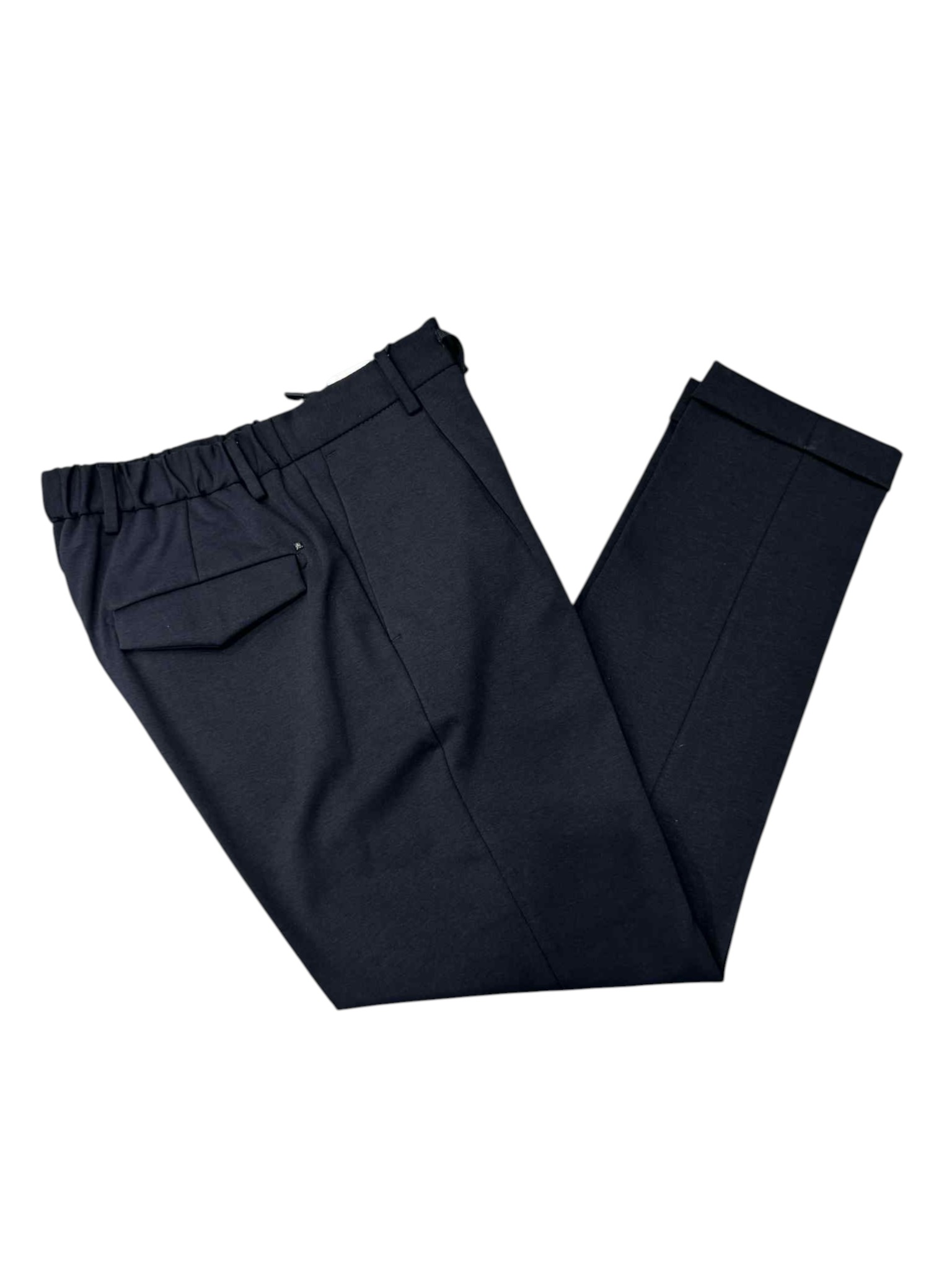 Comfort and style come together in these casual yet detailed trousers. Featuring a practical drawstring waist, they ensure a comfortable and adjustable fit. The back pockets with flaps add a functional and refined touch, perfect for completing both informal and more sophisticated looks.