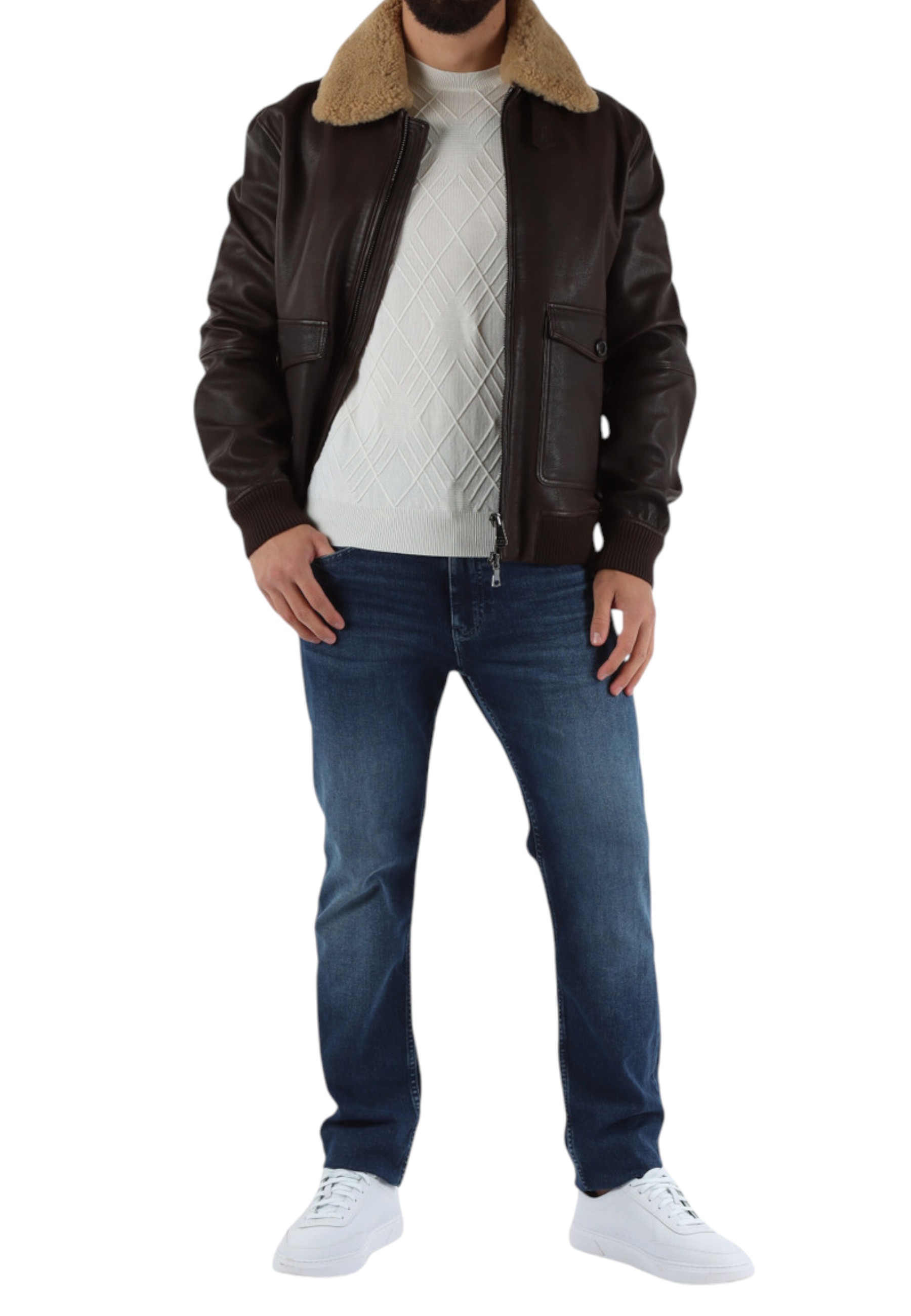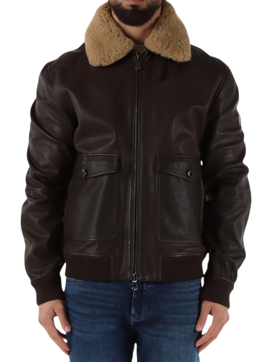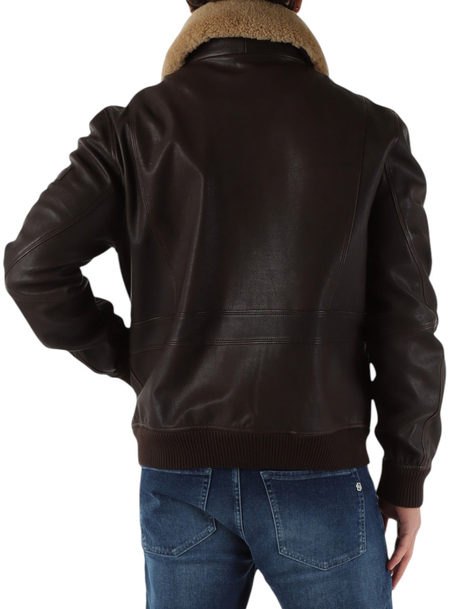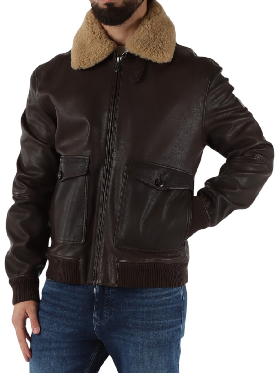 Round-neck leather bomber jacket with fur collar, designed for those seeking a contemporary and refined style. Made from high-quality leather, this garment combines the softness of the material with the bold structure of the regular fit. The fur collar adds a touch of elegance and comfort, while the ribbed cuffs and hem ensure a perfect fit and clean lines. The discreet and functional front zip fastening completes the essential design of a timeless garment, ideal for a casual yet sophisticated look.