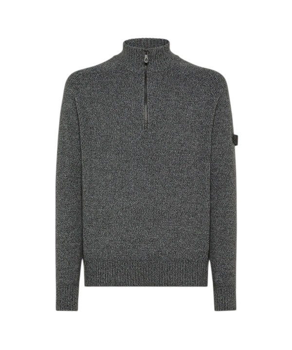 Sweater with stand-up collar and half zip, made from mouliné wool blend tricot. The refined melange effect of the yarn gives depth of colour and a sophisticated look. Details such as the ribbed collar, cuffs and hem enhance the construction of the garment and emphasise its comfortable fit. The Peuterey trilogy logo, the brand's iconic symbol, is discreetly applied with two small buttons on the left sleeve. A model with a bold and versatile design that will be appreciated in this season's men's wardrobe.