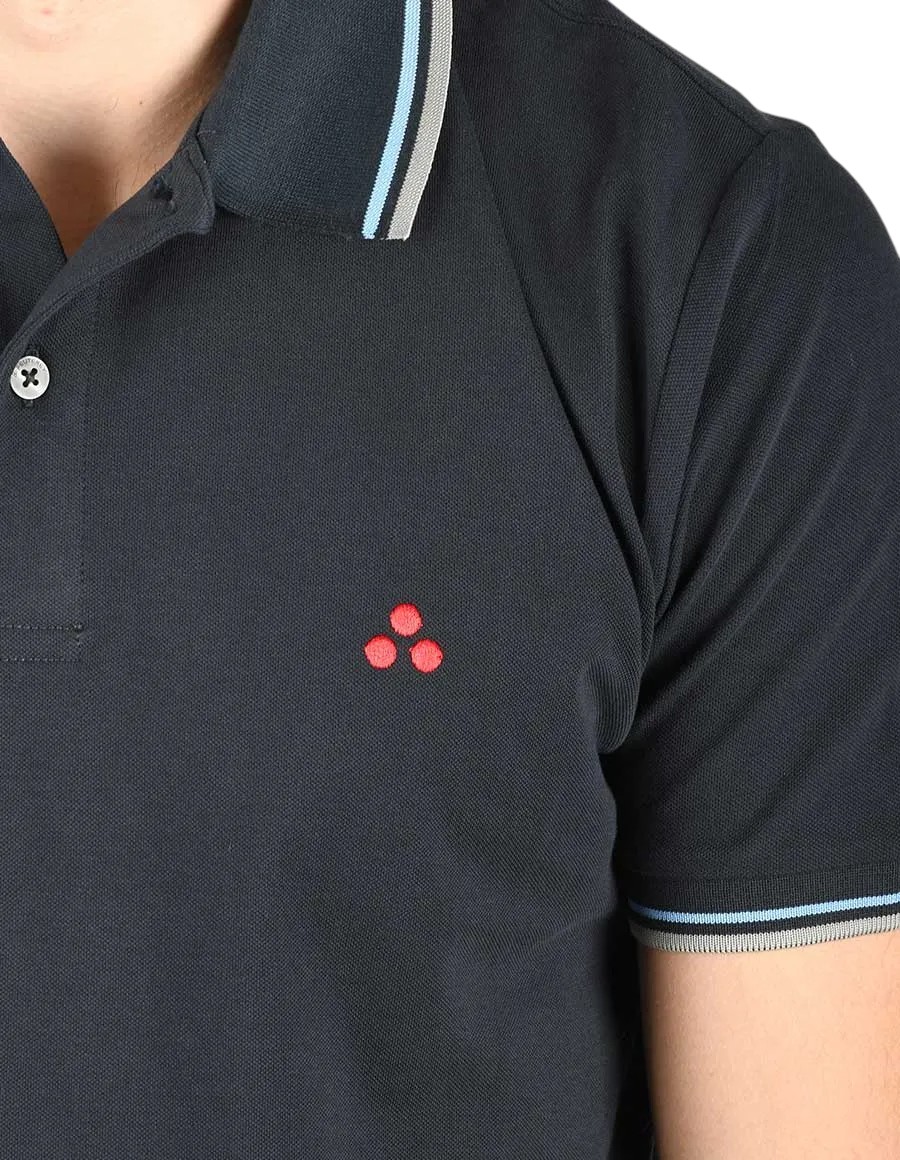 Short-sleeved polo shirt in stretch cotton, piece-dyed. The collar and sleeves are enhanced with stripes in a contrasting color. Regular fit and logo embroidered on the front. Modern look for an evergreen garment suitable for hot summer days