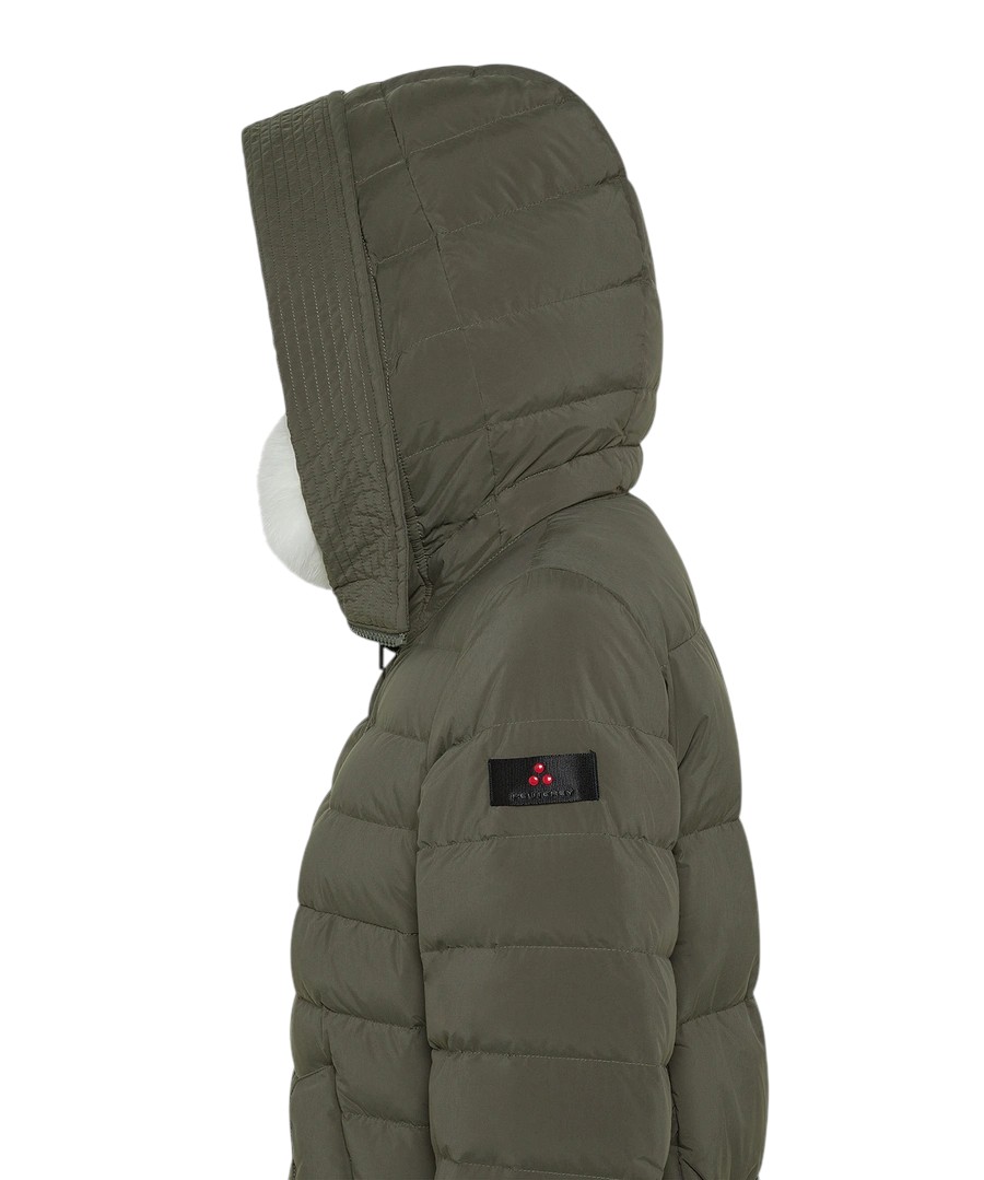 Quilted down jacket in natural down, lightweight nylon and polyester microfibre which, thanks to the 130°C dyeing temperature, is modified to acquire a structured feel and a powdery touch. The final silicone treatment makes the fabric extremely soft. Full central zip with double slider, large side pockets and collar with fox fur in a colour matching the garment. The model allows for multiple combinations and accompanies different occasions with impeccable style. Water-repellent.