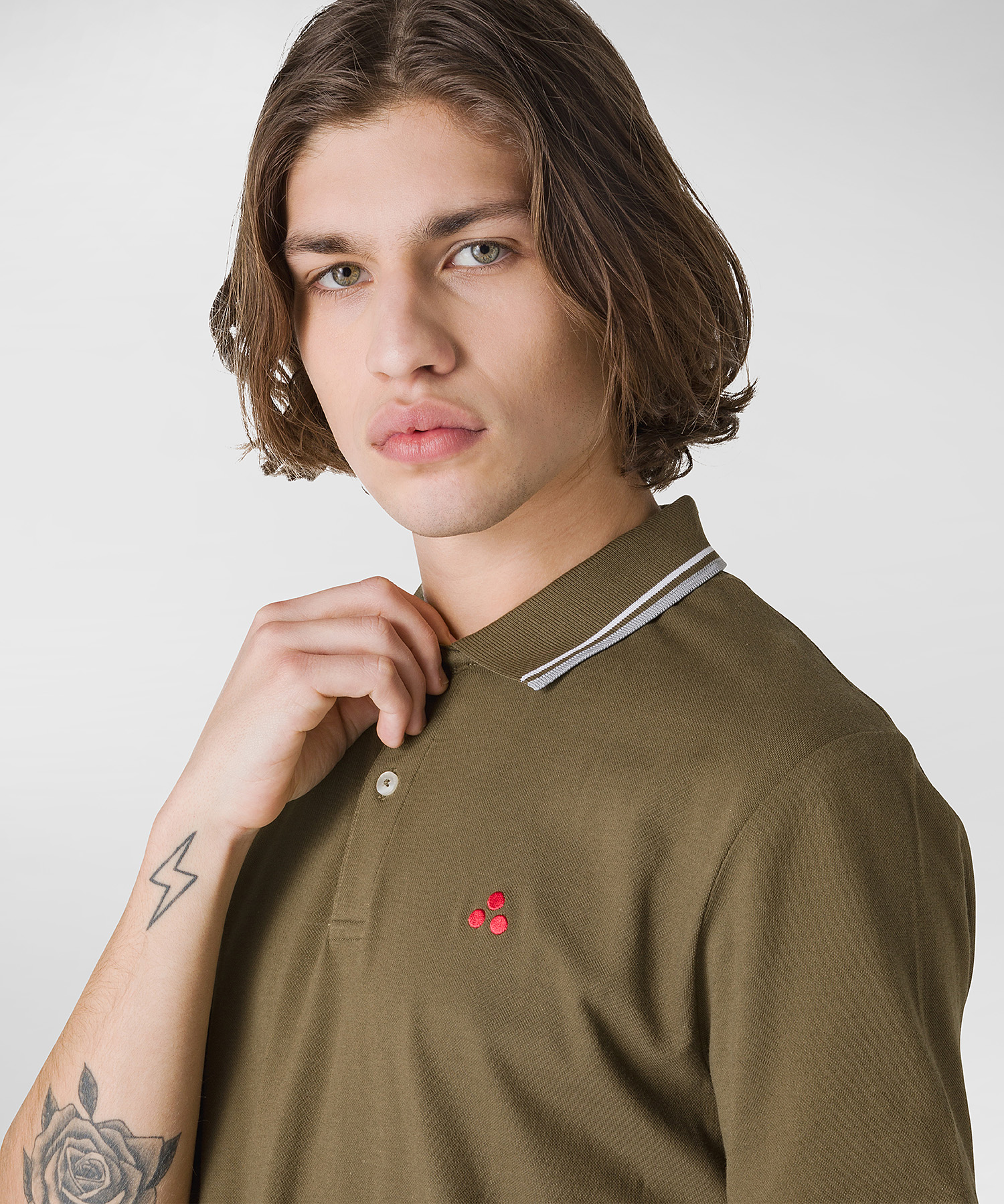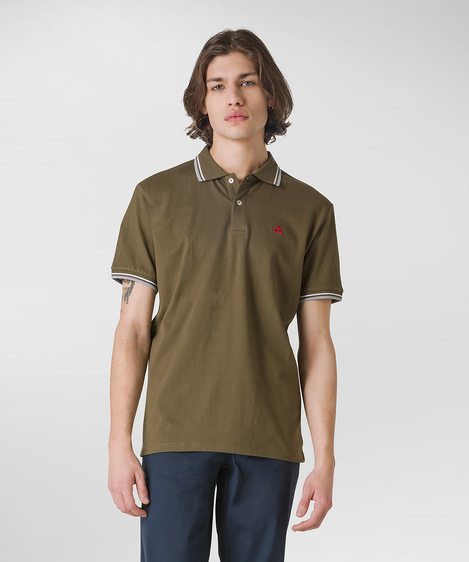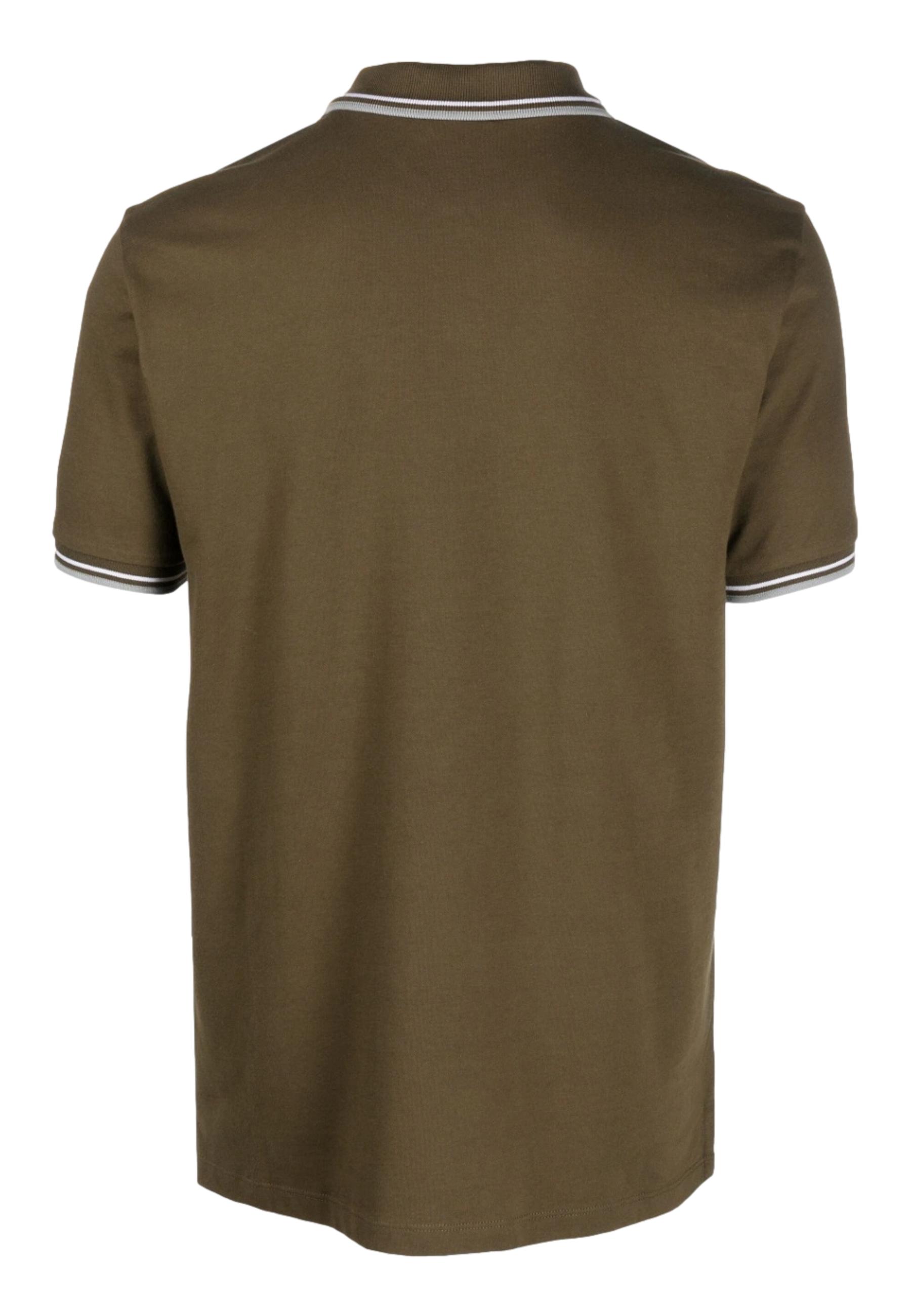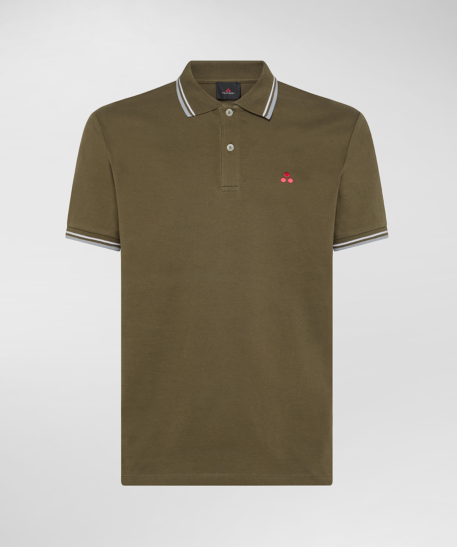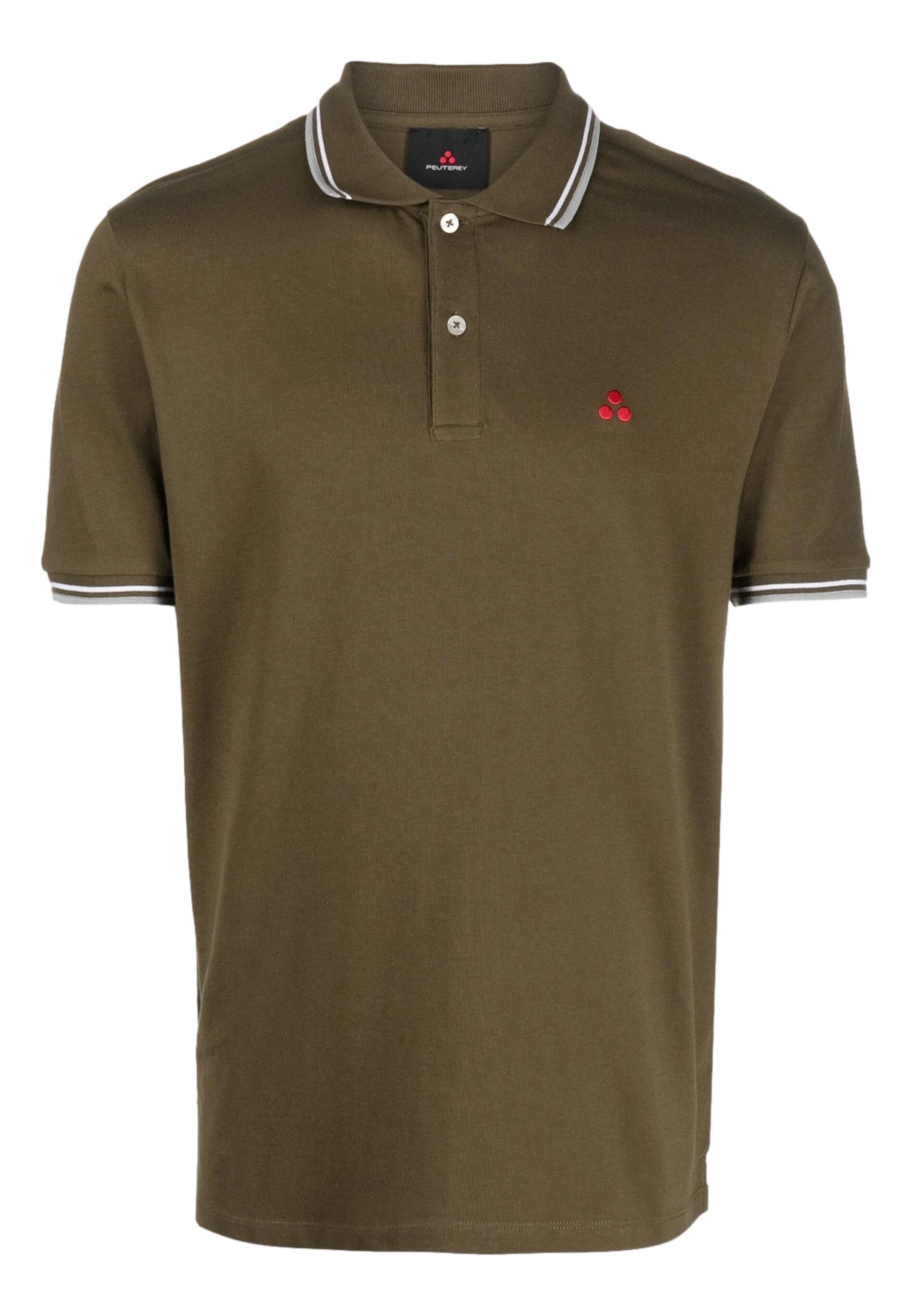 logo embroidered polo shirt from PEUTEREY featuring olive brown, stretch-cotton, piqué weave, embroidered logo at the chest, striped tipping, polo collar, short front button fastening, ribbed cuffs, short sleeves and straight hem.