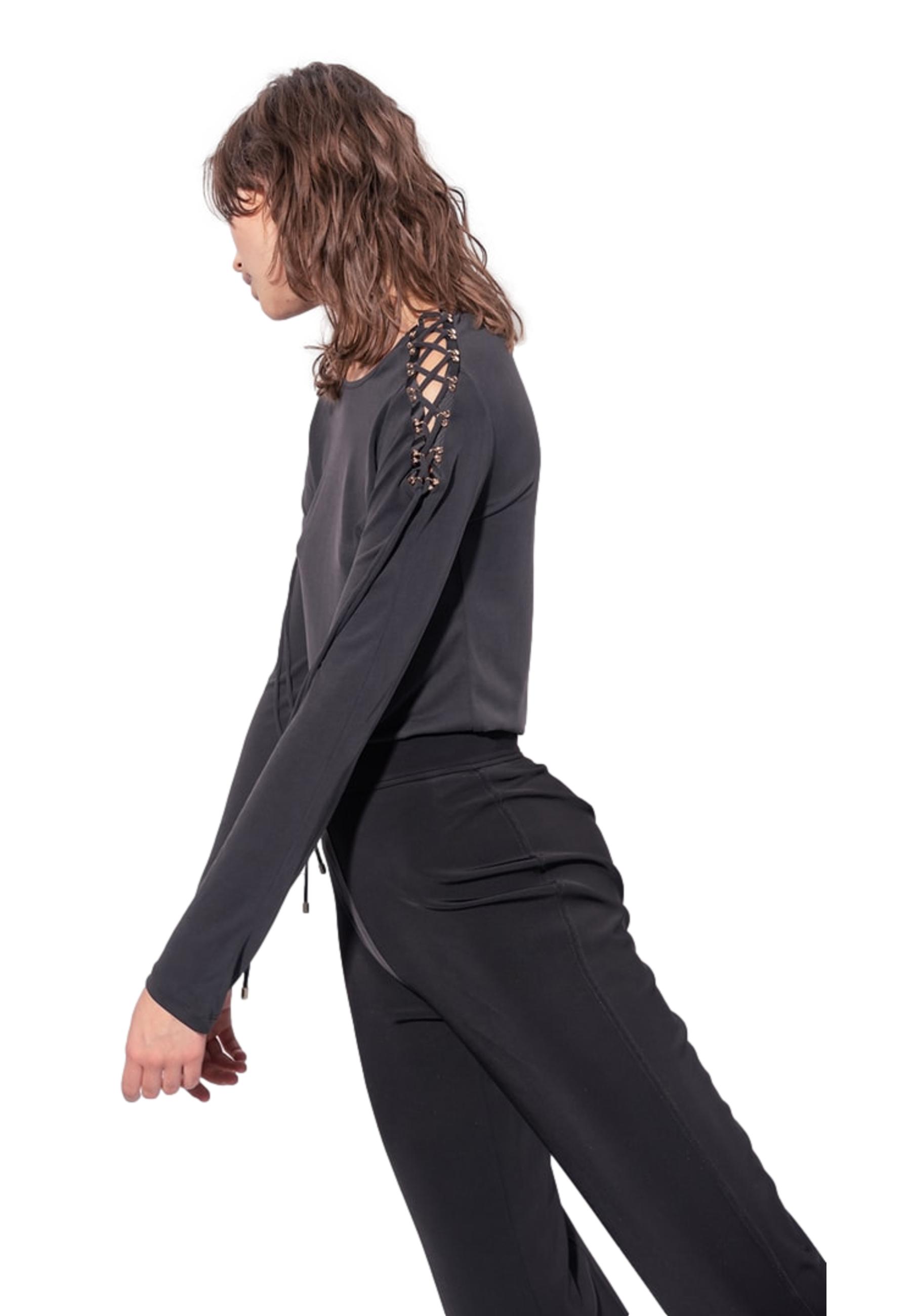 Flare-fit pants made of fluid viscose technical fabric with neoprene effect. High waist and fitted leg with flared bottom. Invisible zipper closure in center back.