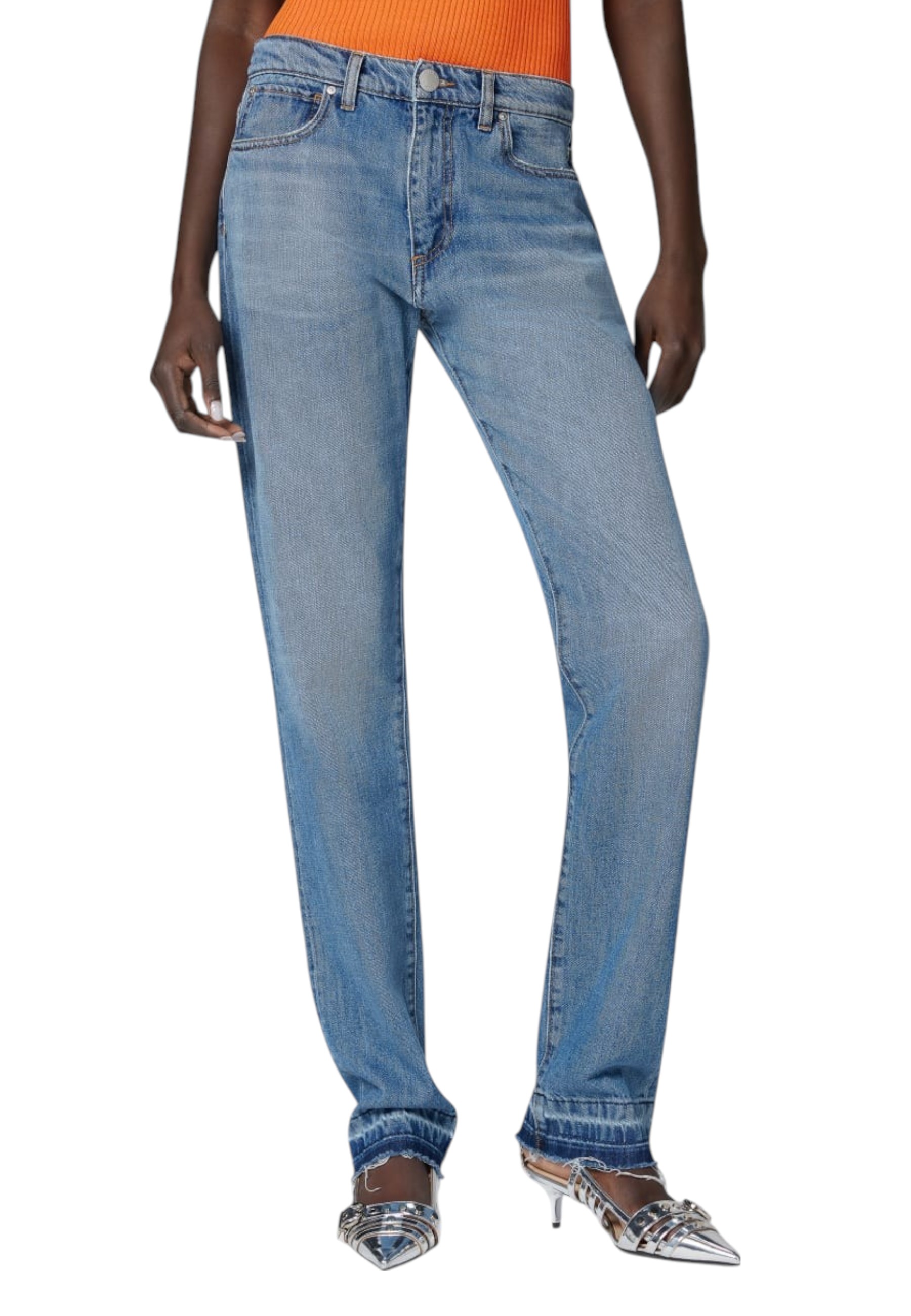 Classic straight-fit five-pocket jeans in vintage-washed cotton denim that gives the garment a timeless look, perfect for any occasion and any combination. The straight-fit jeans are characterised by a high waist and straight leg, with a darker-coloured, raw-cut hem with slight fraying. Zip and metal stud button fastening. You're always on the safe side with a pair of classic straight jeans. Dare your look by teaming them with a pair of metallic pumps.