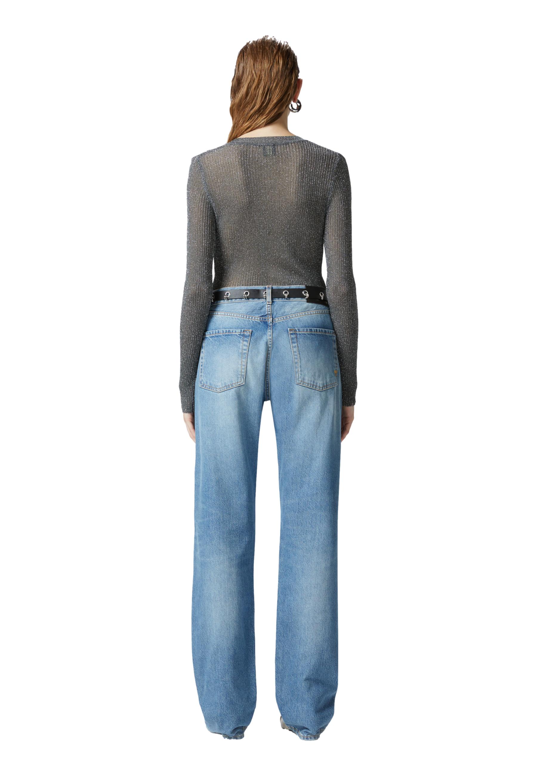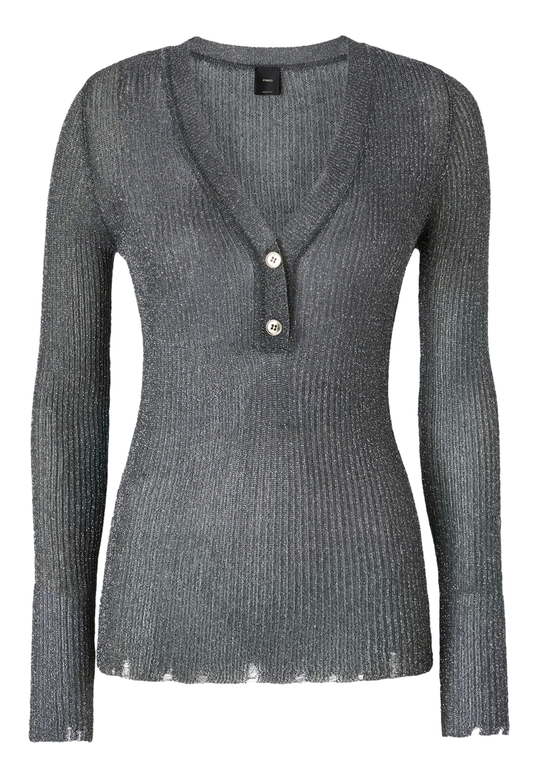 Long-sleeved sweater made of very light lurex yarn, which gives the garment a metallic, ribbed effect. The fitted line is complemented by a V-neck with double buttons and used effect at the bottom of the garment.