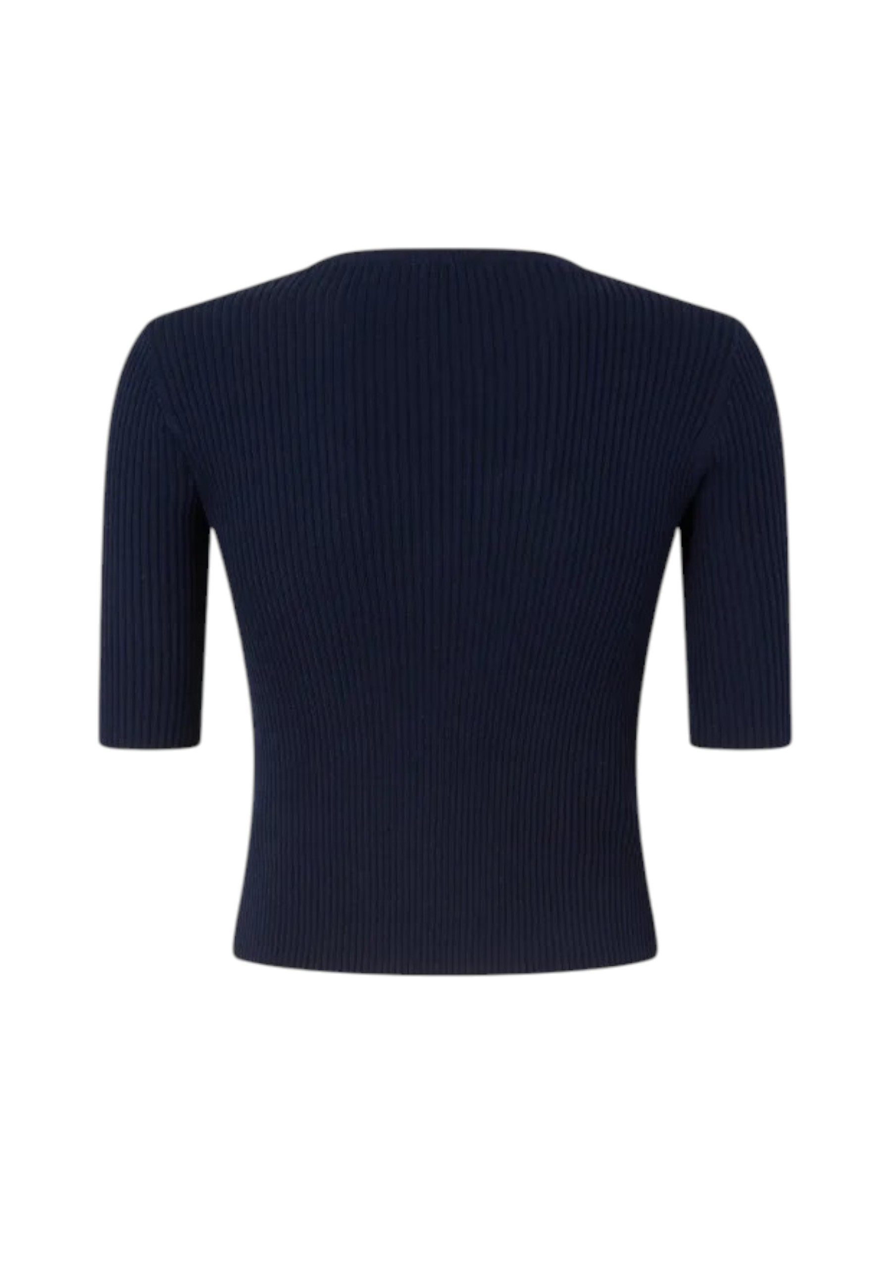 Tight-fitting half-sleeved sweater made of ribbed silk-cotton blend yarn. Personalised with Love Birds logo inlay on the front, left transparent.