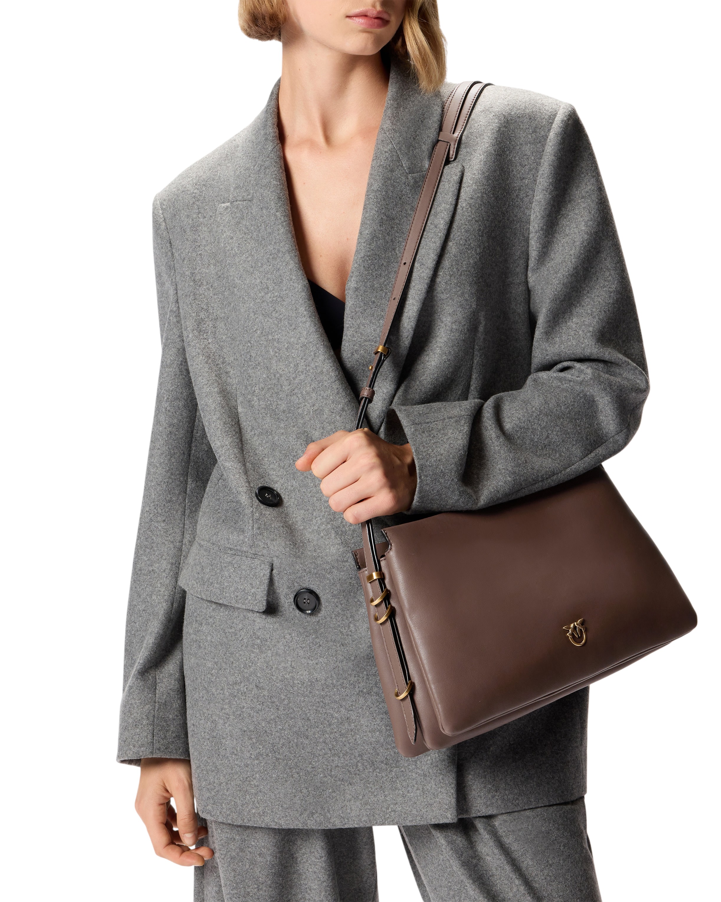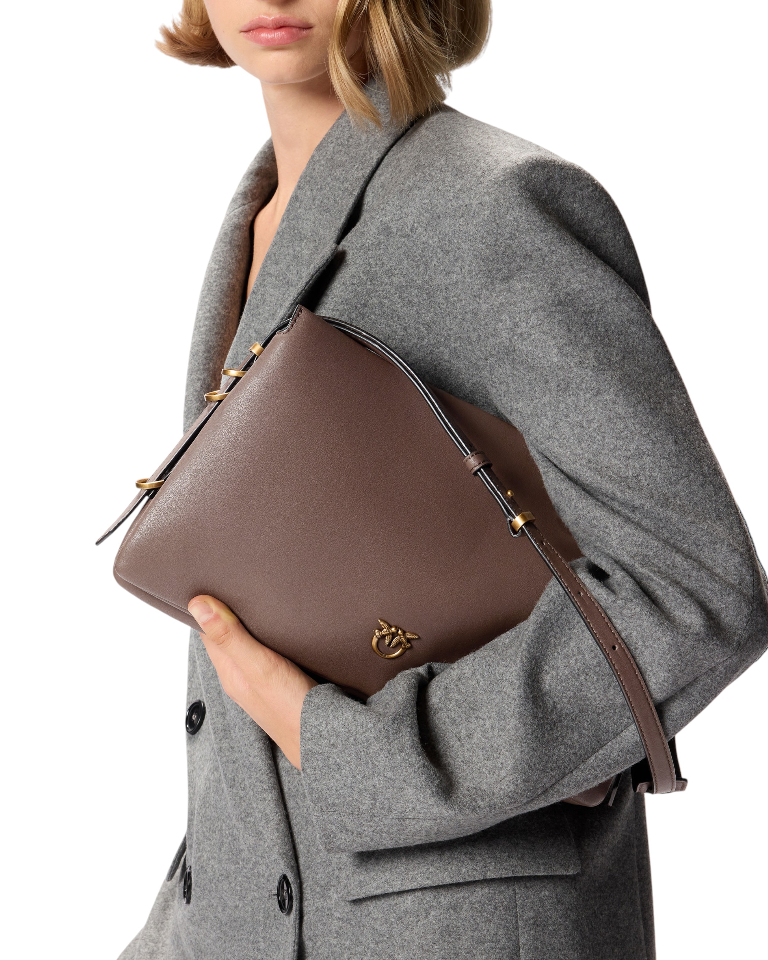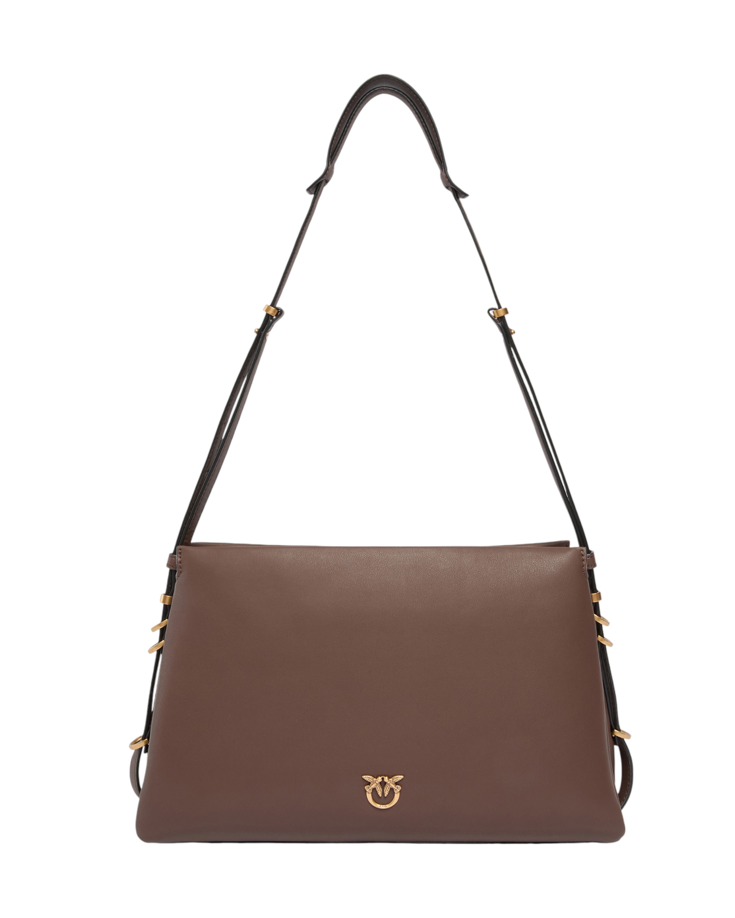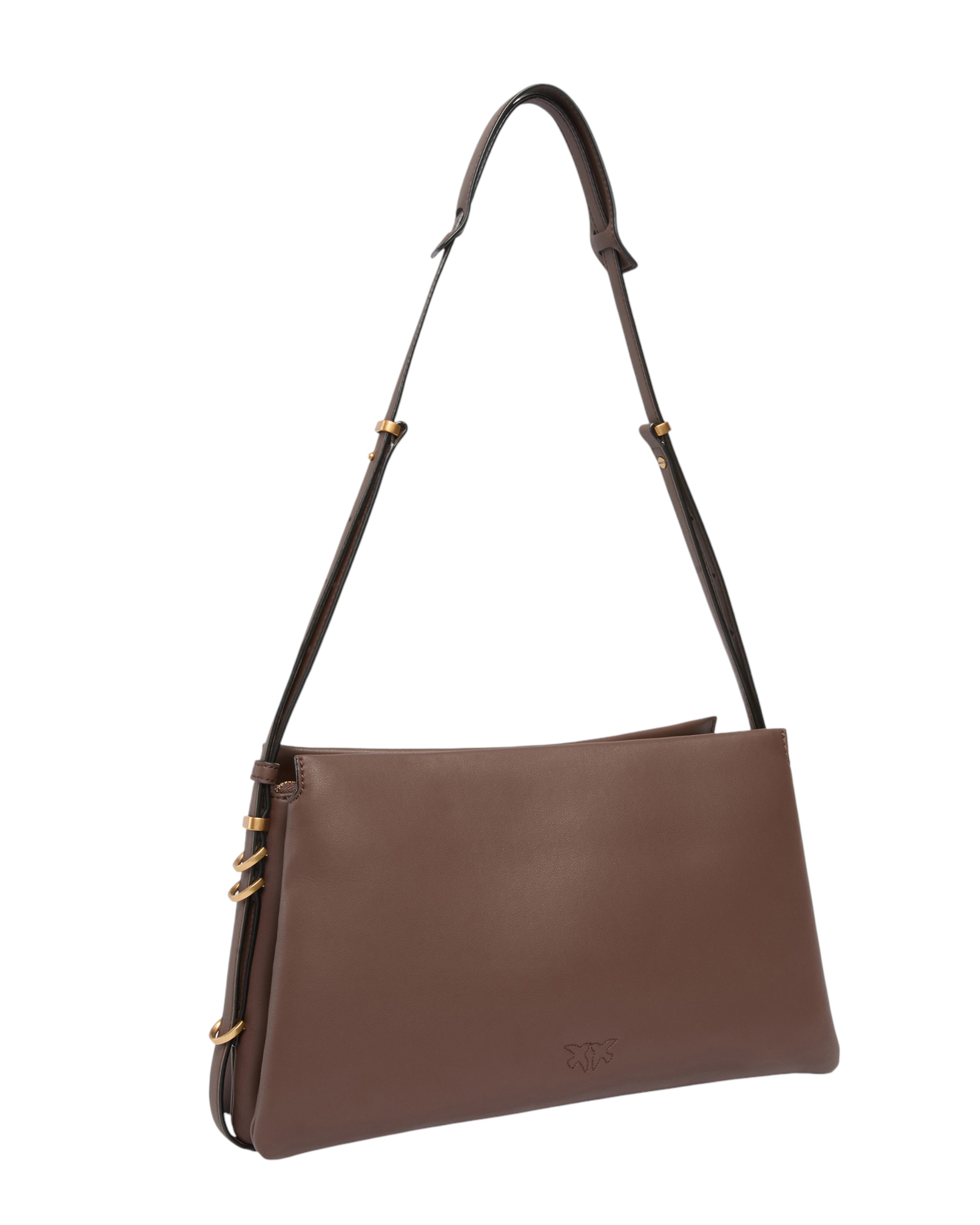 One, Two, Three Bag shoulder bag with a trapezoidal shape in silk-touch leather, characterised by a smooth and refined texture. The soft-structured bag is constructed with three different compartments, the central one of which is closed with a zip, lined in cotton, so you can carry everything you need with you. The adjustable leather shoulder strap is personalised with metal details at the base, while the Love Birds Diamond Cut logo is applied to the front of the bag. The minimalist design and high-quality materials make this bag suitable for both casual occasions and more formal events. Activate your PINKO bag: verify the authenticity of your product and access the personalised experience by placing your smartphone close to the Love Birds embroidery on the back of the bag!