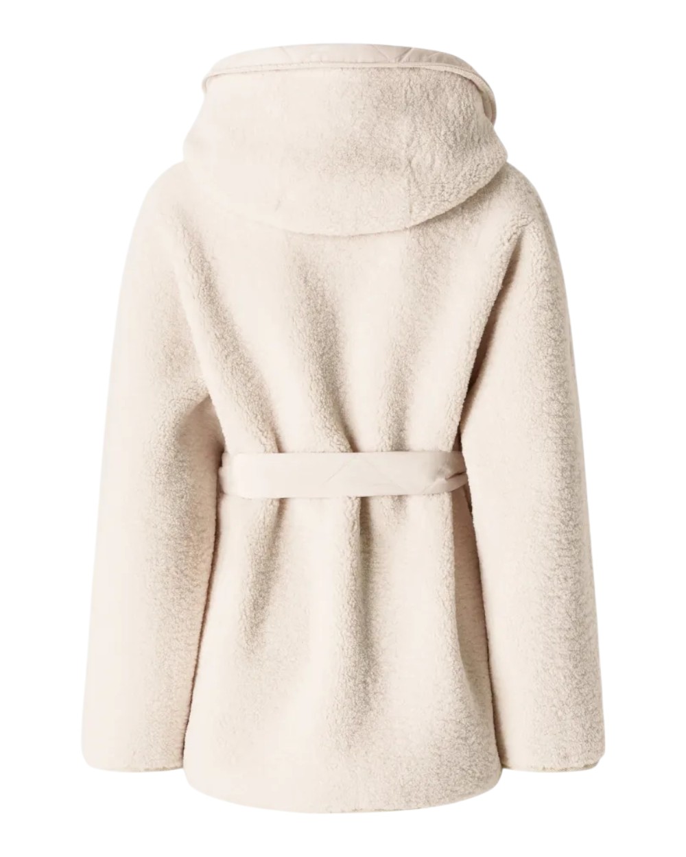 Short pea coat with a wide hood, made from soft teddy-effect faux fur combined with technical fabric details for a look that combines style and functionality. The garment comes with a matching belt in the same fabric to tie at the waist. Fastens with metal press studs.