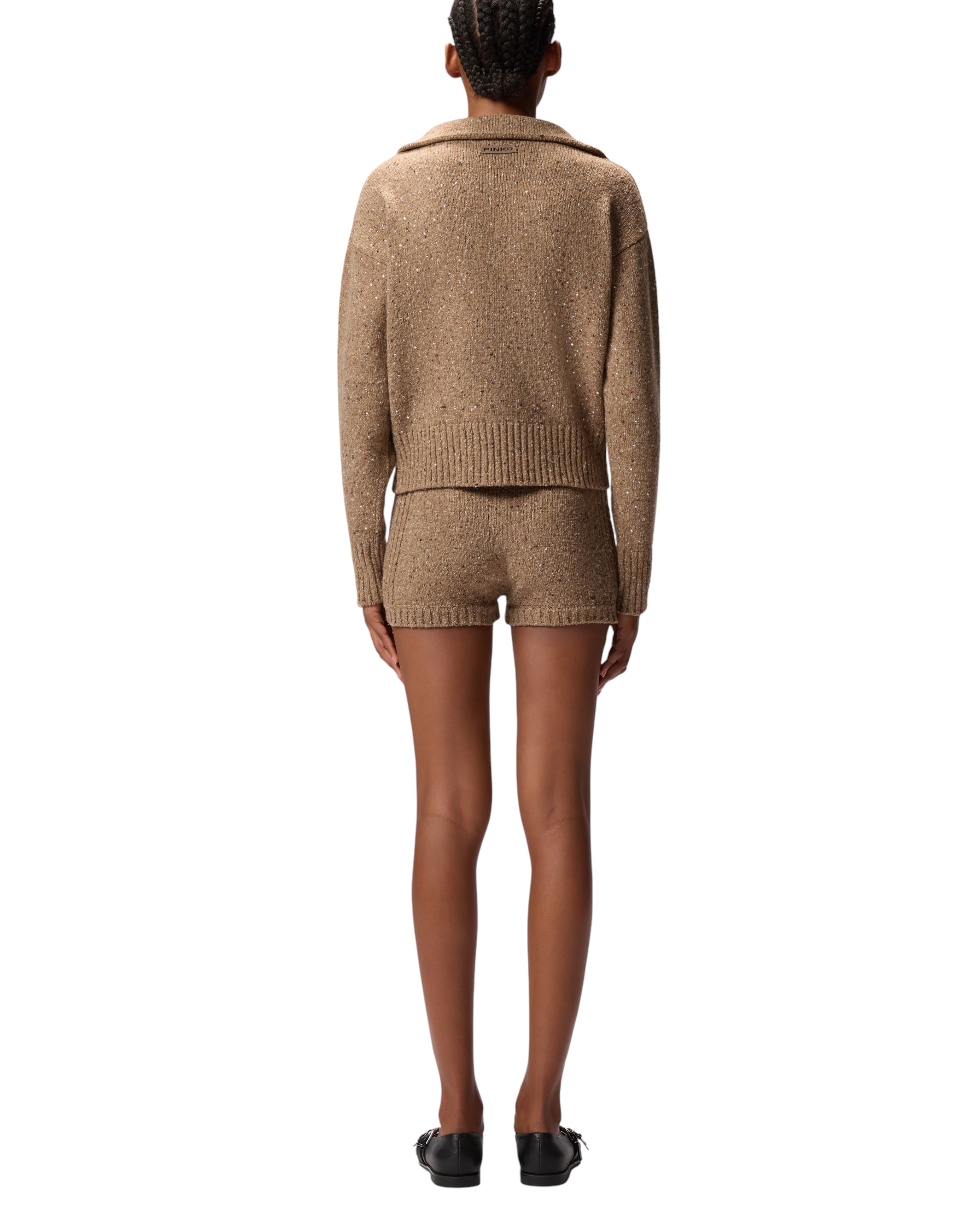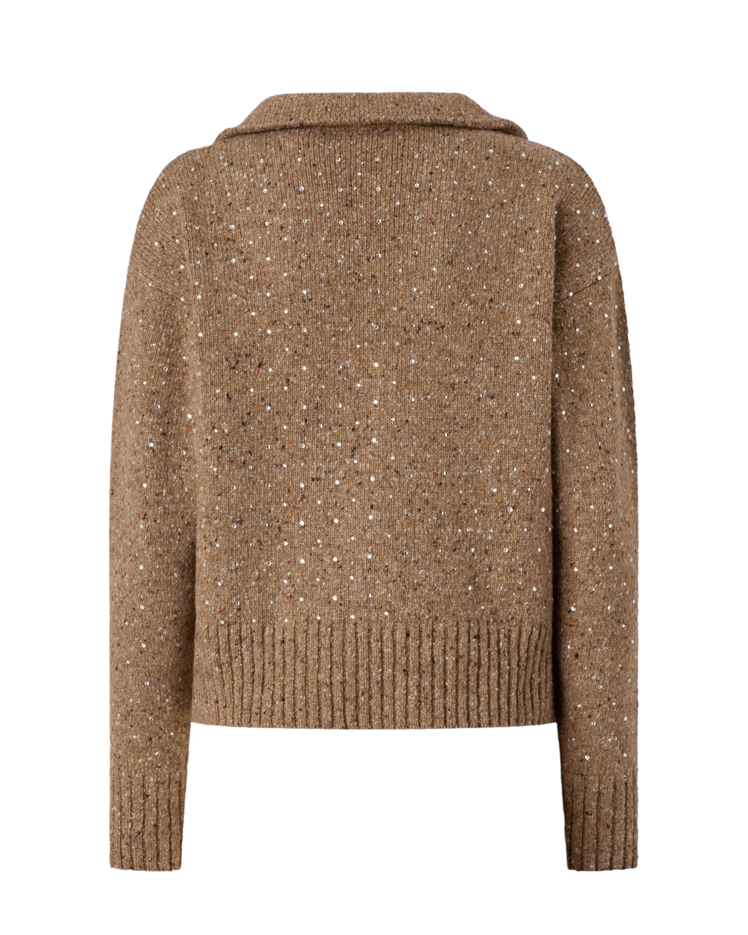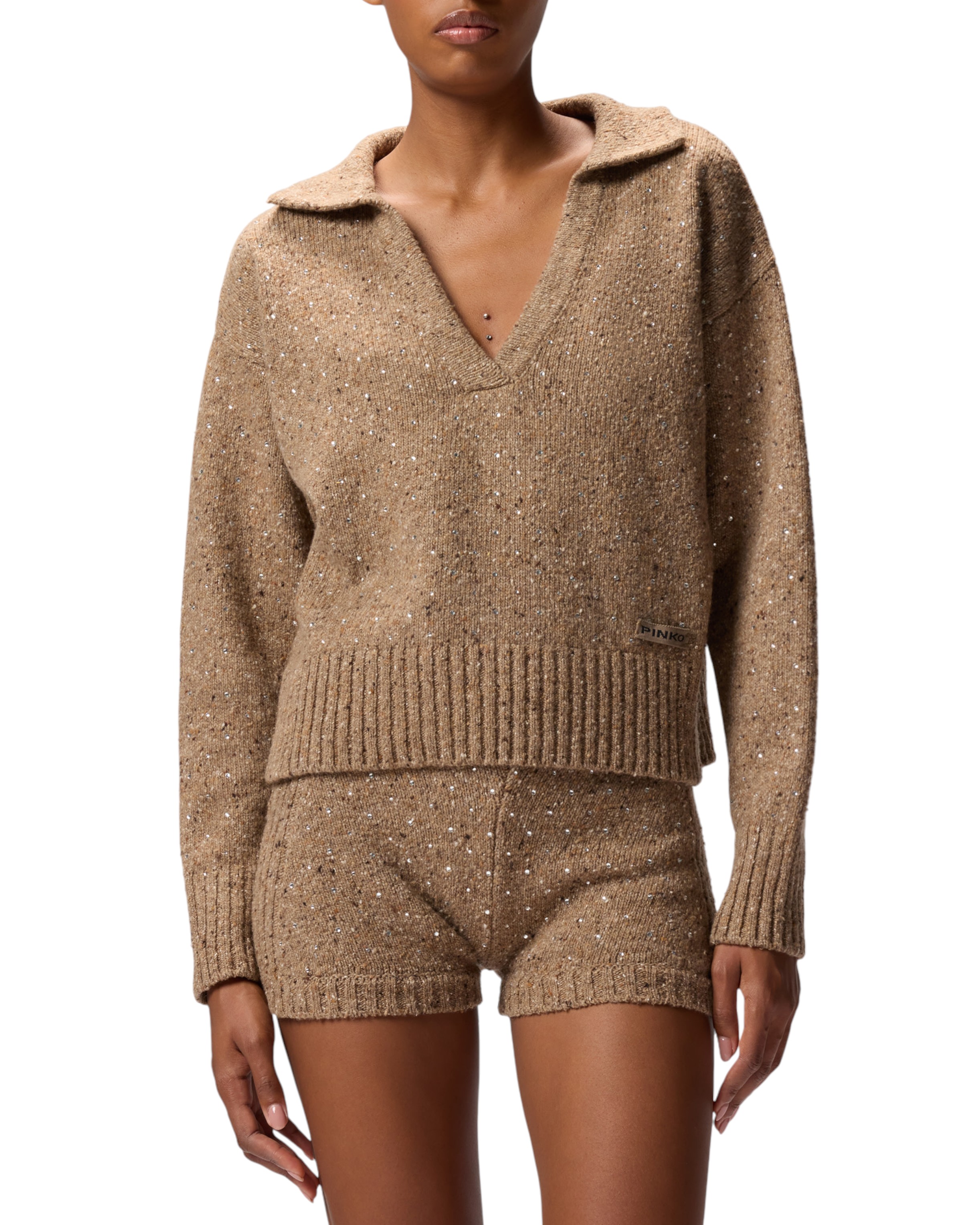Polo-style collar jumper with V-neck and long sleeves in soft buttoned jacquard fabric, embellished with sparkling rhinestones throughout. The hem and cuffs are ribbed, while the tone-on-tone label with the PINKO logo stands out on the front side. The garment has undergone finishing tests to minimise pilling, ensuring greater softness and durability of the fabric. The jumper is casual, thanks to its relaxed fit, and feminine at the same time, thanks to the rhinestones that enrich the design.