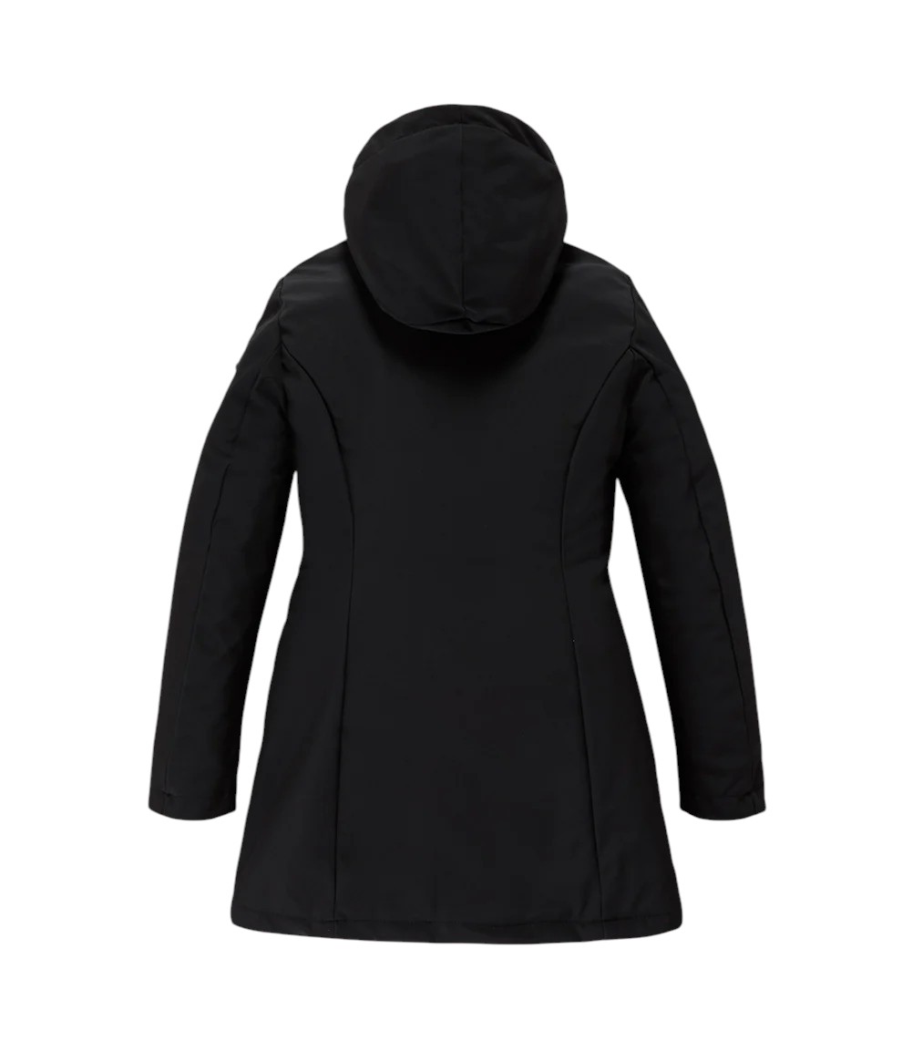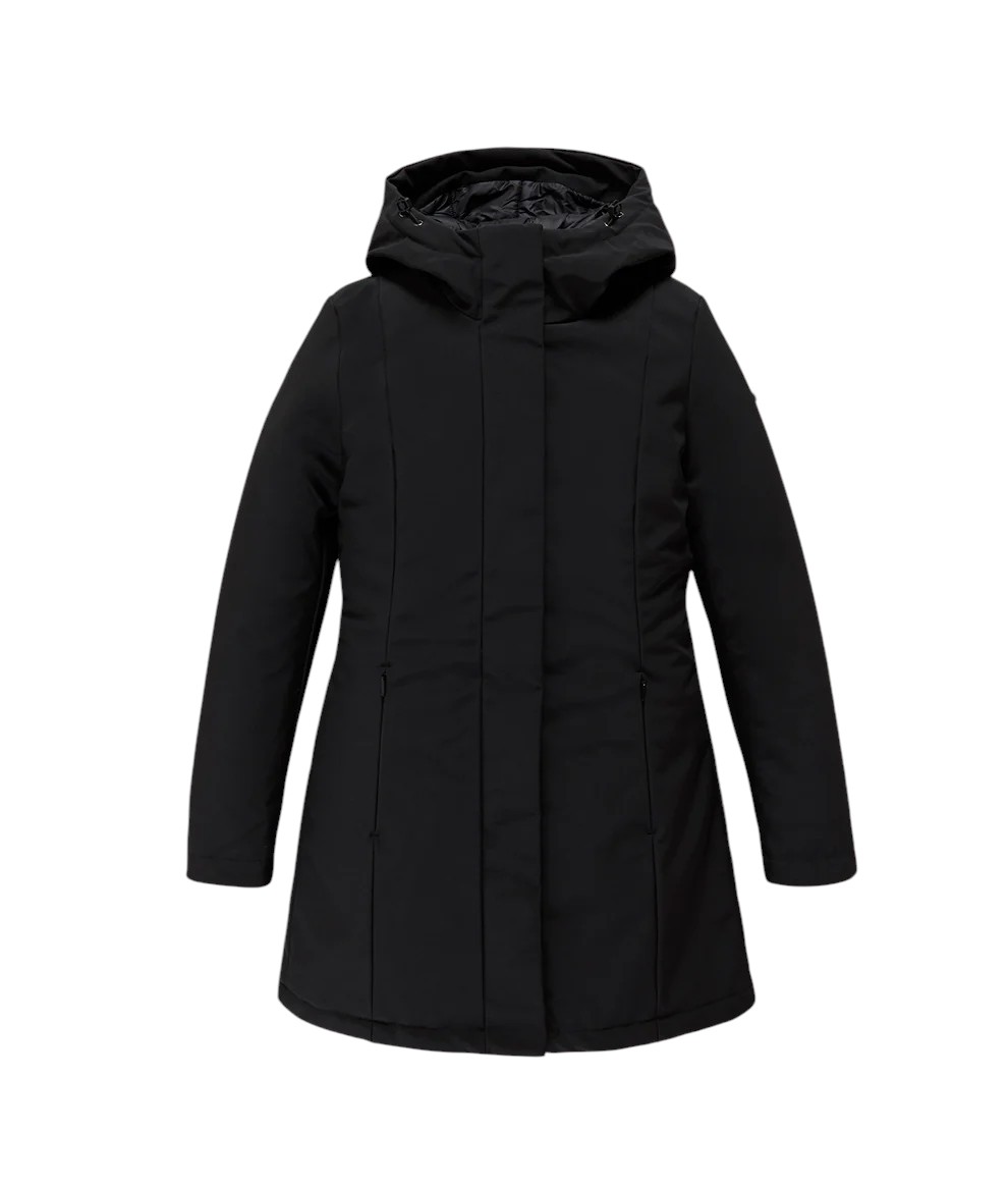 The Lady Tech/1 Jacket is an extremely warm and comfortable women's winter parka, perfect for the cold season. Technical soft-shell outer shell with water-repellent and windproof treatment. Ideal for wearing on any occasion, whether in the city for everyday life, outdoors in the mountains or during a hike. RefrigiWear® Thermal Padding, 100% animal-free, ensures excellent breathability and formidable thermal insulation. The garment features a drawstring-adjustable rain hood and two front pockets with concealed zips. Front closure with double-slider zip hidden by a buttoned flap for a refined and clean look. Metal logo plaque on the arm. This women's parka is a must-have for your winter wardrobe. Once you try it, you won't be able to do without it. This garment has a slim fit, so buy one size larger for the ideal fit.