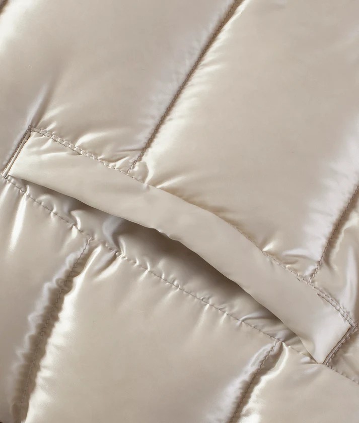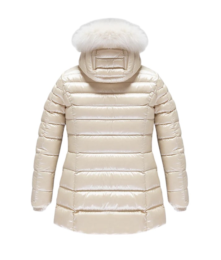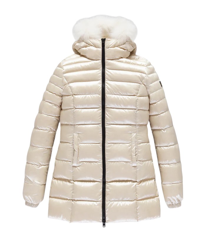 The Long Mead Fur Jacket is a ¾-length women's winter down jacket with fur, perfect for wearing on all occasions, from everyday city life to more formal or office settings. A must-have item in your winter wardrobe. The exterior is made of super-lightweight, windproof nylon with a water-repellent treatment, giving it a luxurious and slightly iridescent look. The interior is padded with 100% 90-10 RDS down, making it extremely soft and comfortable to wear. The down offers maximum lightness, ensuring the highest performance in terms of heat retention and wind protection. The quilting is traditional horizontal, the fit is feminine but revised to suit different shapes. The garment is refined down to the last detail: the front closure is with a zip and customised slider, the cuffs are elasticated for maximum protection from wind and rain, and the hood has a fur trim for enhanced comfort. Concealed front pockets are ideal for storing personal items. Classic patch logo on the left arm. An extremely versatile garment, ideal for travelling, given its ease of use and practicality, as well as for everyday city life. Suitable for cold temperatures and wind resistant. Wear it for formal occasions or even with a casual look.