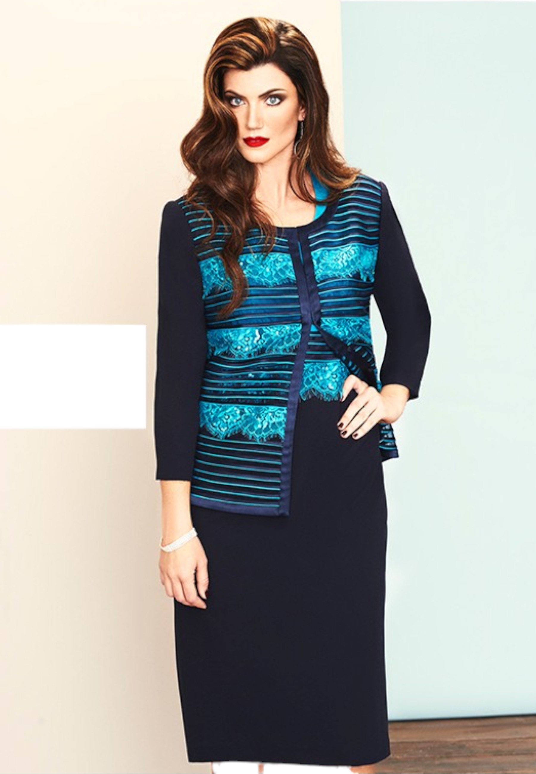 Accompanying it is a matching short jacket, the true focal point of the look: also in midnight blue, it is embellished with tone-on-tone lace inserts that add a touch of femininity and sophistication. Contrasting teal details complete the design with an elegant and modern colour play.