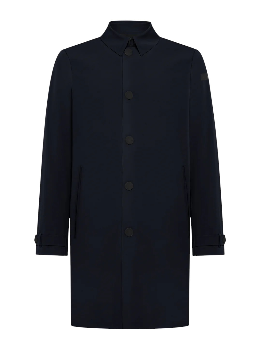 Since the 1960s, it has rightfully belonged in the men's wardrobe. Today, RRD reinterprets the classic duster jacket with a contemporary twist, featuring high-tech materials and innovative details in understated mid-season hues. The Montecristo Thermo Coat Jkt is crafted from breathable and waterproof Stratofabric #3 membrane fabric, structured with selective internal heat-taping. The Montecristo fabric exterior, with a smooth feel and matte look, is livened up by black rubberized buttons that close the flap and adjust the cuffs, which feature a belt. The shirt collar closes with a metal hook, while the large side pockets are raw-edged. The interior is lined in warm, soft, contrasting black velvet, with a concealed zip pocket embellished with double orange piping and a heart-shaped "Made with love, designed in Tuscany" tag. The center back vent emphasizes the freedom of movement of the straight, regular fit. A black micro-injection logo is featured on the left sleeve.