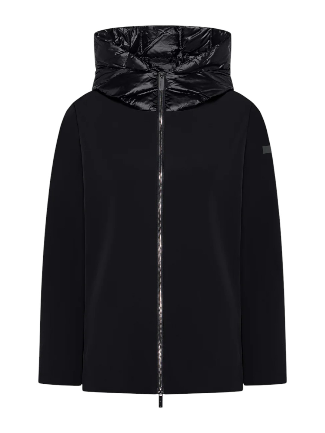 This jacket, with its clean, minimalist lines, is characterized by a combination of fabrics with different textures and sheens. The extra-matte Montecristo exterior on the front and sleeves, soft to the touch and pleasantly stretchy, contrasts with the glossy look of the tubular channels on the back and the enveloping hood that softly frames the face. Unstitched, these channels enclose the soft duck down padding in a seamless texture. The hip-length fit and regular fit make the jacket particularly comfortable and versatile. The central two-way zip closure is a distinctive design element, complemented by side pockets with invisible zips. The black micro-injected logo on the left sleeve completes a coat that can be worn with both formal and casual outfits. Ideal for a fall day paired with men's cigarette trousers.
