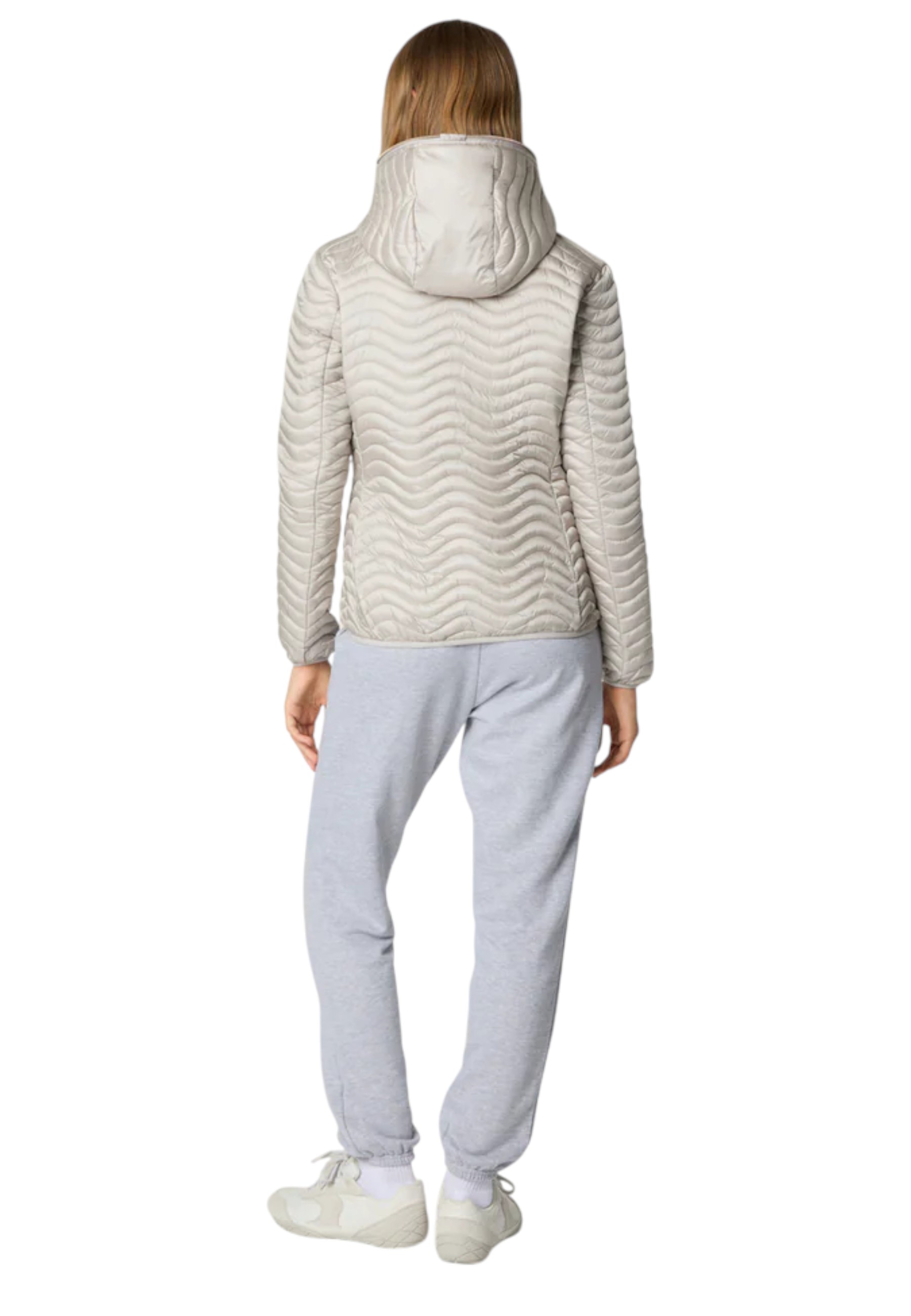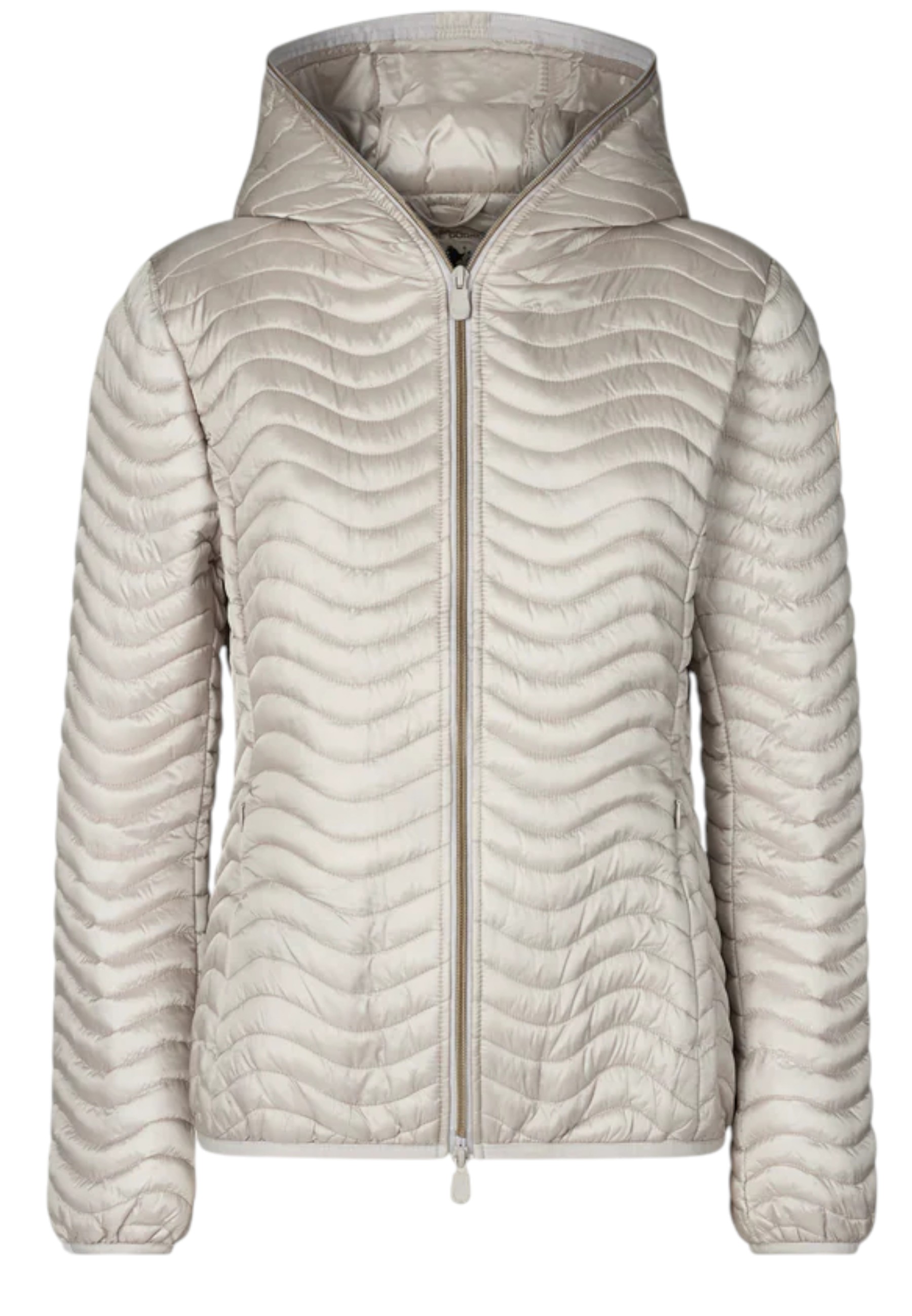 The Melody animal-free down jacket reinterprets a Save The Duck classic with an original wavy quilting pattern. Comfortable and lightweight, it features a practical hood, central double-slider zip and side pockets with invisible zips. The round badge on the sleeve and customised zip pulls add a distinctive touch to the garment.