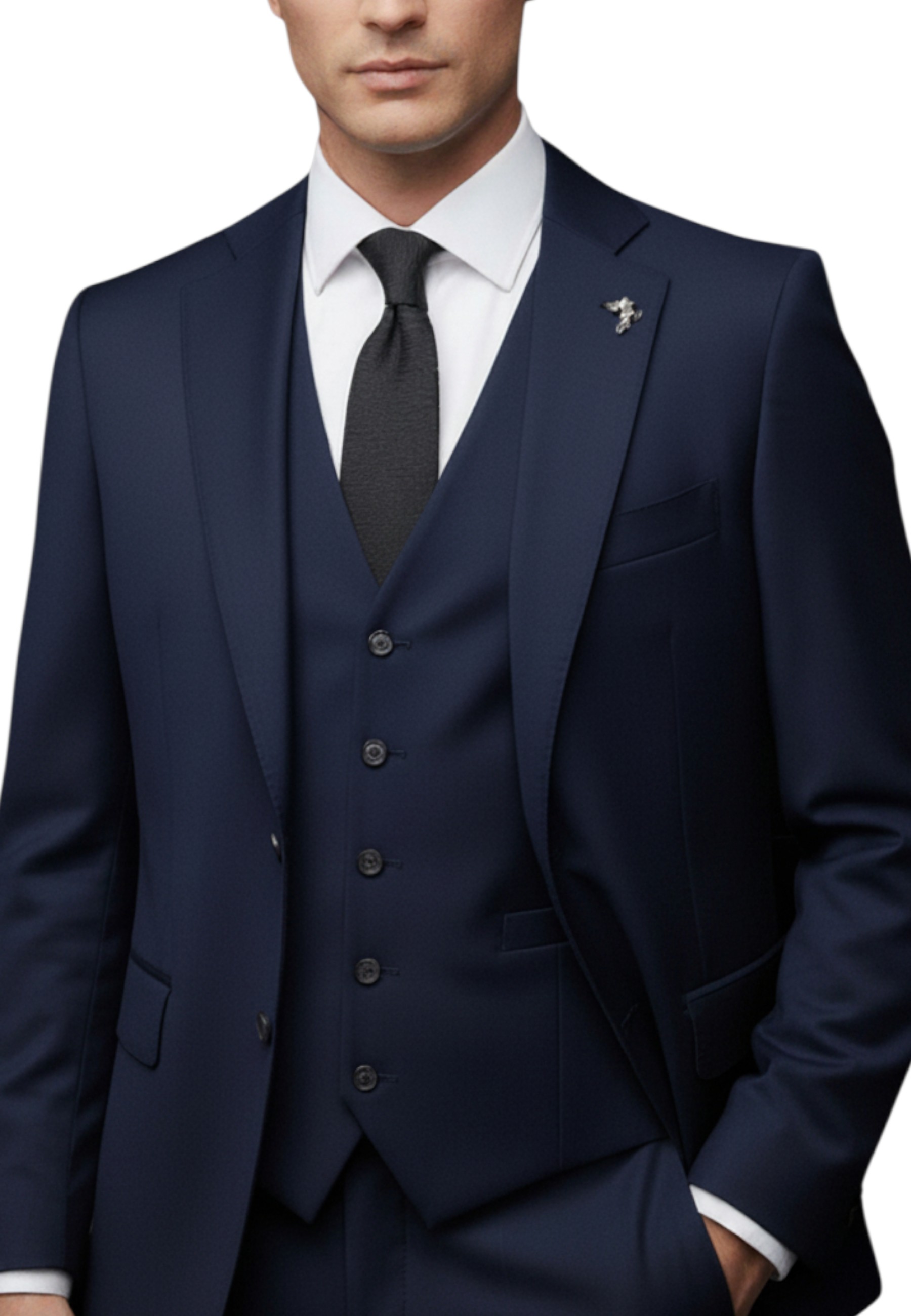 The suit consists of a 2-button jacket, trousers, and matching waistcoat.