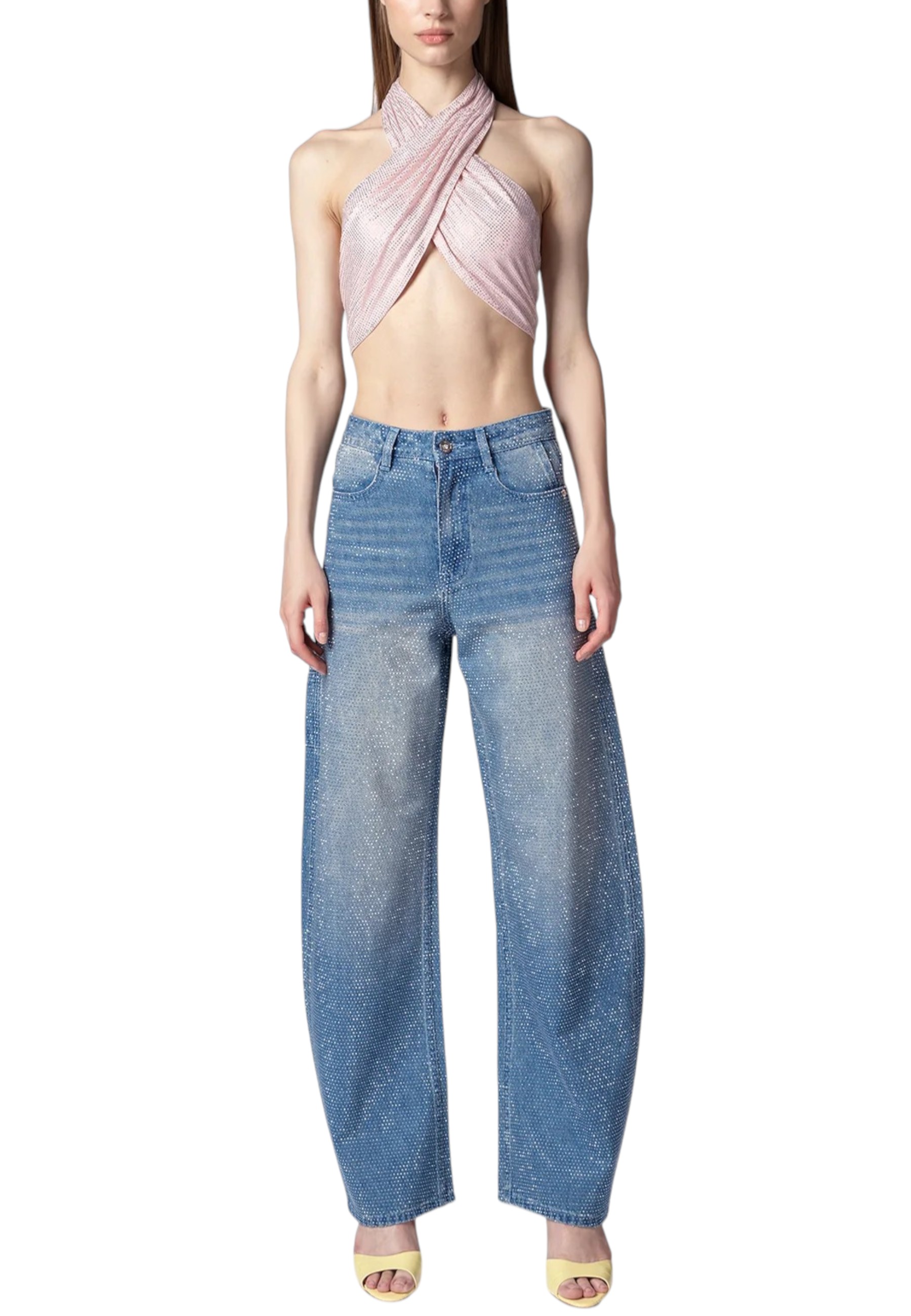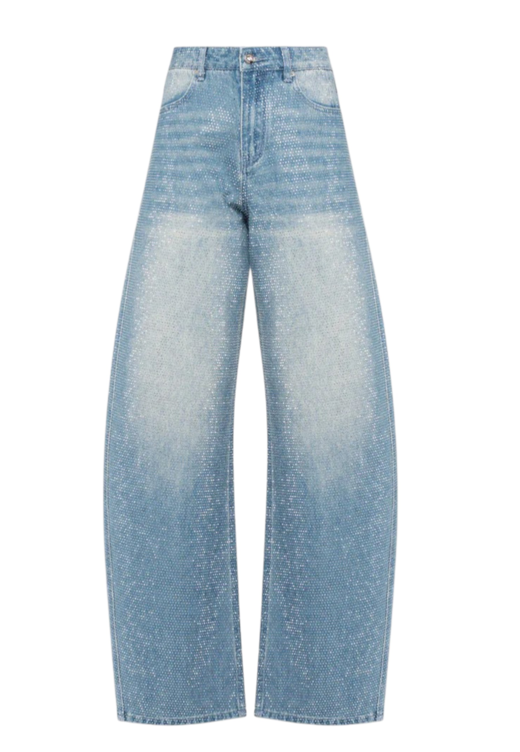 Baggy denim trousers crafted from medium-wash cotton, entirely covered in crystal micro rhinestones applied across the entire surface for a uniform, luminous finish. The design features a wide leg at the centre that gradually tapers towards the hem, defining the volume without compromising the balance of proportions. The style maintains a regular fit, with attention to the structure of the denim and the continuity of the lines.