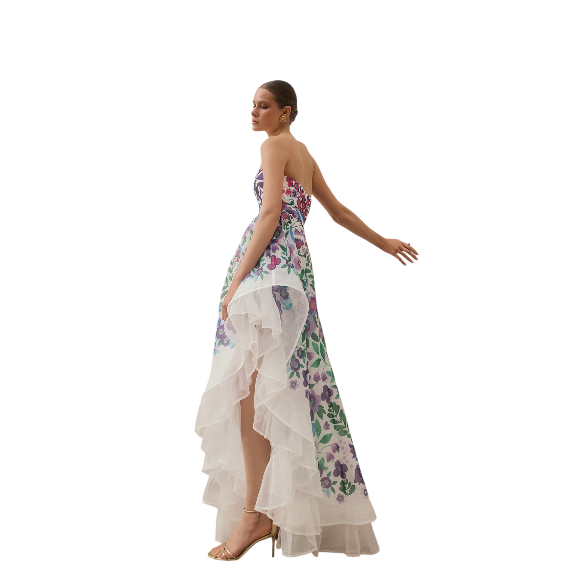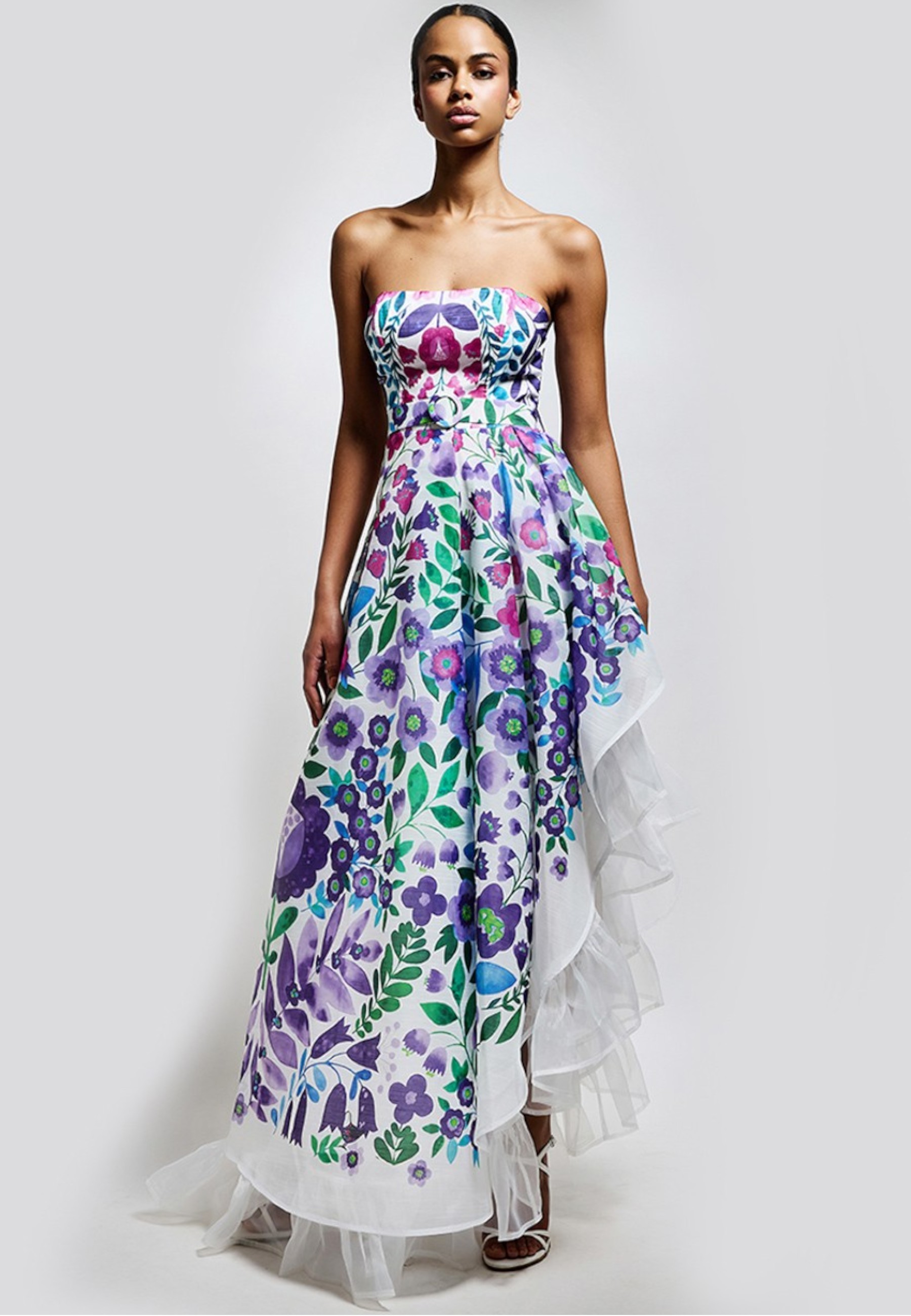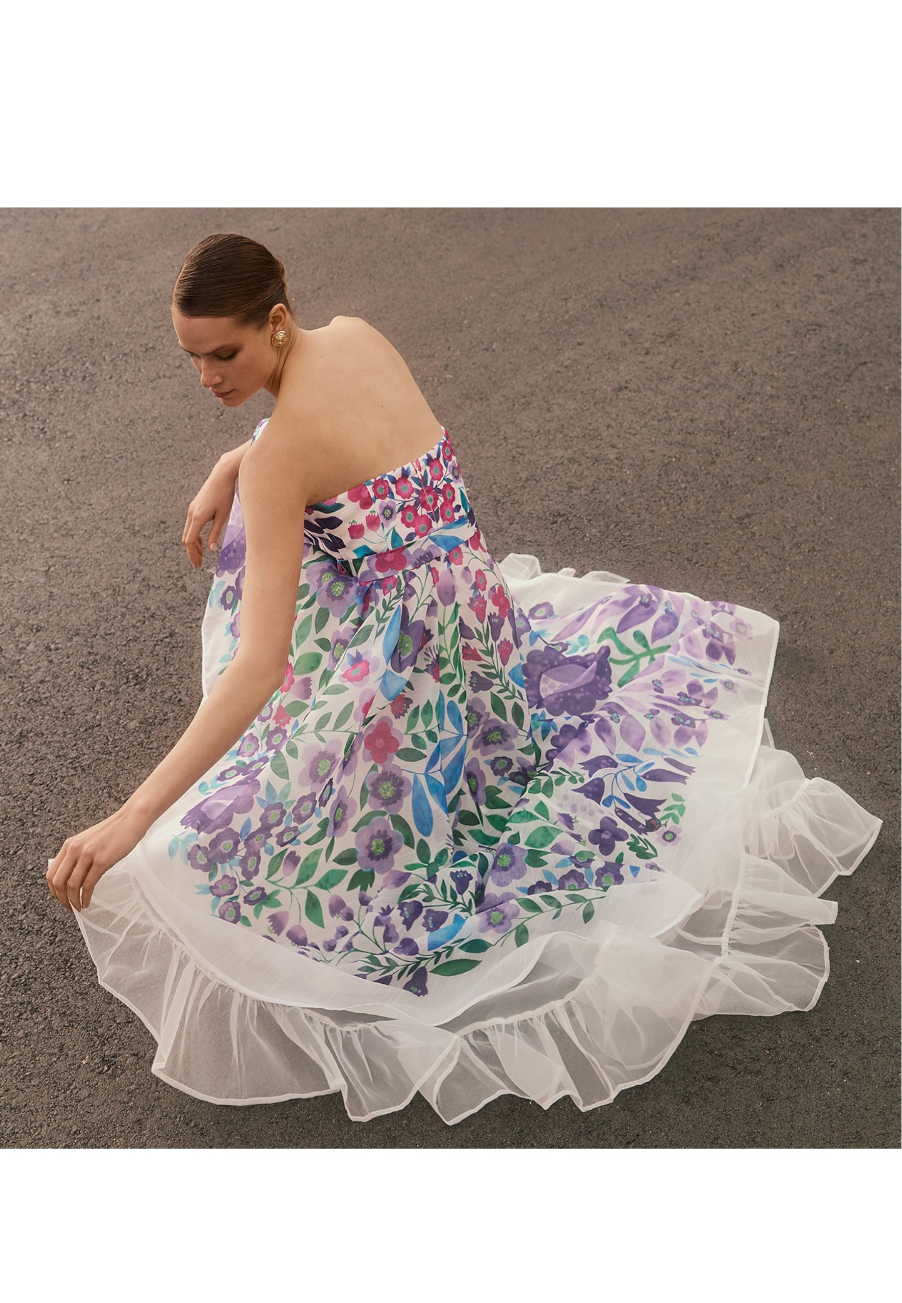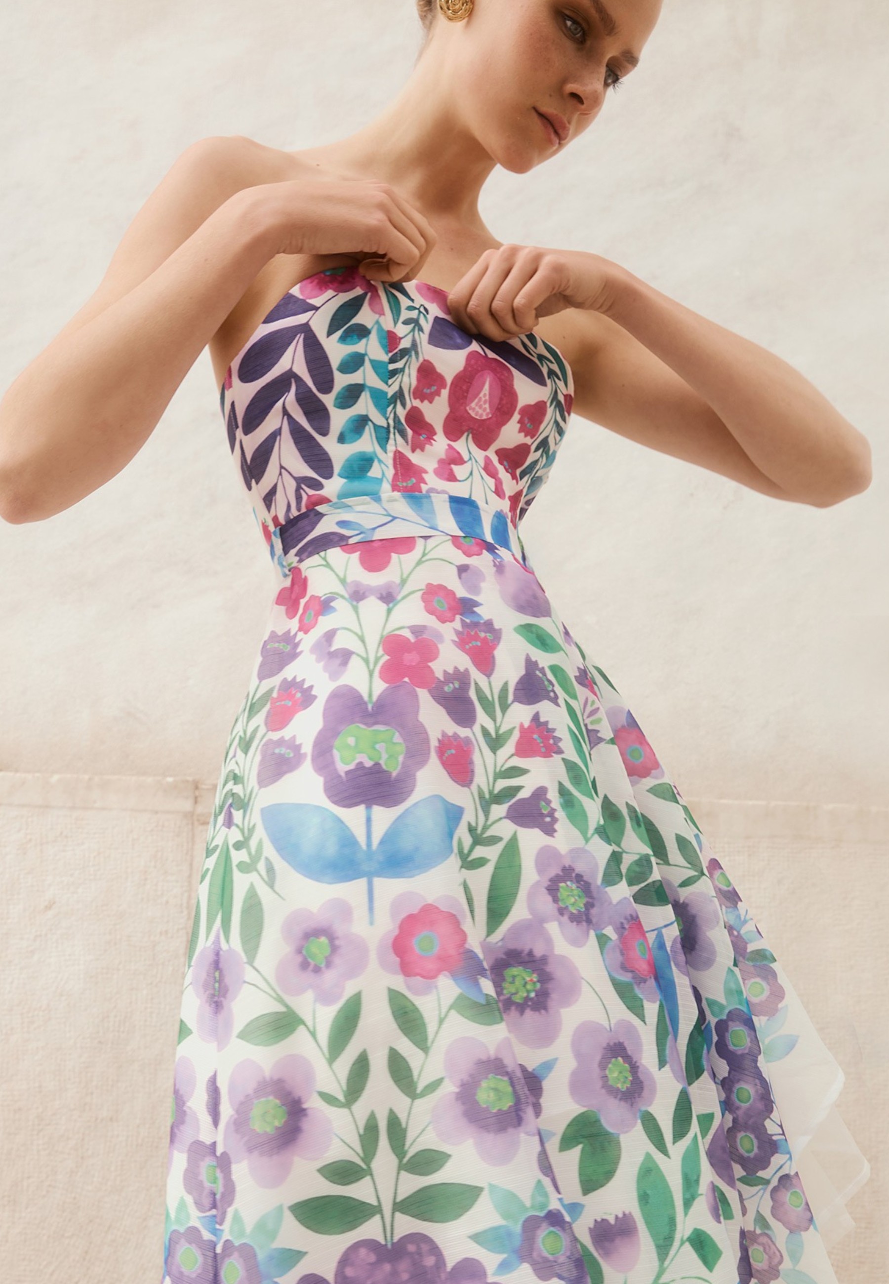 Distinguish yourself with elegance and freshness by wearing this refined asymmetric dress. Crafted from a light, flowing fabric, the design features a flared silhouette that flatters the figure with movement and grace. The vibrant and romantic floral pattern adds a touch of timeless femininity, perfect for ceremonies, summer events or special occasions.