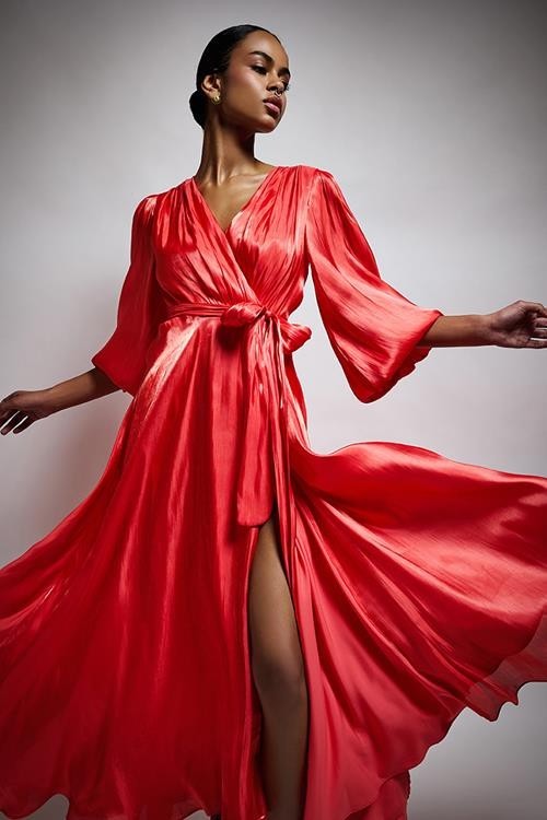 The puff sleeves add a romantic and trendy touch, while the shiny fabric lends a refined glow to the vibrant coral colour, perfect for special occasions or to stand out with class at an evening event.