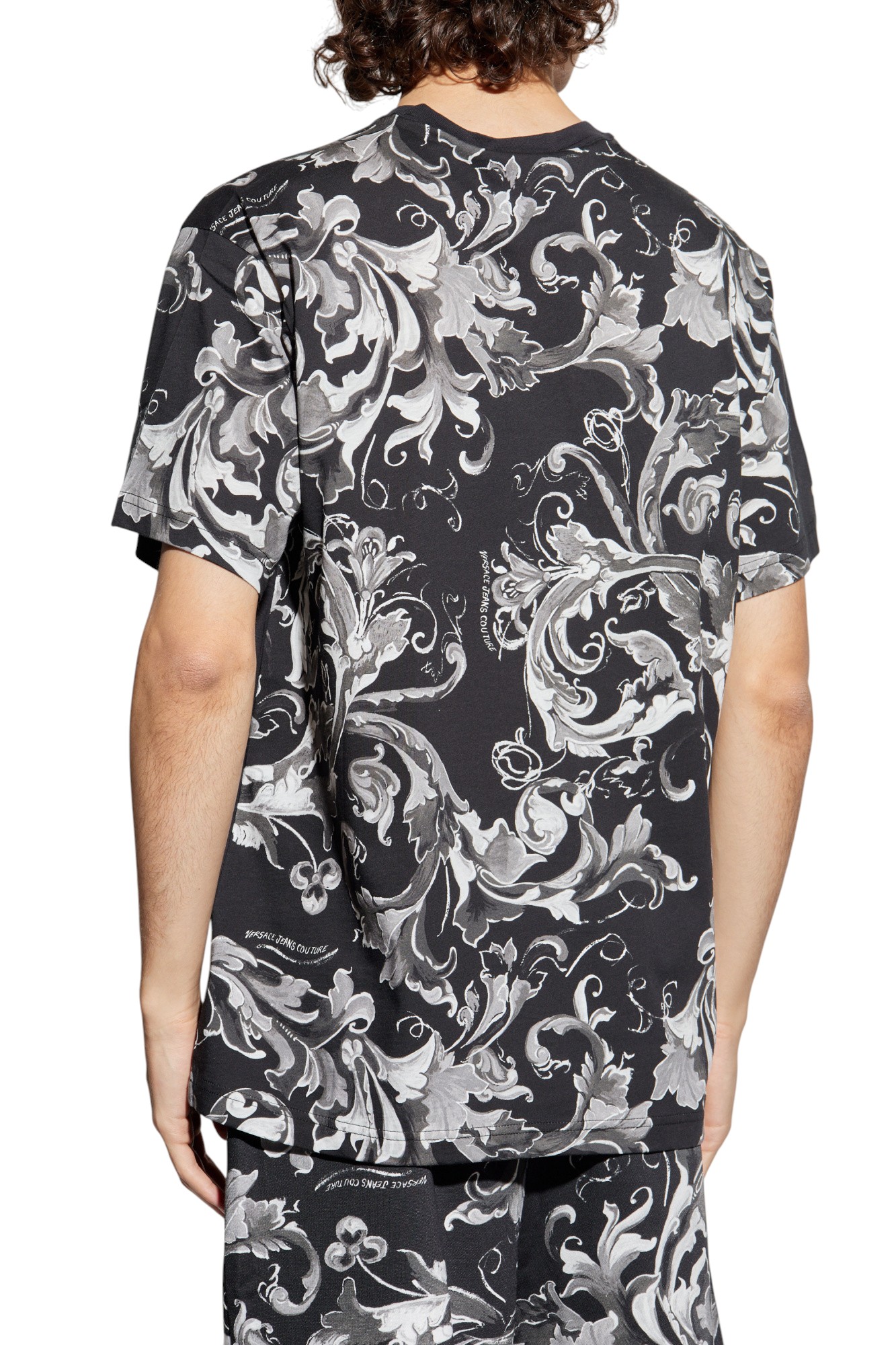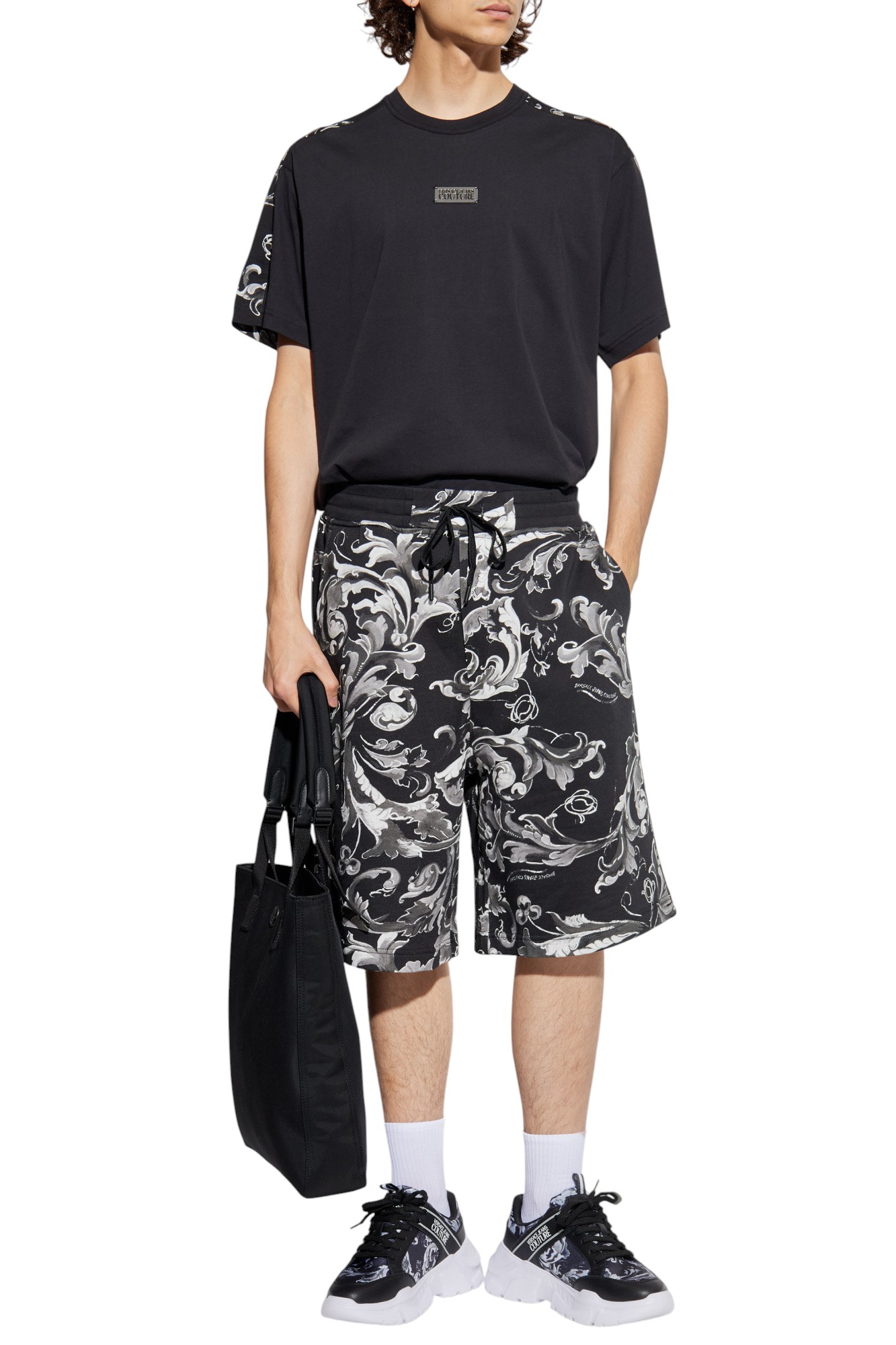 The front boasts understated elegance: a sleek black canvas embellished with a distinctive embossed rectangular patch proudly displaying the VERSACE JEANS COUTURE logo. The sleeves and back are adorned with the brand's iconic Barocco motif in striking shades of black, gray, and white: an opulent floral touch inspired by botanical decorations. Every seam is meticulously finished, a testament to refined craftsmanship.