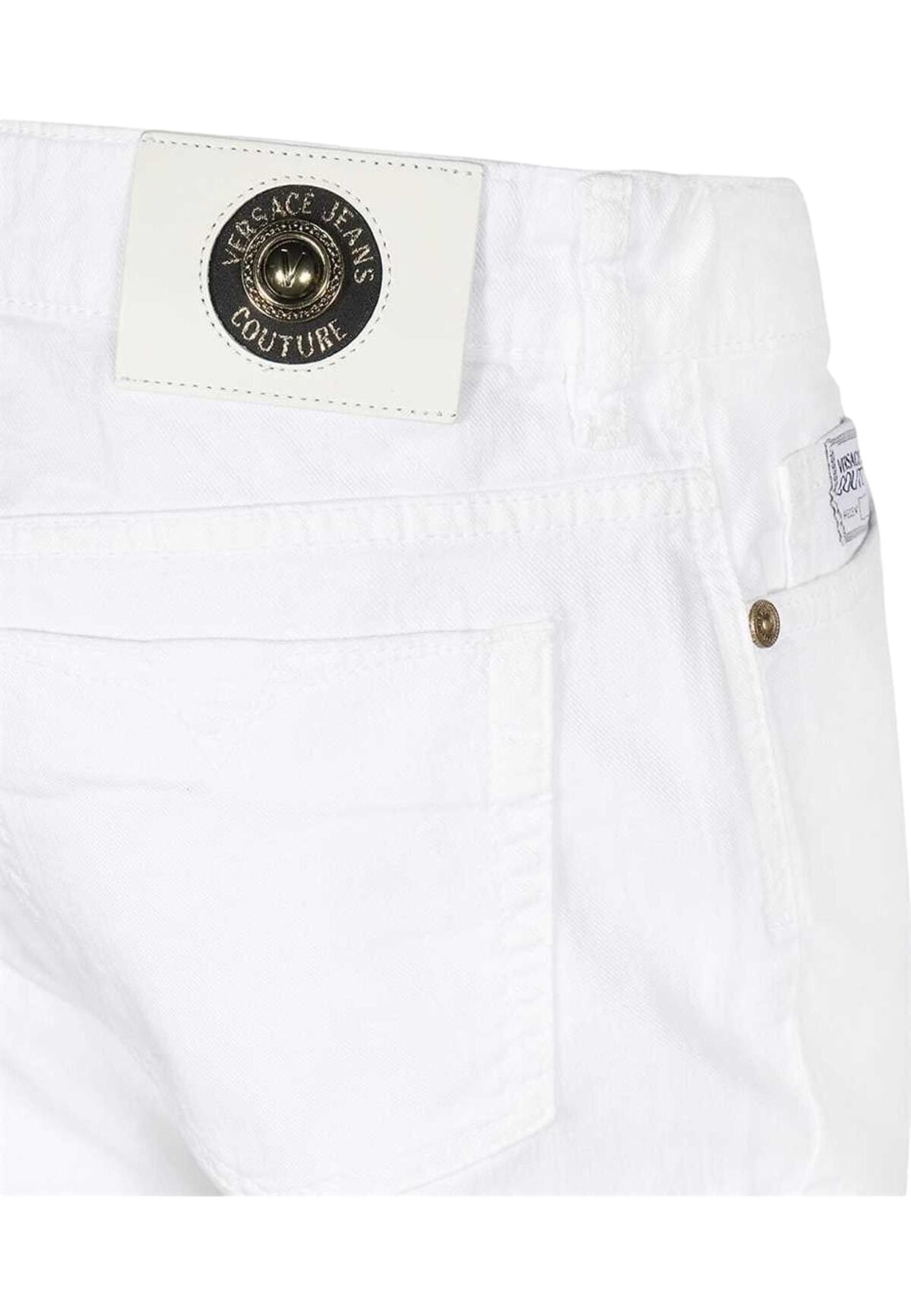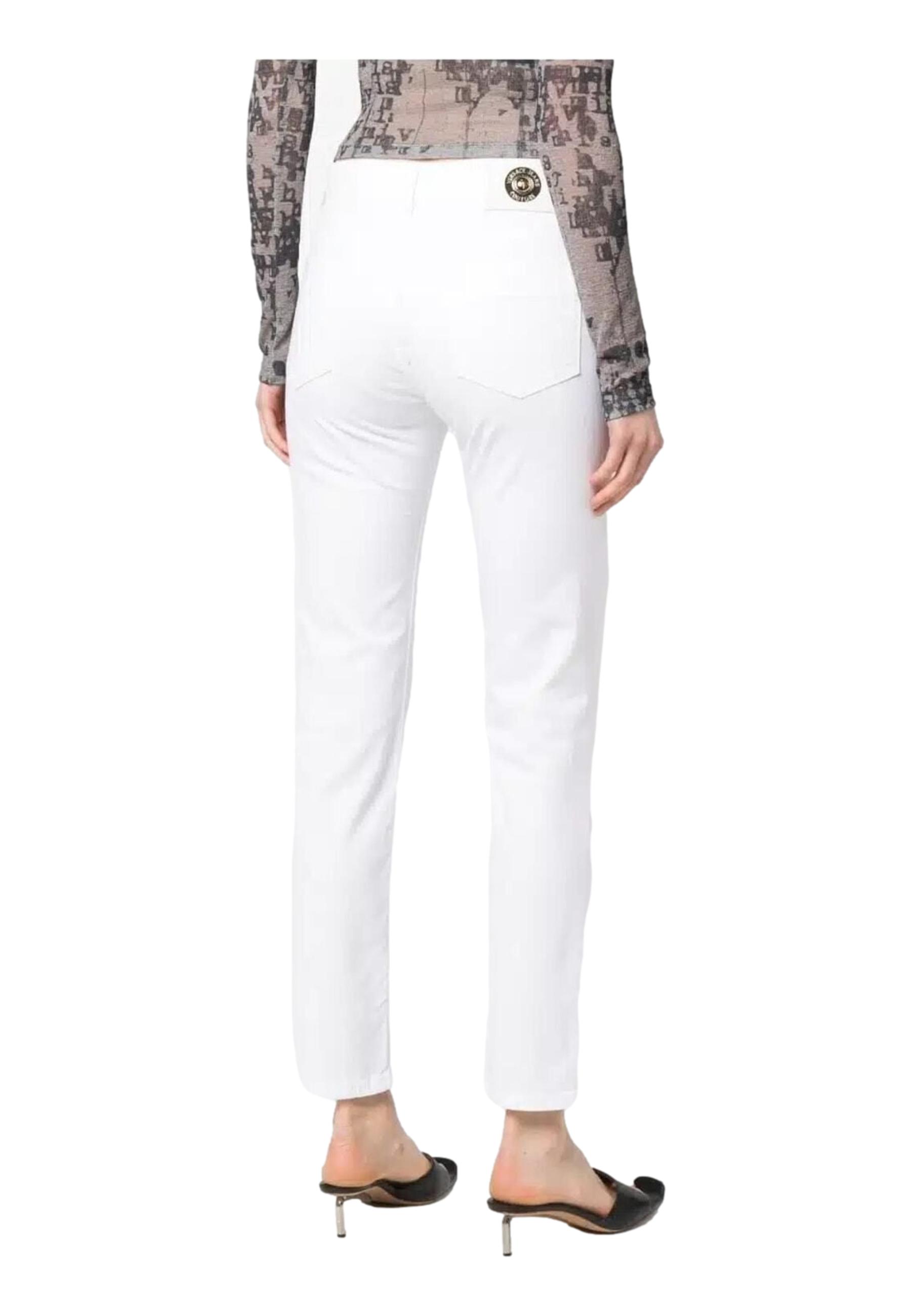Jeans made of stretch cotton denim. Five-pocket model, concealed zip fastening with logoed button. Logo patch on the front pocket, tone-on-tone logo rivets, belt loops on the waist. Faux leather with logoed metal detail and Versace Jeans Couture logo