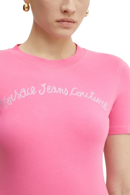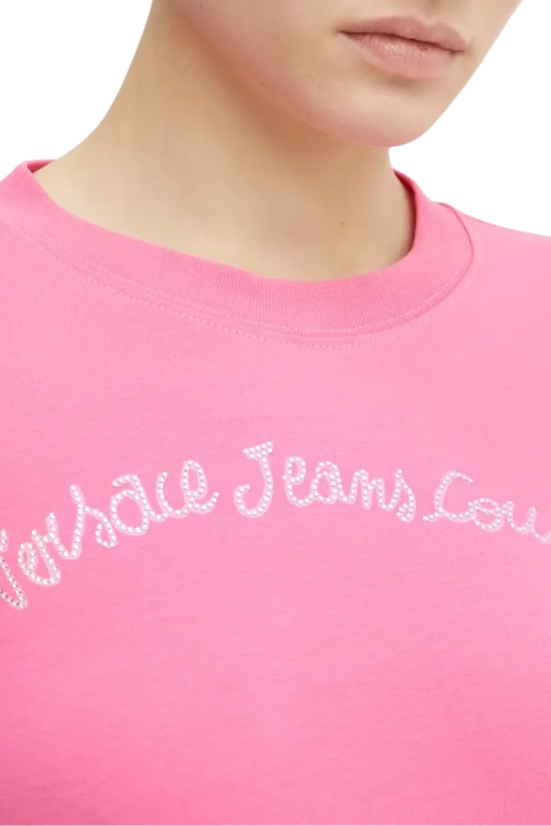 A T-shirt made from a soft blend of cotton and elastane, this garment promises an impeccable fit thanks to its classic, fitted silhouette and short sleeves. The upper front is embellished with 'Versace Jeans Couture' lettering, embellished with sparkling elements that elevate its chic allure.