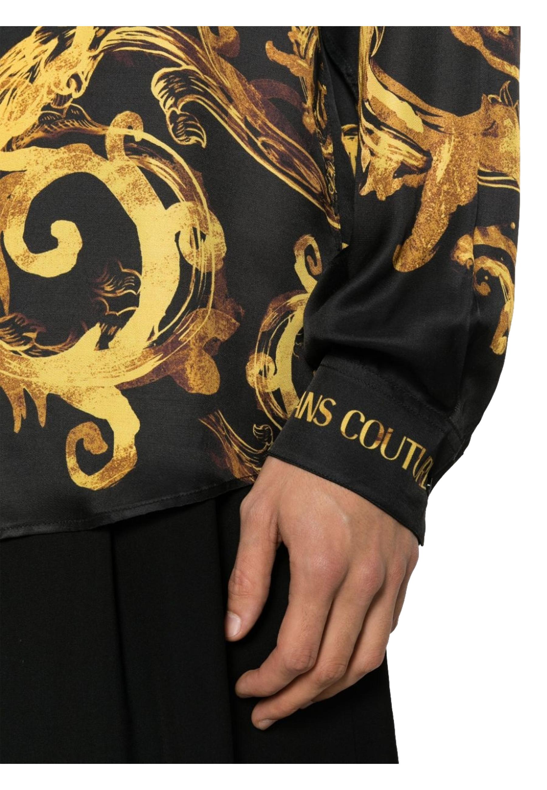 Black, gold-colored, abstract pattern, logo print on back, logo print in sleeve, classic collar, V-neck, front button closure, long sleeves, button hems and curved hem.