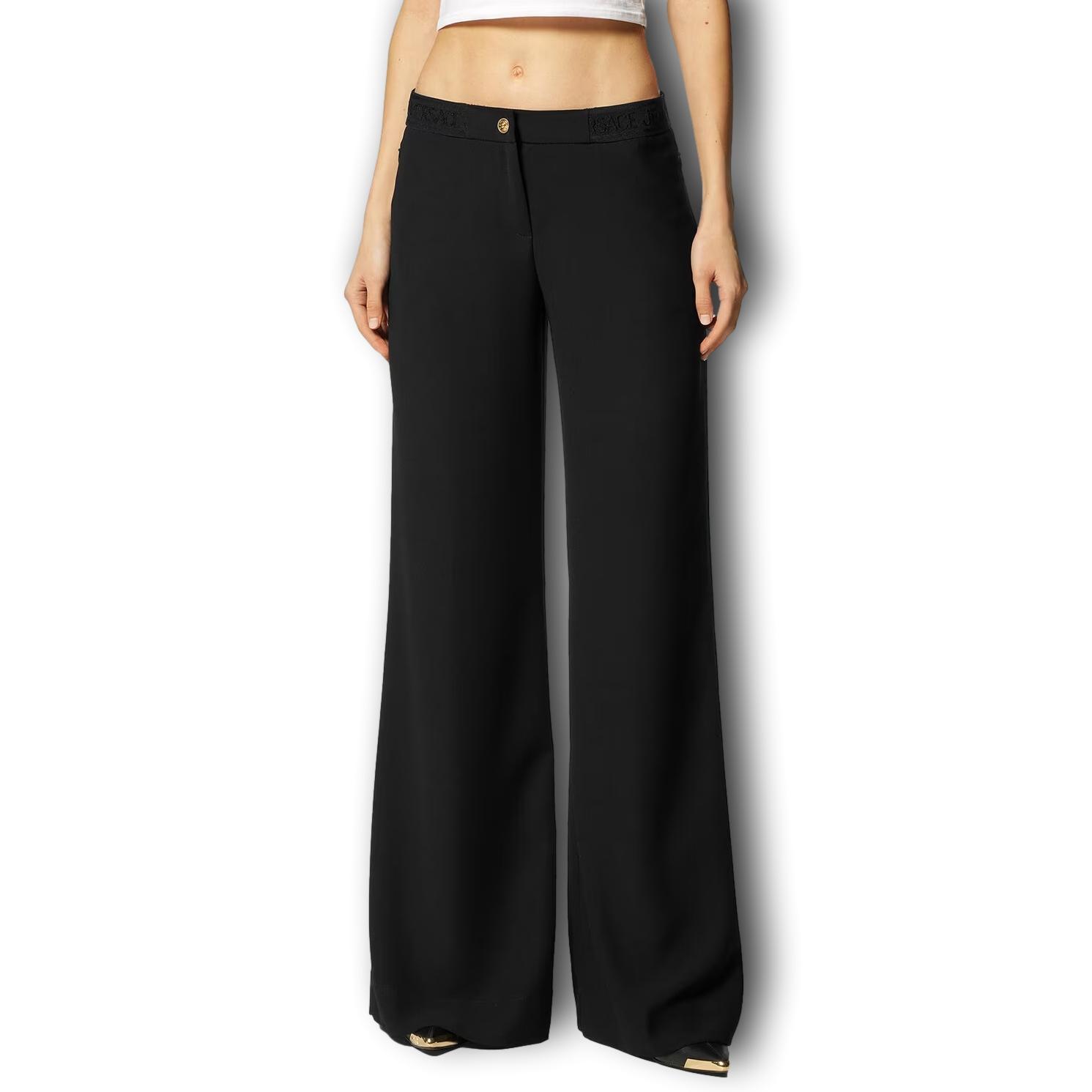 Black, crepe-effect weave, medium waist, elastic waistband, logo waistband, concealed button and zipper closure, two side zipper pockets and wide leg.