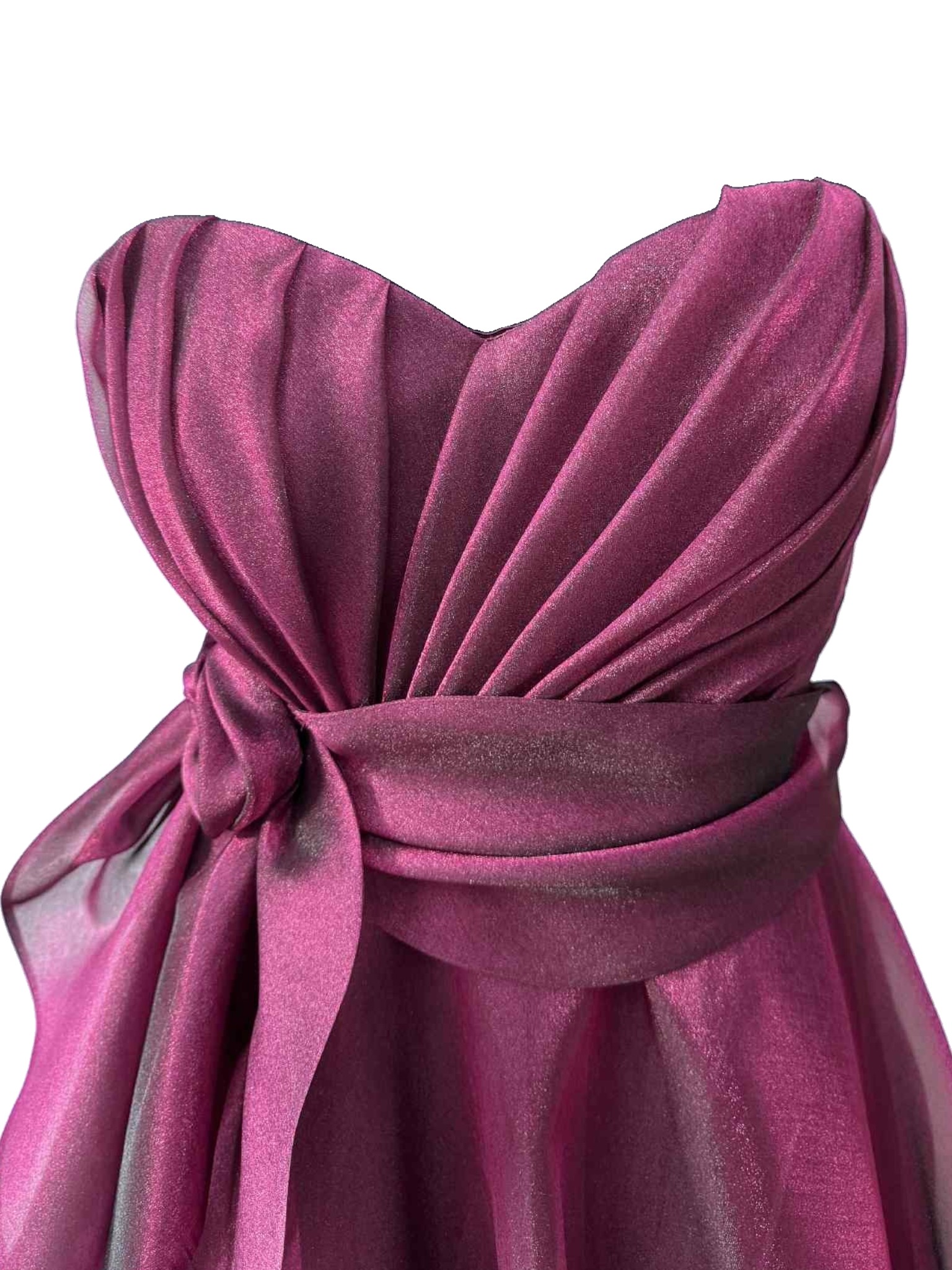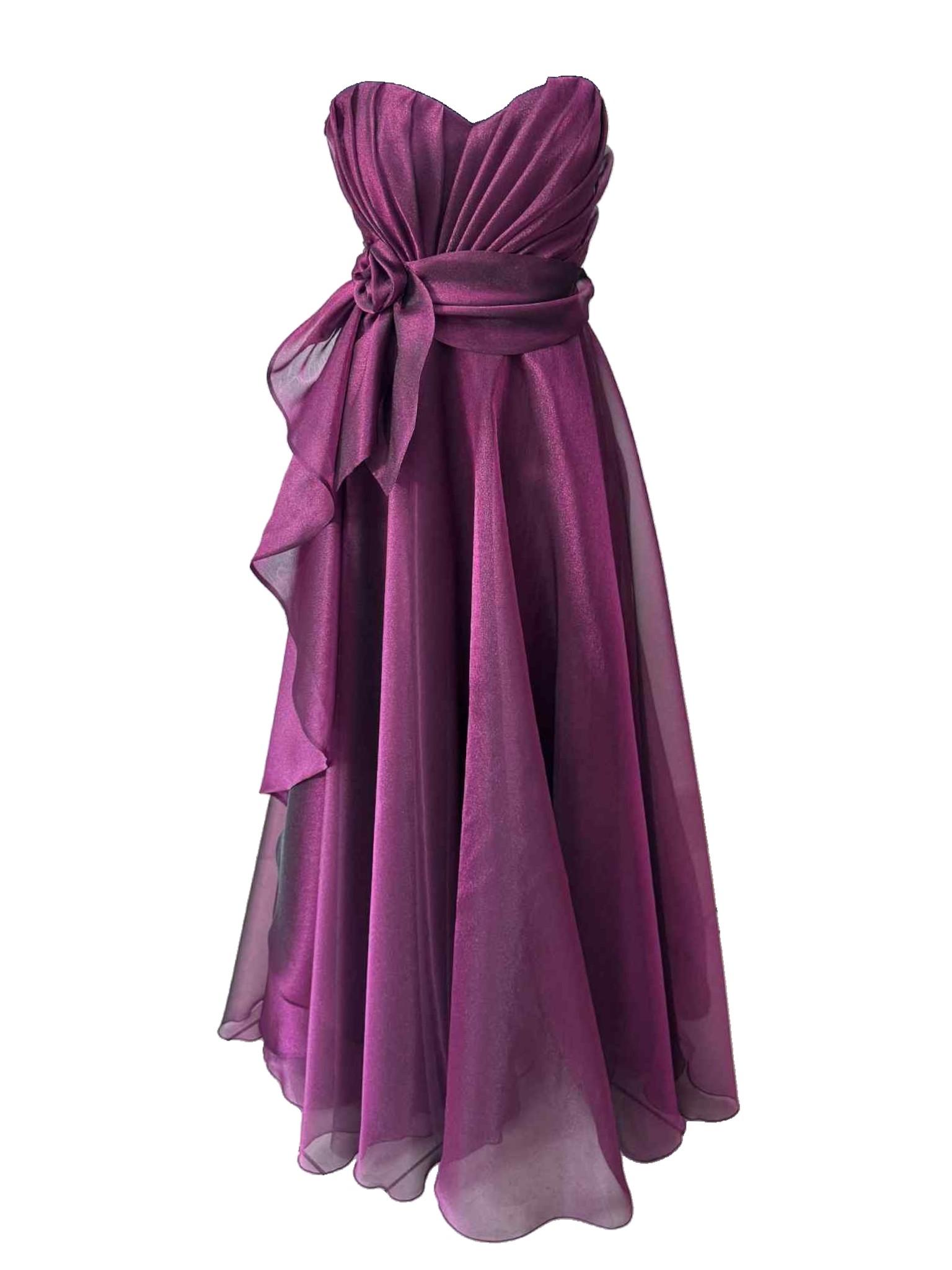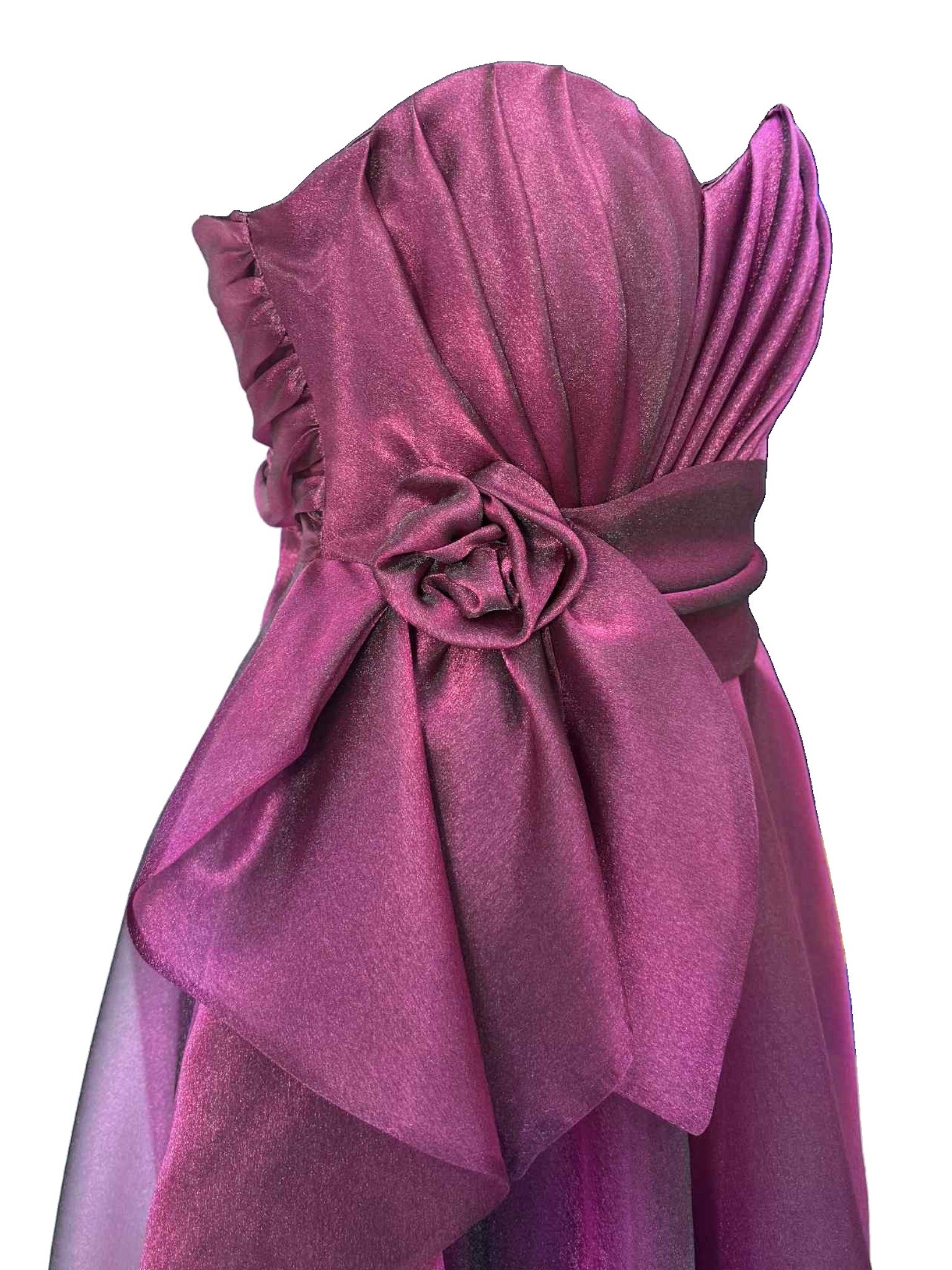 A romantic and sophisticated dress, made from lightweight iridescent burgundy organza, which captures the light with delicate, enveloping reflections. The soft, flowing line adds movement and grace with every step. The bodice features an elegant sweetheart neckline that enhances the décolleté, while a refined tone-on-tone fabric flower, positioned on the side, adds a feminine and sophisticated touch. Perfect for ceremonies, evening events or special occasions when you want to feel unique.