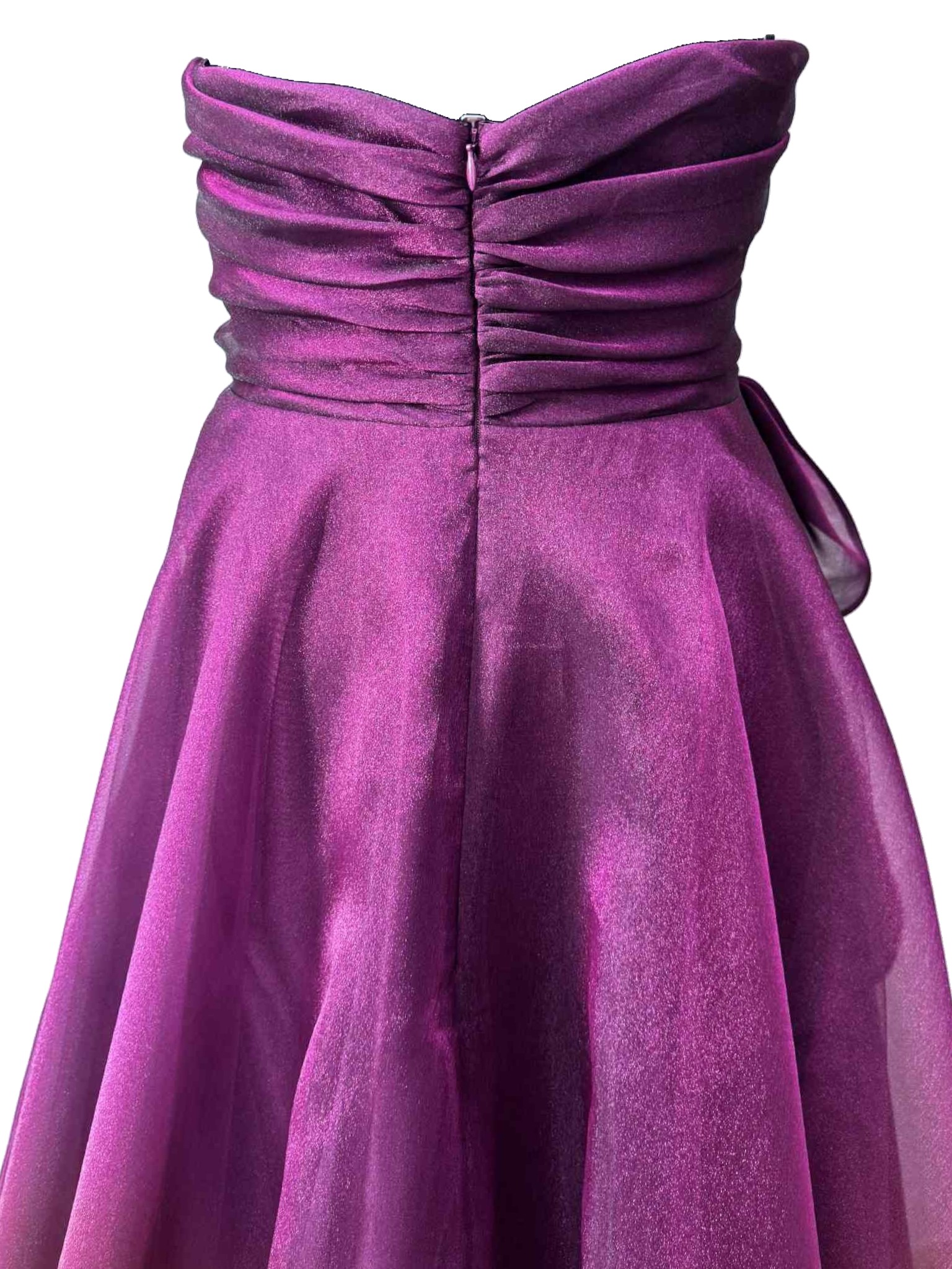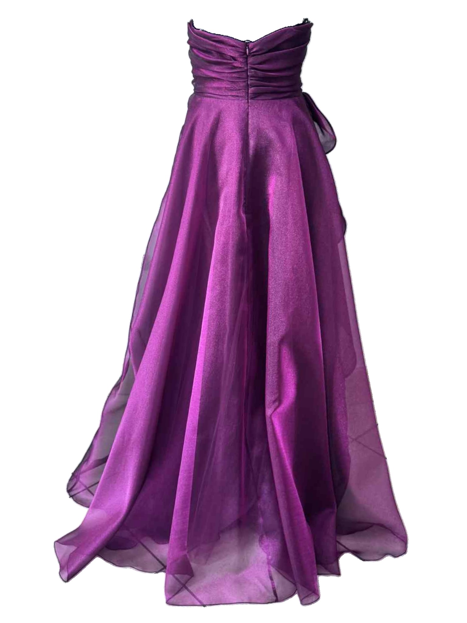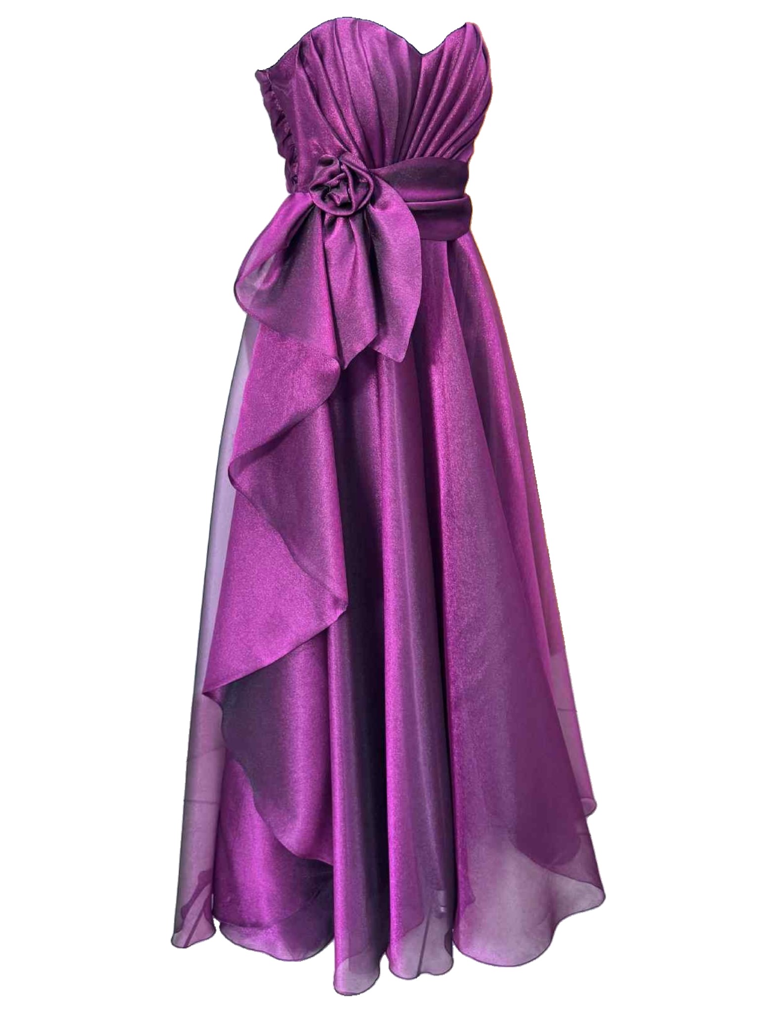 A romantic and sophisticated dress, made from lightweight iridescent burgundy organza, which captures the light with delicate, enveloping reflections. The soft, flowing line adds movement and grace with every step. The bodice features an elegant sweetheart neckline that enhances the décolleté, while a refined tone-on-tone fabric flower, positioned on the side, adds a feminine and sophisticated touch. Perfect for ceremonies, evening events or special occasions when you want to feel unique.