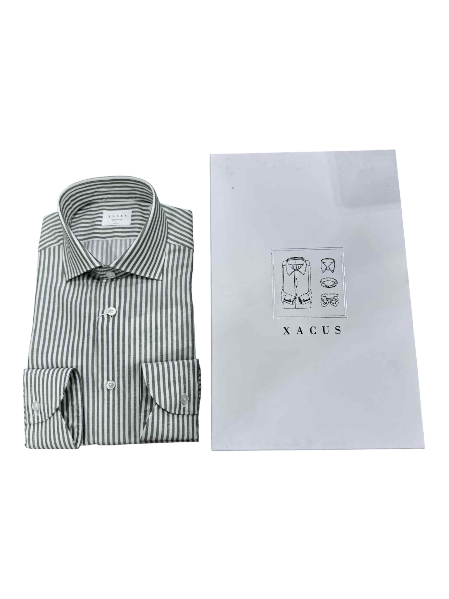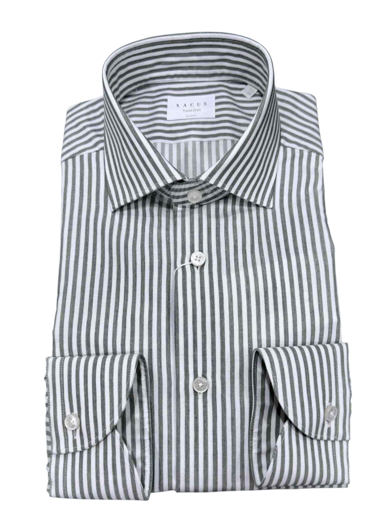 The Xacus travel shirt is designed for the dynamic man who wants to look elegant even when traveling. Featuring a refined green and white vertical stripe pattern, this shirt offers timeless style with a tailored fit that flatters the figure while maintaining maximum comfort. The classic collar and rounded buttoned cuffs express typical Italian tailoring, while the easy-care technical fabric ensures breathability, wrinkle resistance, and ease of care. It's the ideal choice for those who want to face every day with style, practicality, and a touch of class.