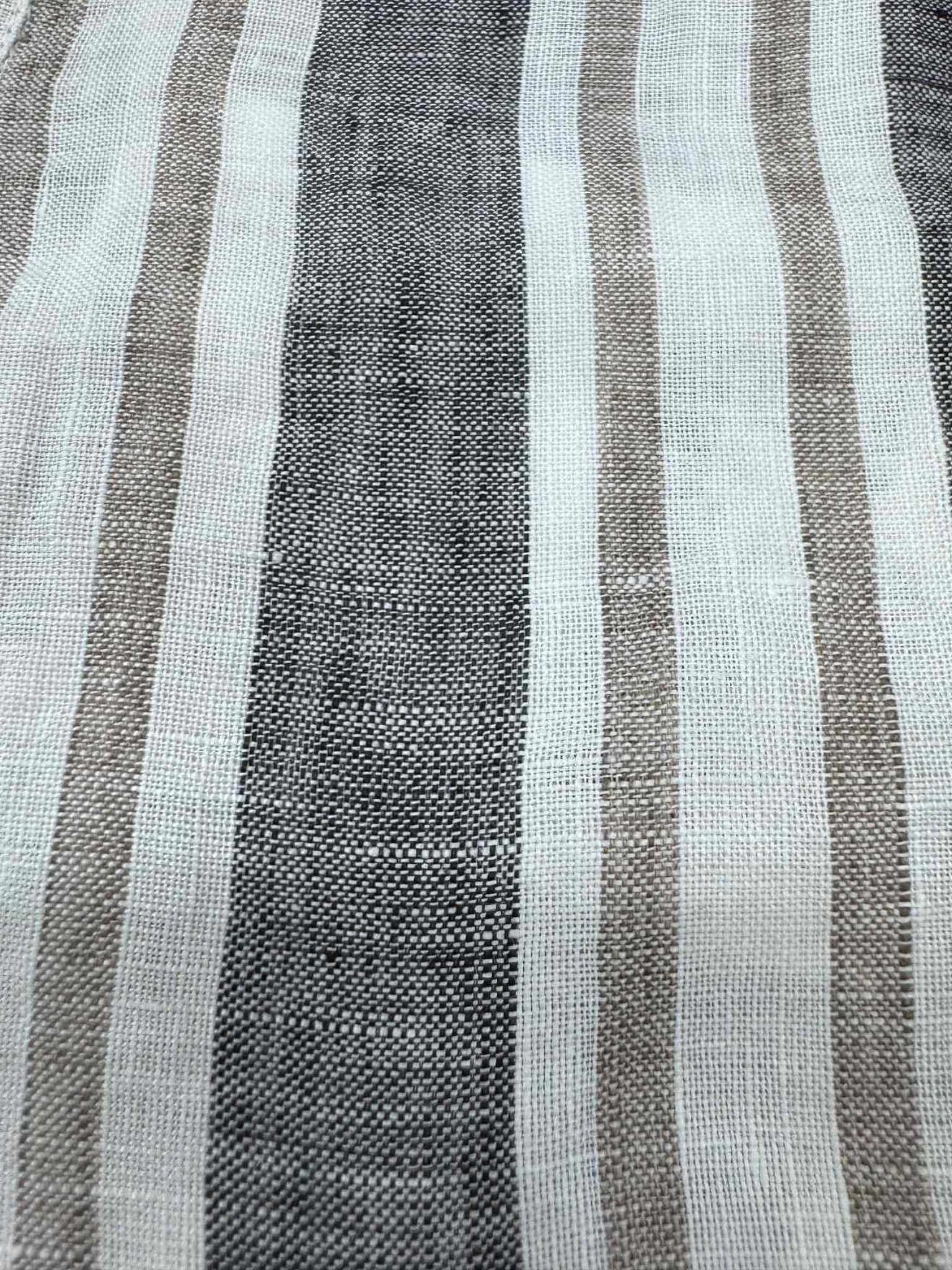 Linen shirt, light and breathable, embellished with a wide and thin striped motif on a light background that recalls refined summer atmospheres. The alternation of the stripes, well balanced and never excessive, gives dynamism to the garment while maintaining a natural and discreet elegance. The linen, with its fresh and textured texture, guarantees comfort even on the hottest days, making it an ideal choice for those who prefer a neat but relaxed style. Perfect to wear outside trousers or slightly open over a T-shirt, this shirt is designed to accompany every moment of the summer season with ease.