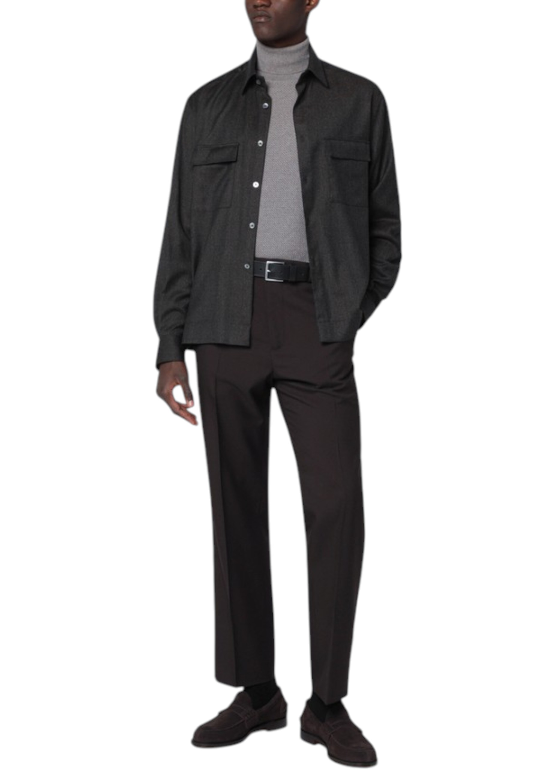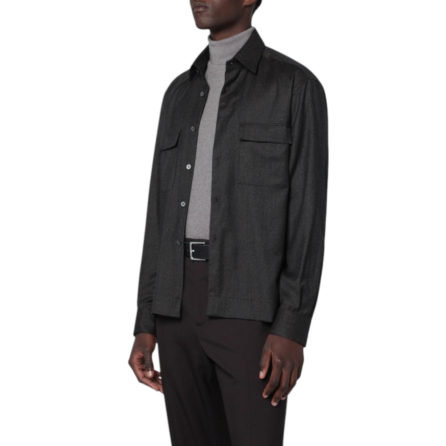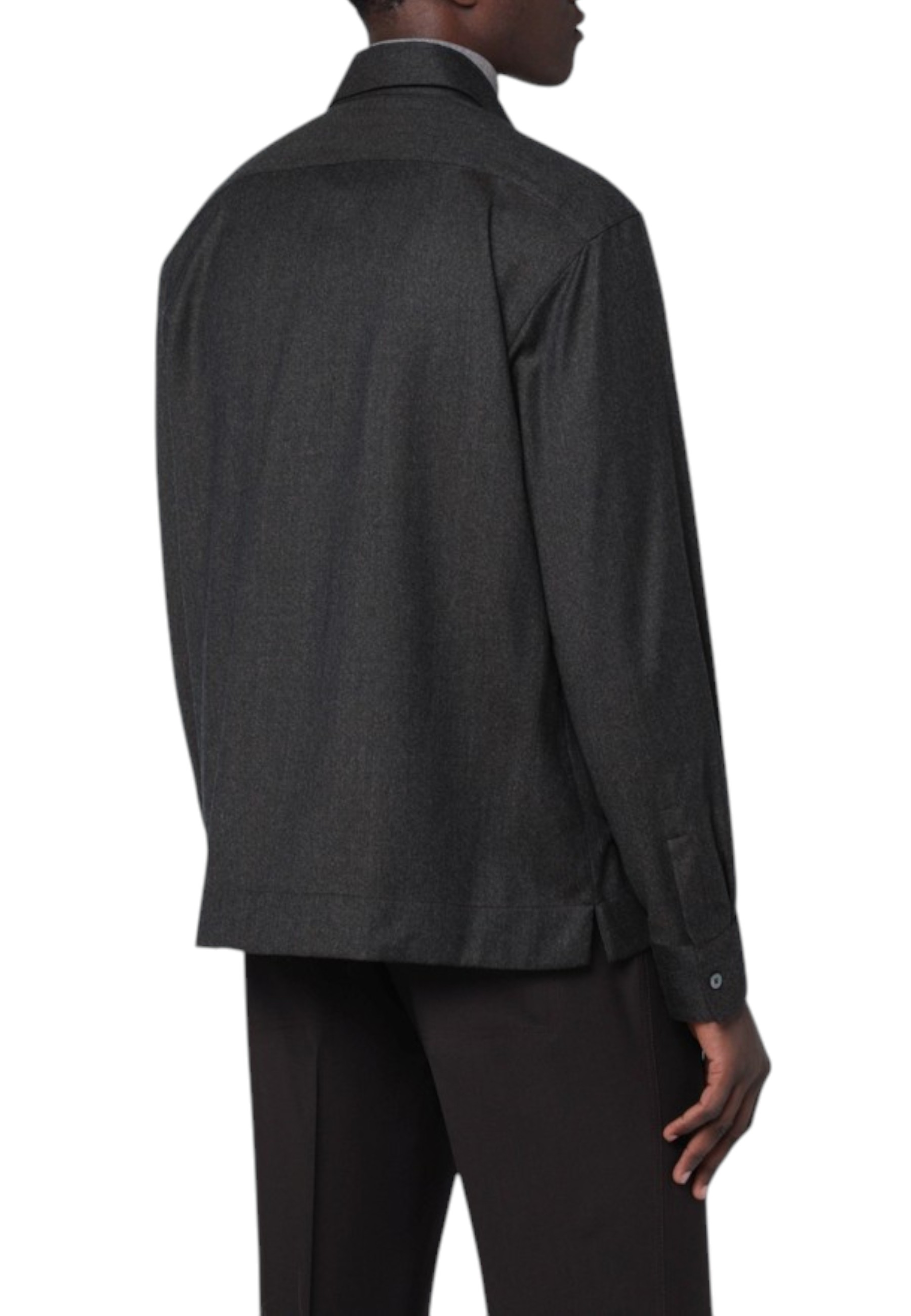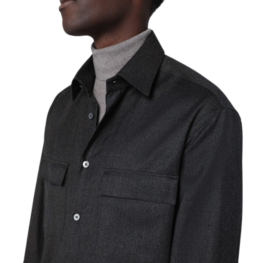 Xacus virgin wool shirt with long sleeves and buttoned cuffs, two flap pockets on the chest, front button closure, side slits, straight hem and Italian collar.