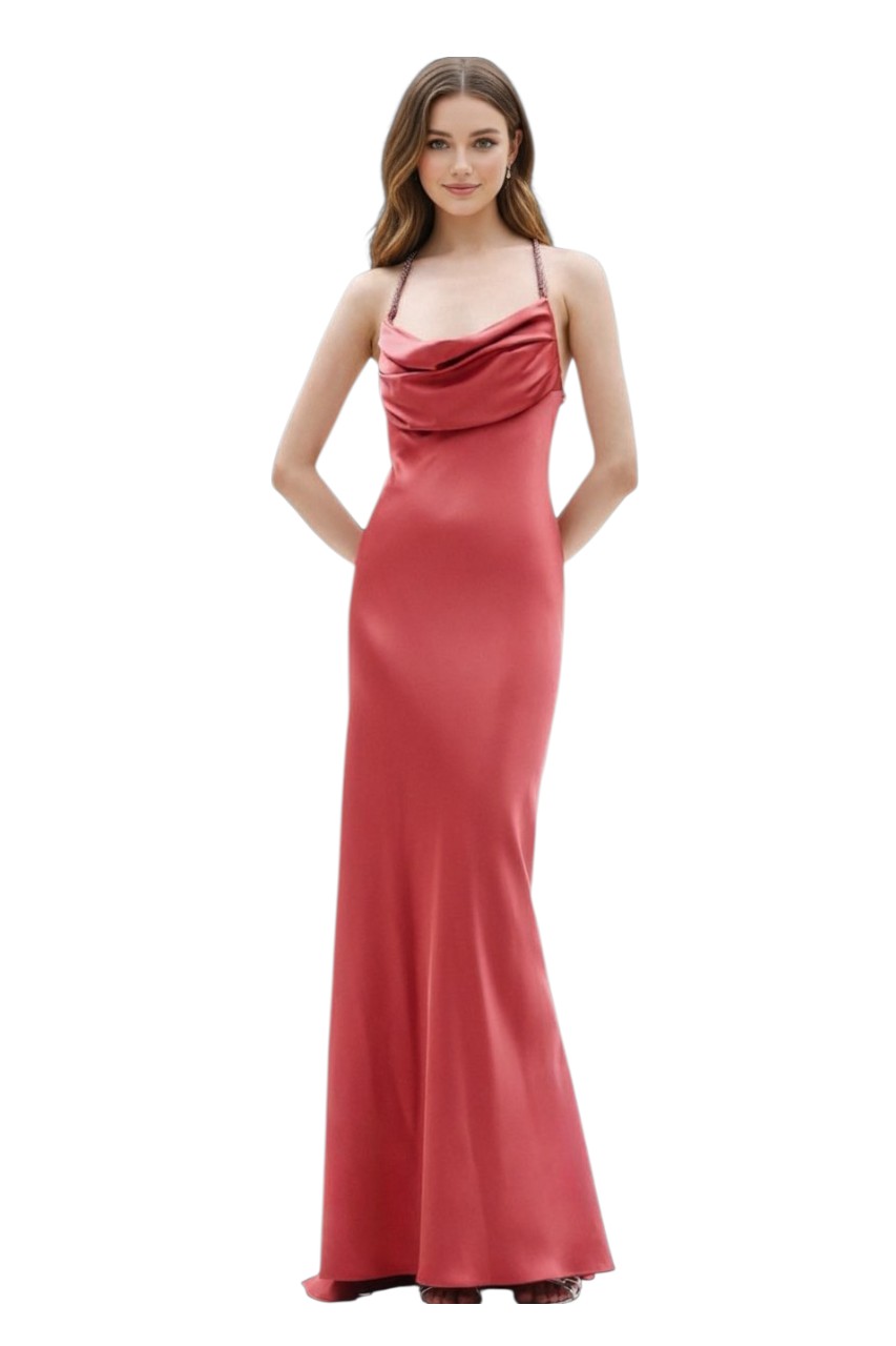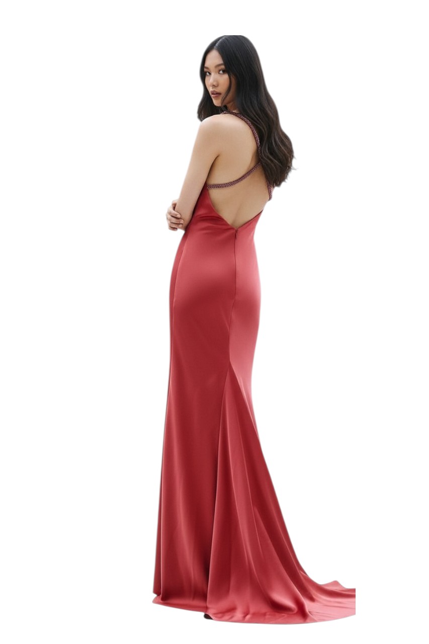 Elegante abito lungo dalla linea scivolata, pensato per valorizzare la silhouette con semplicità e raffinatezza. Il modello presenta un delicato scollo a bicchiere, che esalta il décolleté con eleganza.