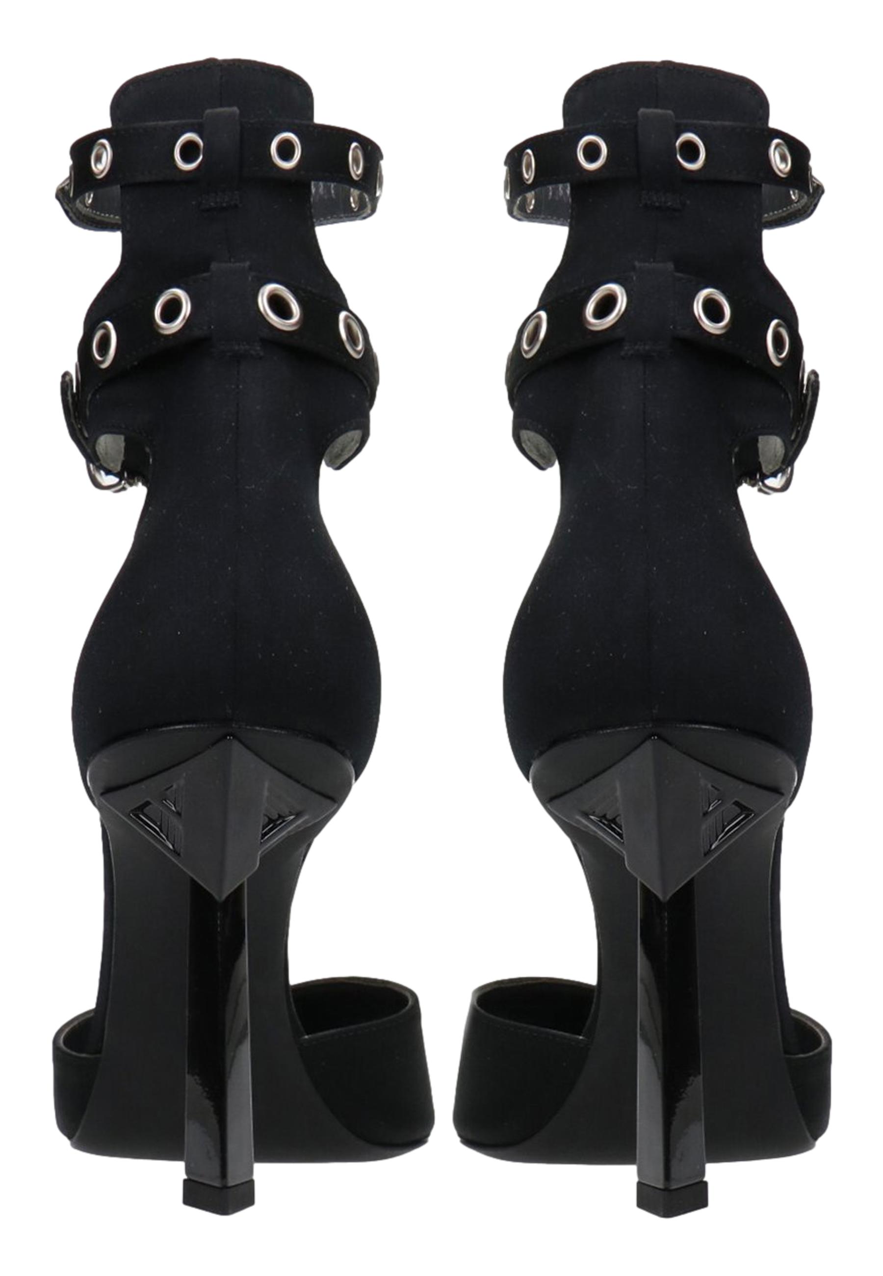 Scarpa in raso con punta sfilata e cinturini regolabili alla caviglia. Tacco sagomato