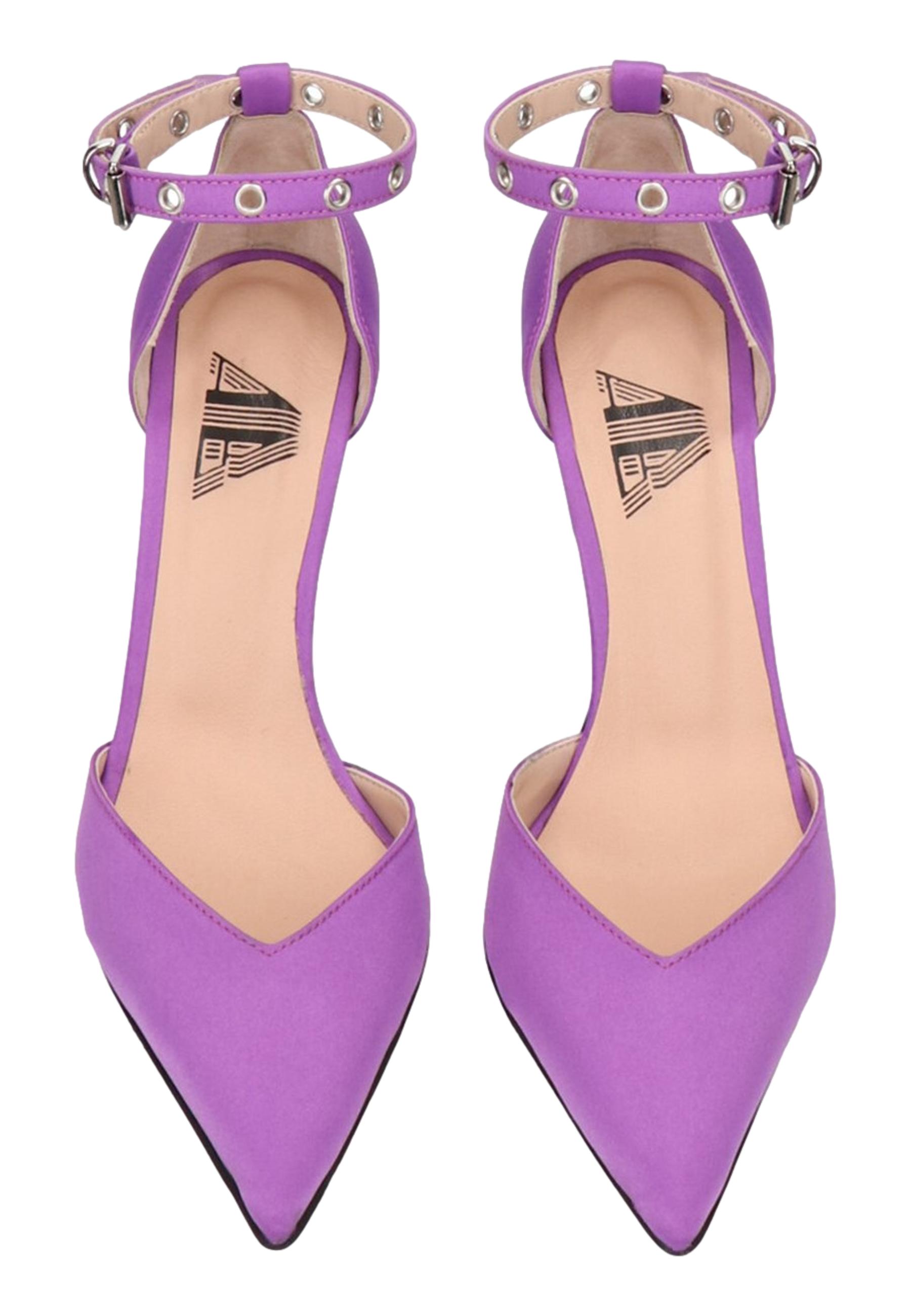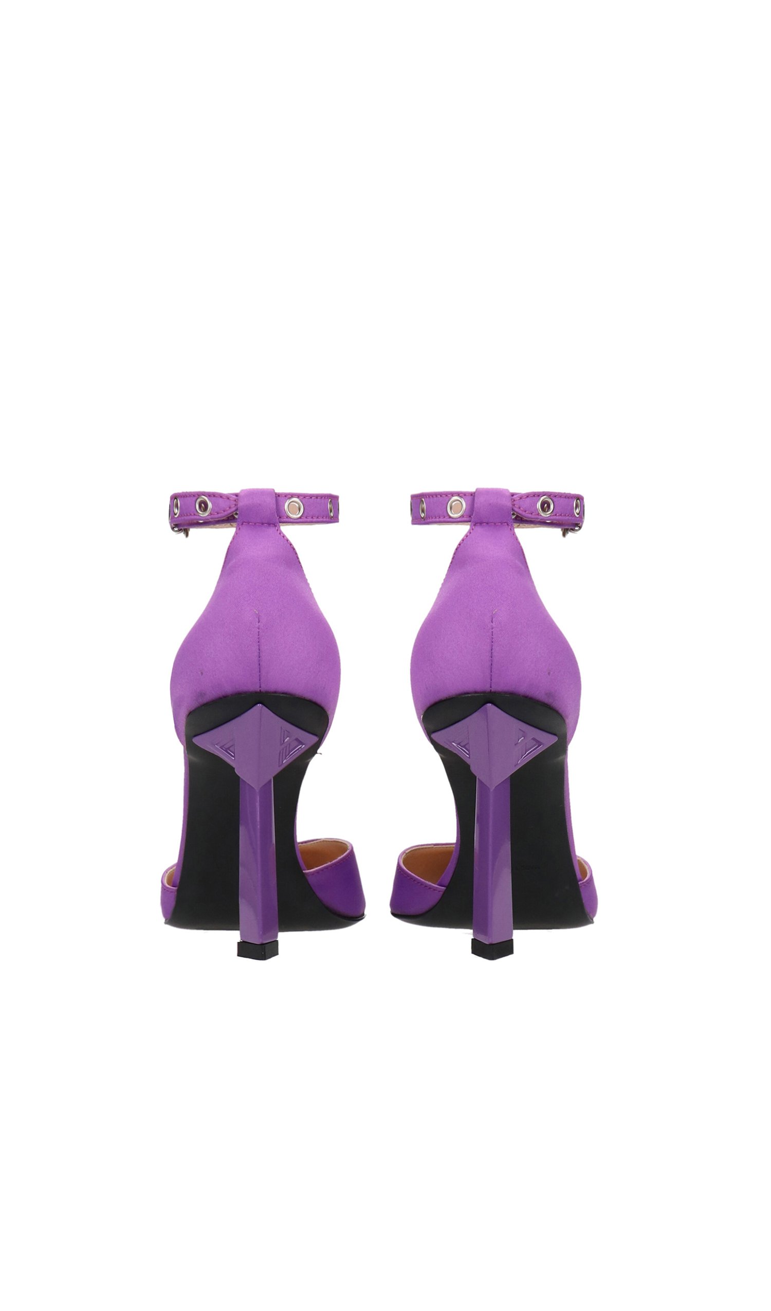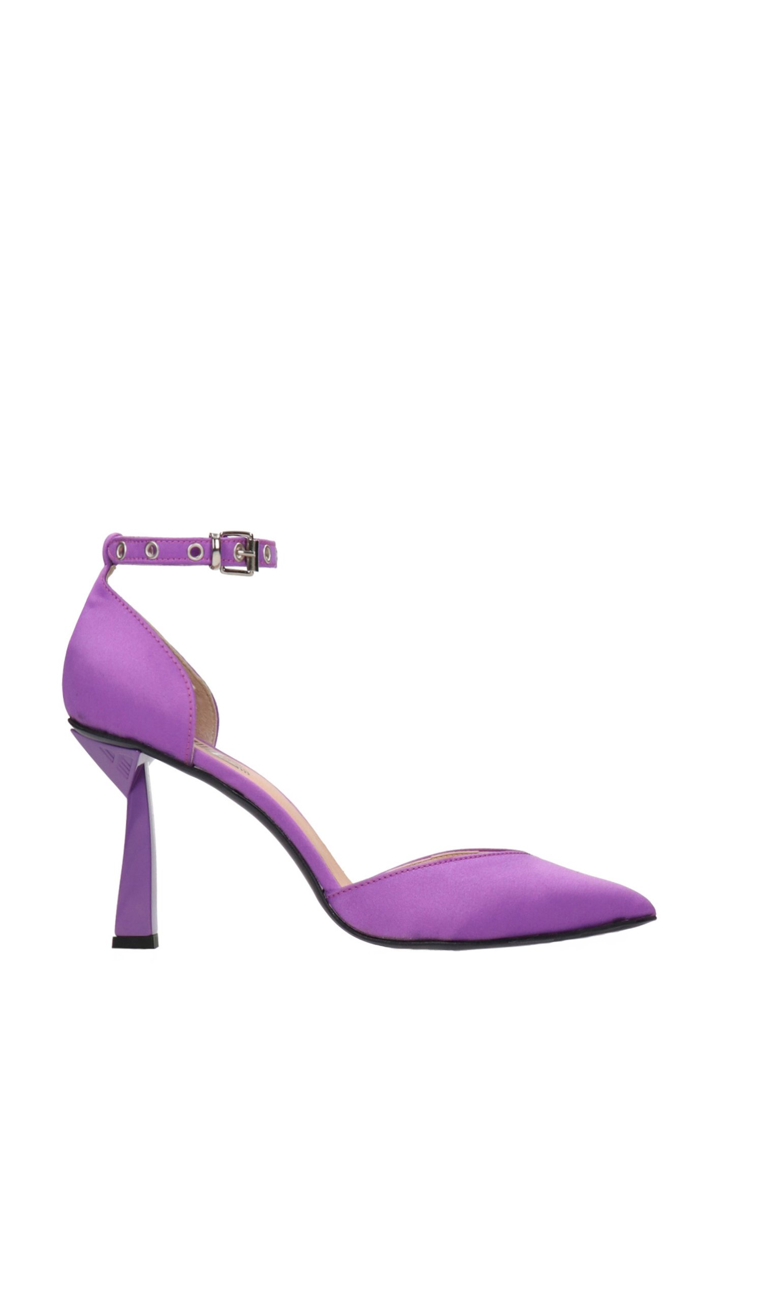 Scarpa in raso con punta sfilata e cinturino regolabile alla caviglia. Tacco sagomato.