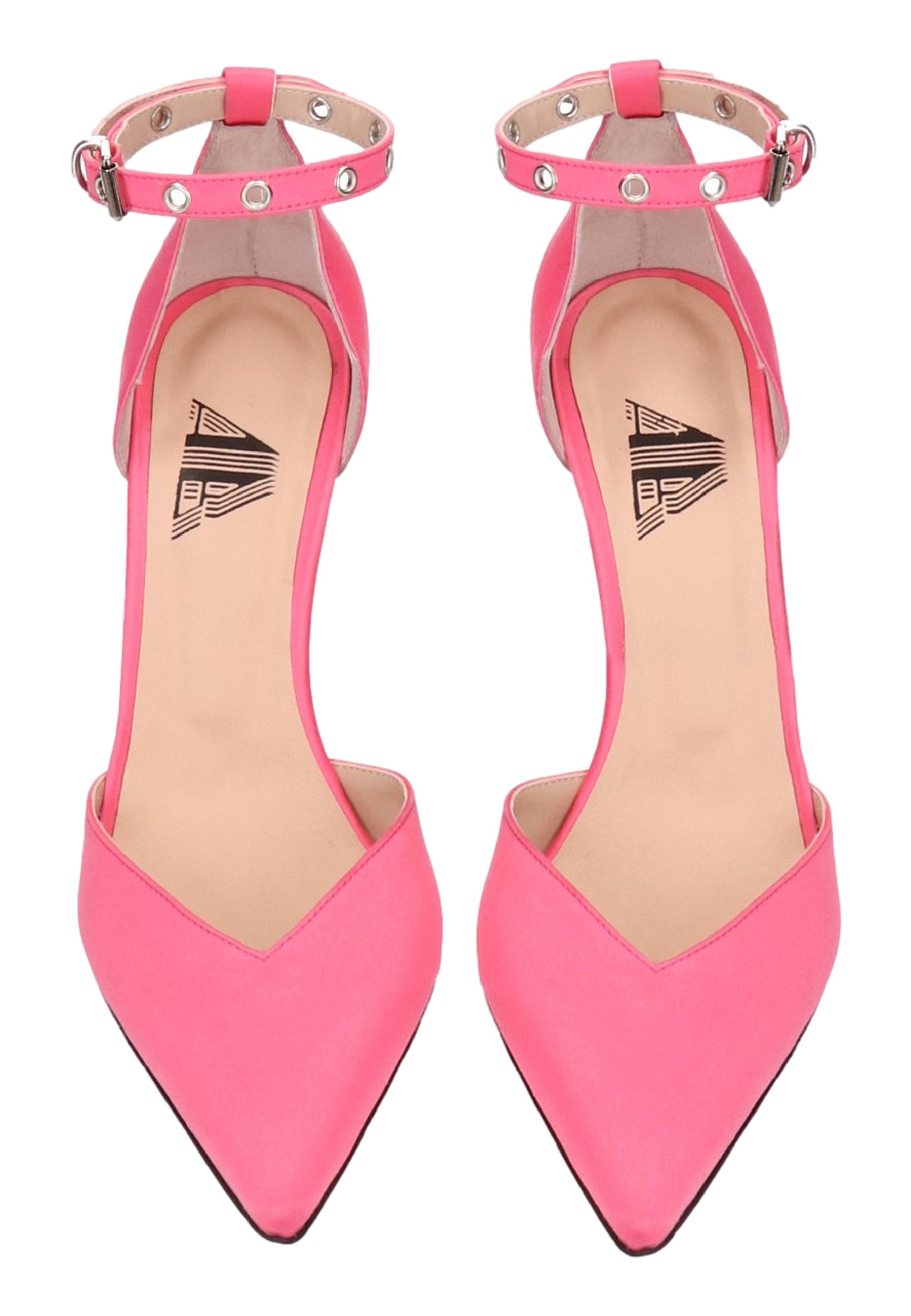 Scarpa in raso con punta sfilata e cinturino regolabile alla caviglia. Tacco sagomato.