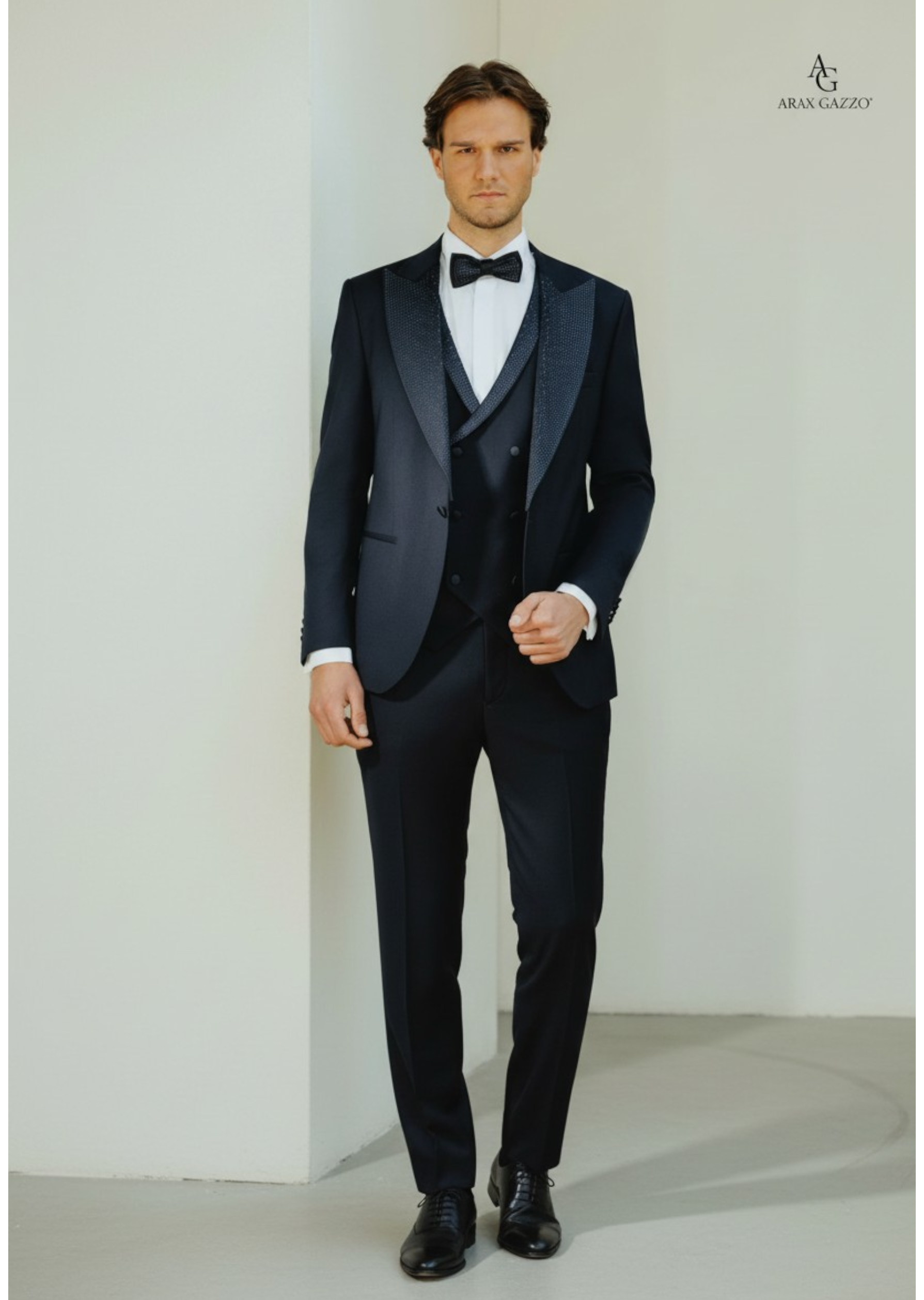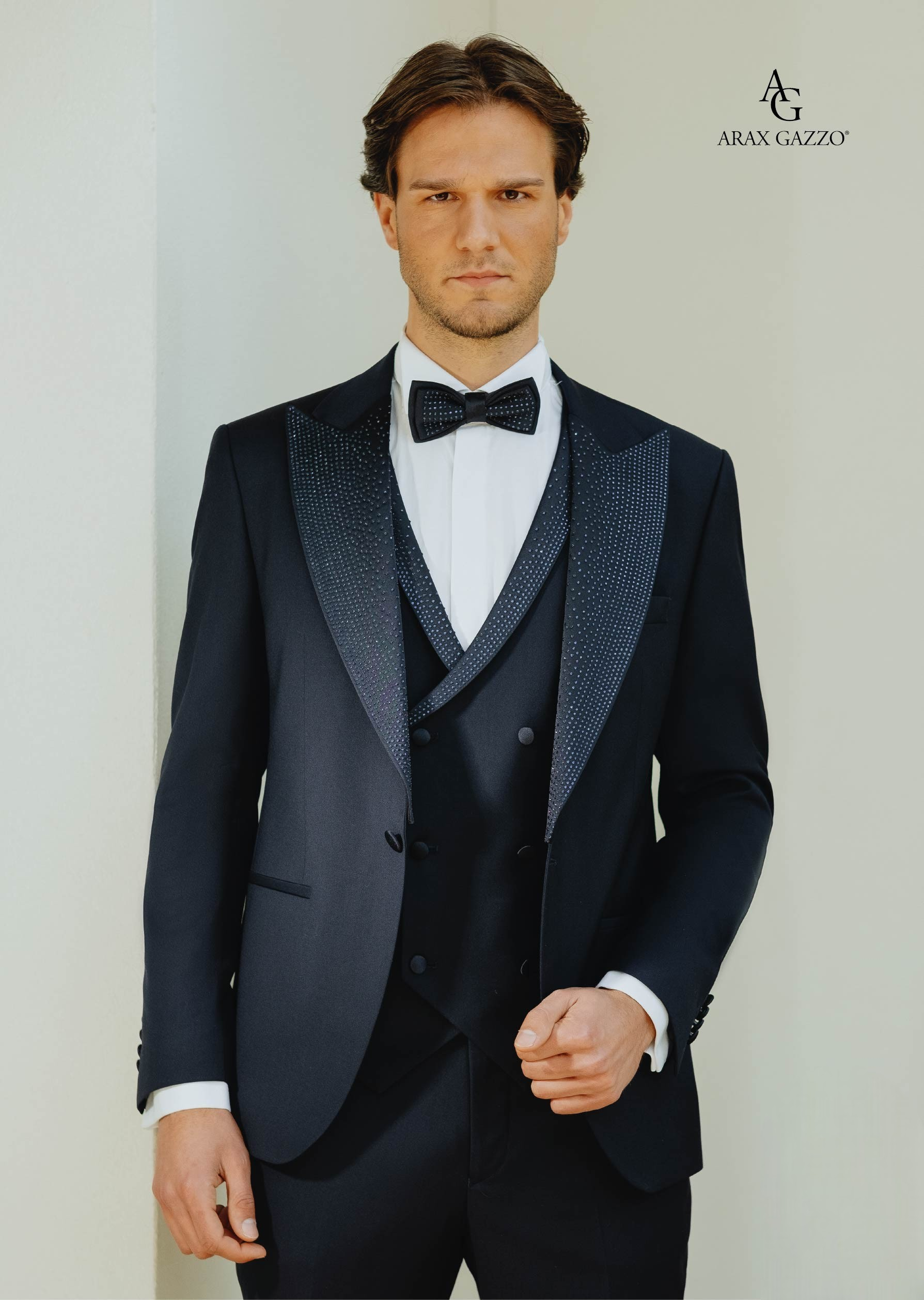 A completare il look troviamo un gilet doppiopetto coordinato, impreziosito da un bordo con strass che richiama i dettagli luminosi della giacca, e un elegante papillon con strass, perfetto per un outfit armonioso e di grande impatto.