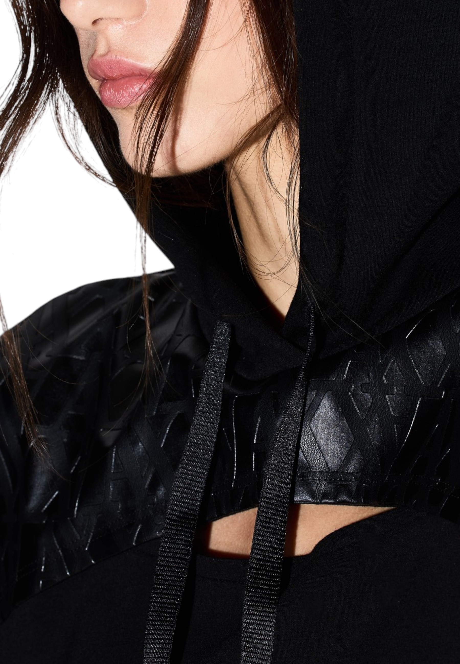 La felpa cropped Armani Exchange con cappuccio combina stile contemporaneo e carattere sportivo in un design unico e femminile. Realizzata in morbido tessuto, presenta maniche lunghe con polsini e un fondo a costine che assicurano comfort e vestibilità. L'inserto frontale con motivo logo goffrato aggiunge un tocco distintivo, mentre il dettaglio cut-out sul davanti dona un accento moderno e audace. Il cappuccio con coulisse regolabile completa il look, rendendo questa felpa perfetta per outfit casual e streetwear di tendenza.