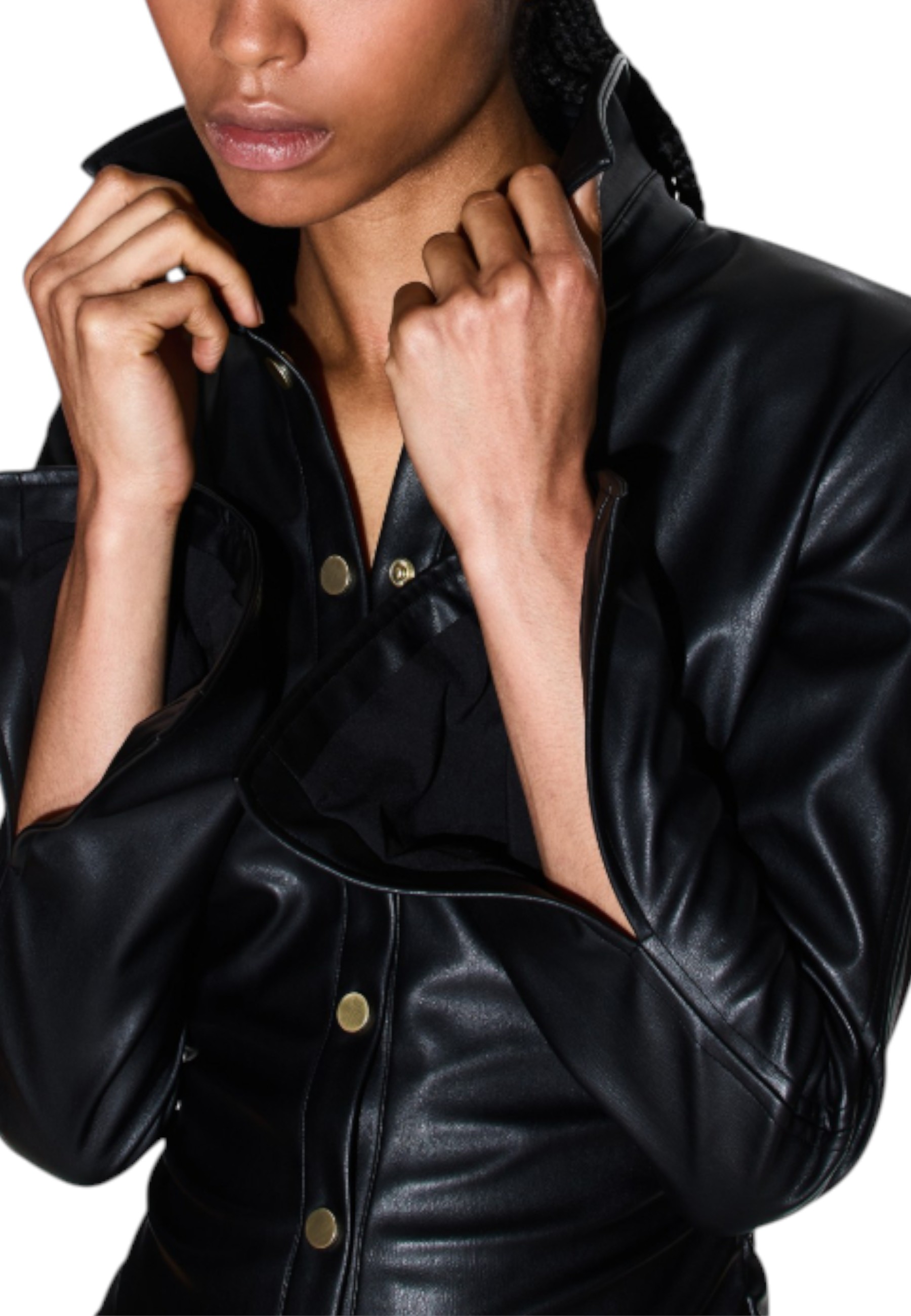 Abito corto realizzato in un materiale simile alla pelle, che offre una sensazione morbida e una finitura lucida, ideale per un look audace e contemporaneo. La sua silhouette versatile ispirata alla camicia la rende il pezzo perfetto per un'eleganza senza sforzo, adattabile a una varietà di occasioni.